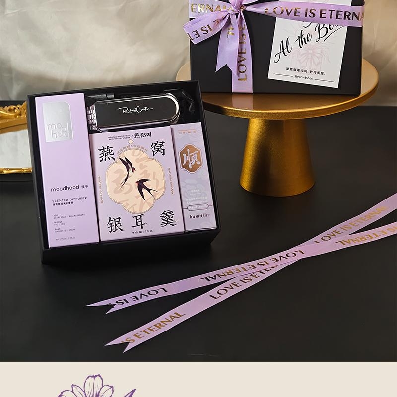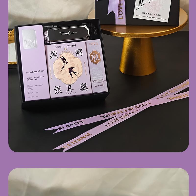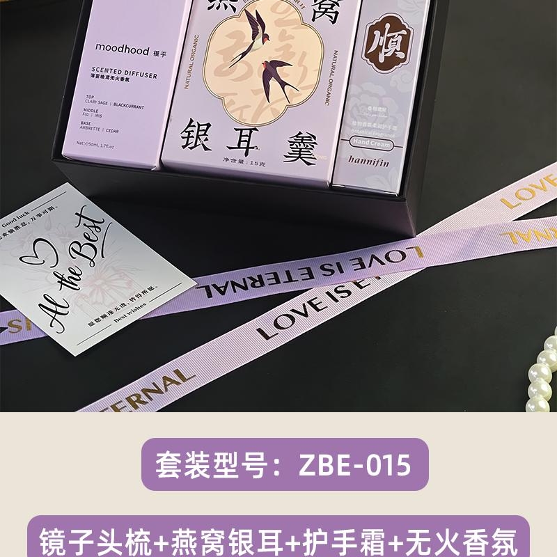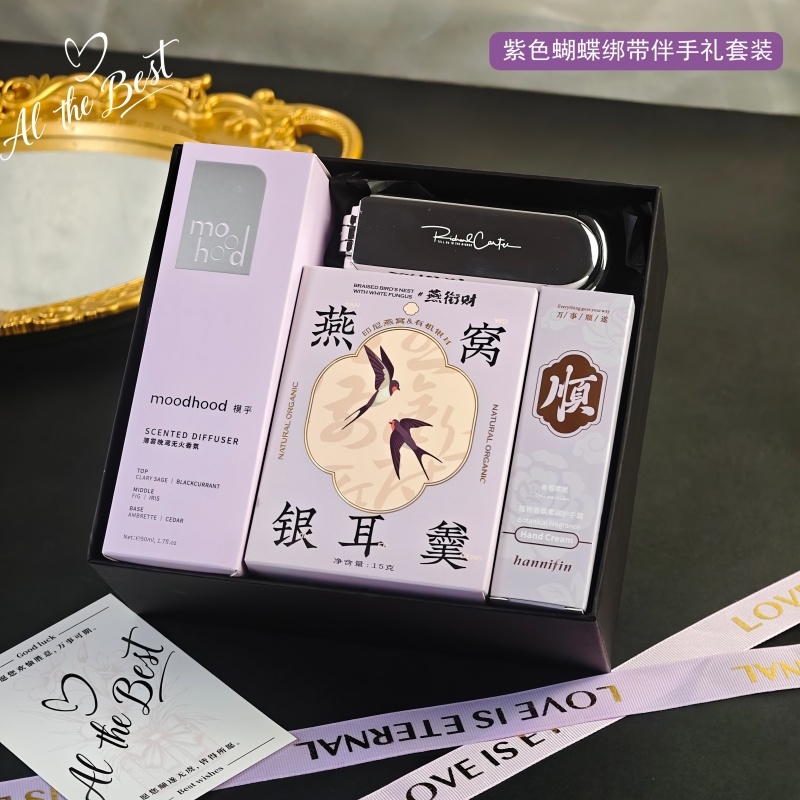 组合:镜子头梳、燕窝银耳羹15g、韩方莉护手霜35g、模乎无火香氛液50ml、紫色蝴蝶绑带礼盒+贺卡