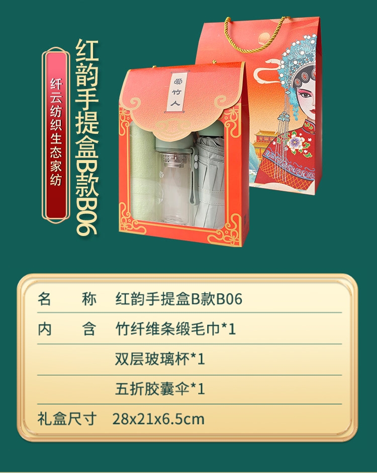 配置清单:竹纤维条缎毛巾*1 双层玻璃杯*1 五折胶囊伞*1