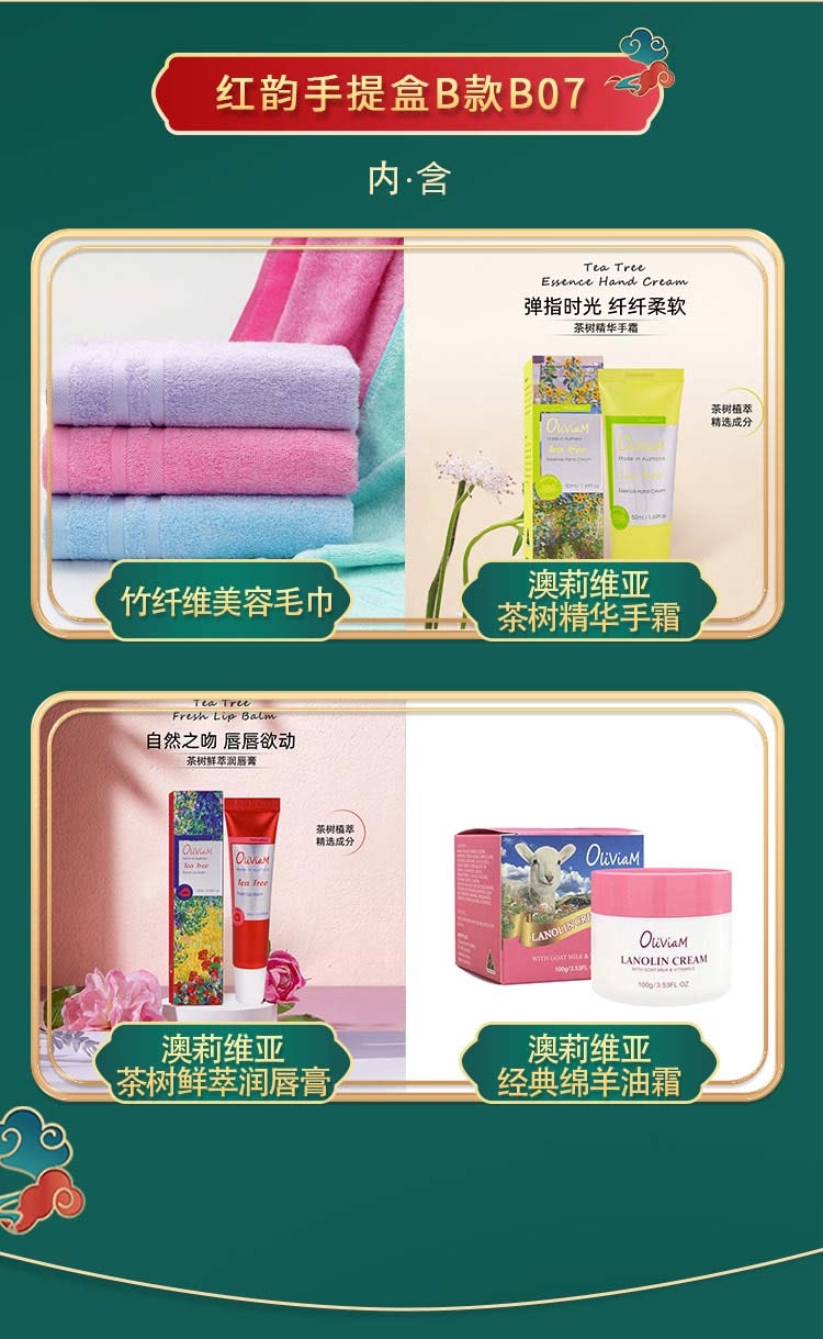 配置清单:澳莉维亚茶树精华手霜*1 澳莉维亚茶树鲜萃润唇膏*1 澳莉维亚经典绵羊油霜*1 竹纤维美容毛巾*2