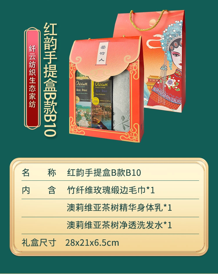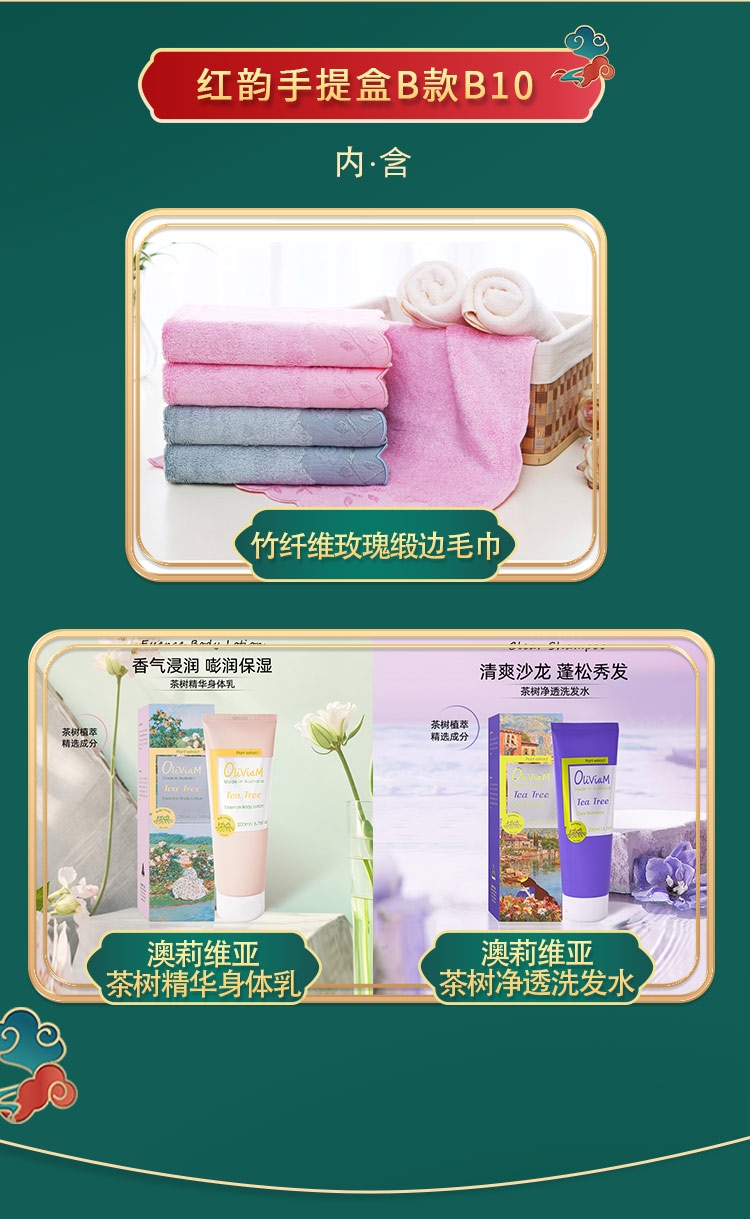 配置清单:澳莉维亚茶树净透洗发水*1 澳莉维亚茶树精华身体乳*1 竹纤维玫瑰缎边毛巾*1
