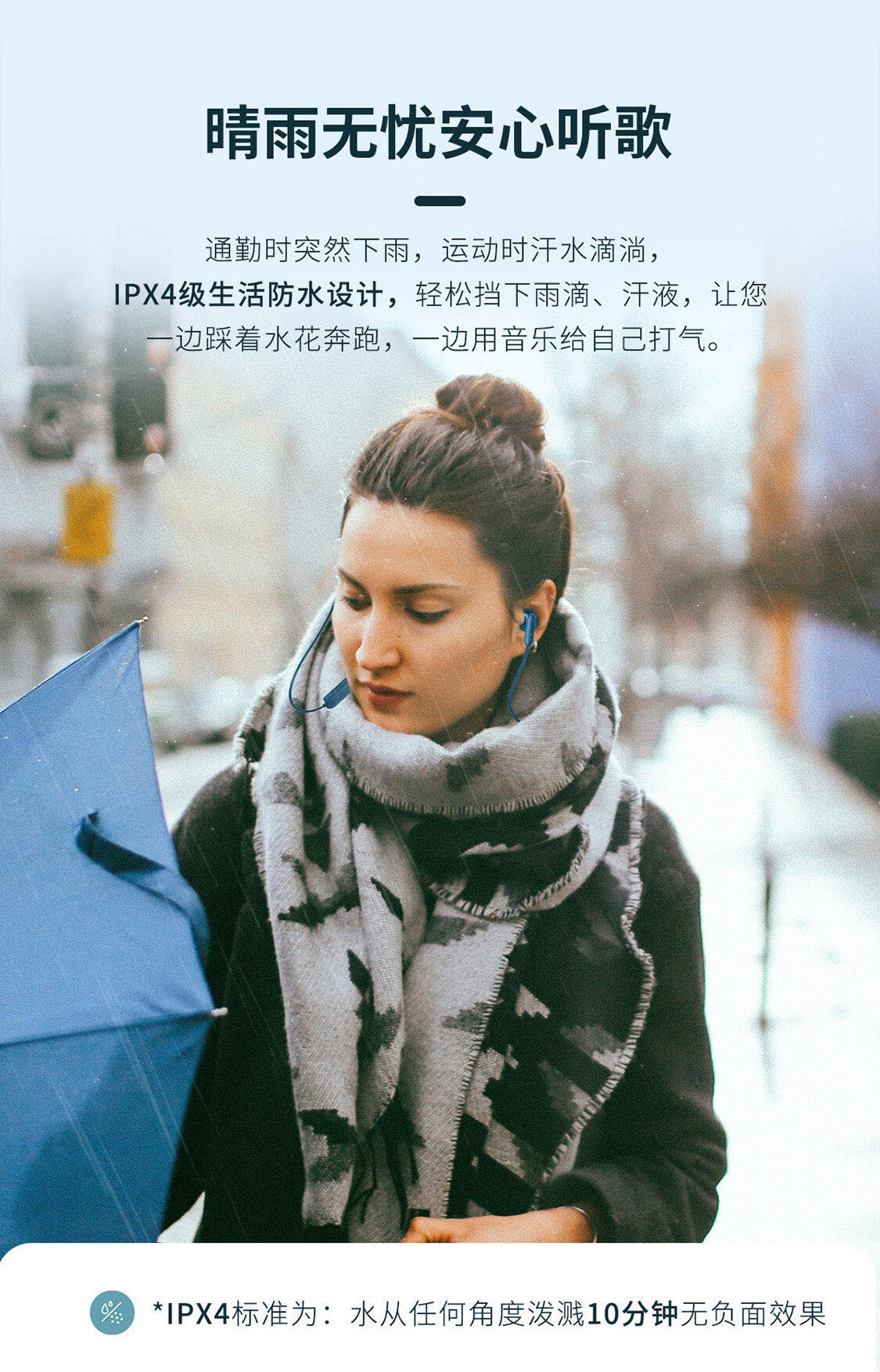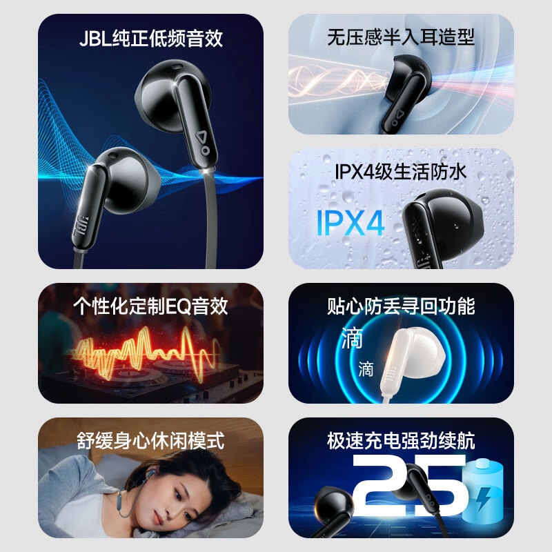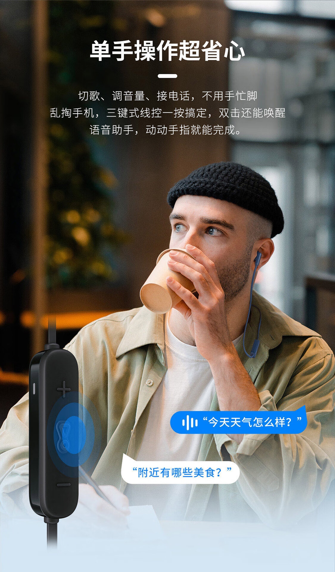 传奇音质 强劲低频;无压感半入耳造型;IPX4级生活防水;个性化定制EQ音效;贴心防丢寻回功能