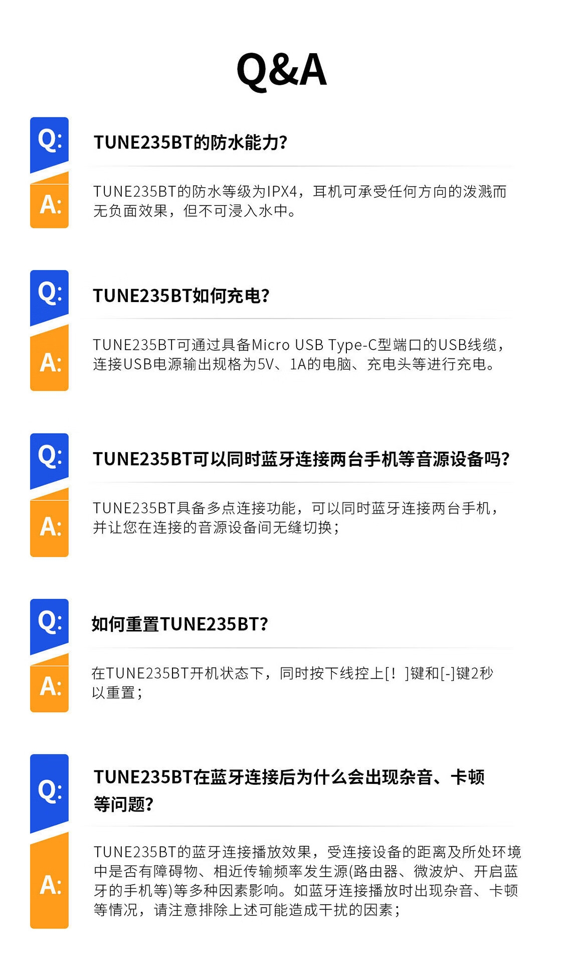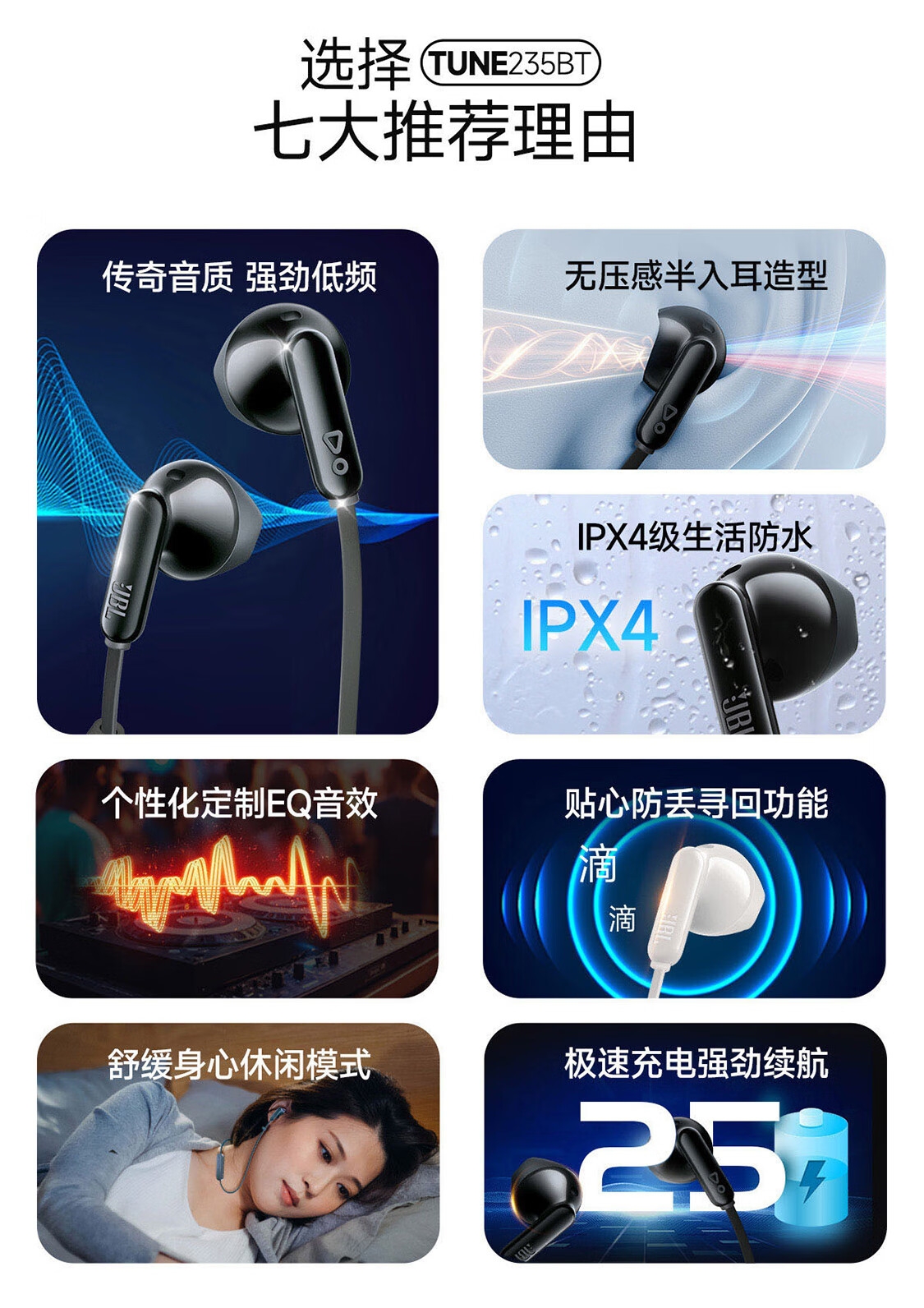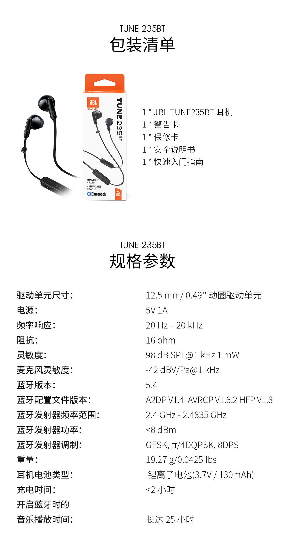 JBL 半入耳式颈挂式蓝牙耳机防水TUNE235BT