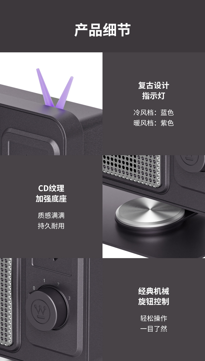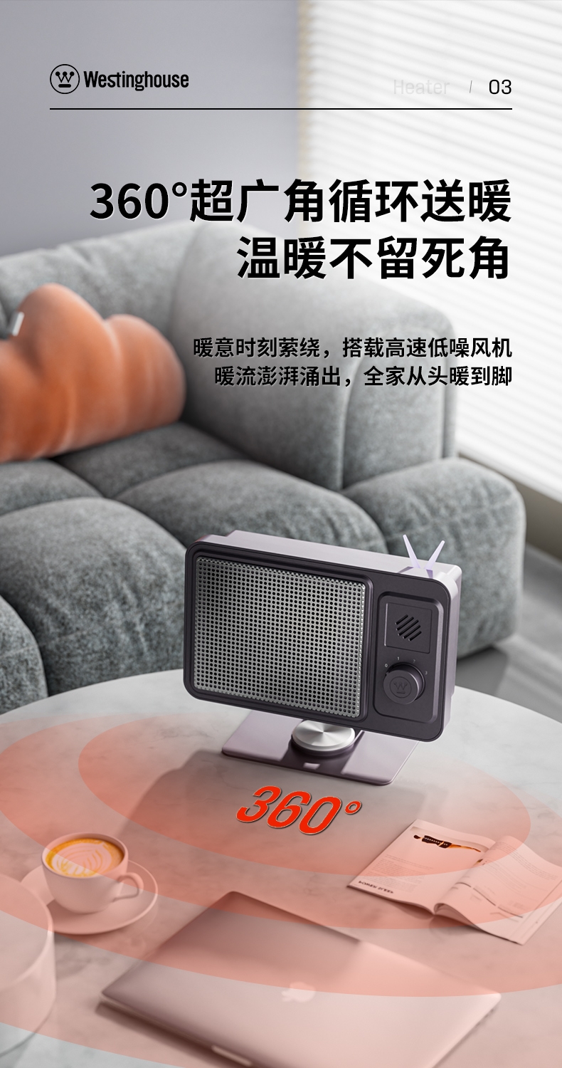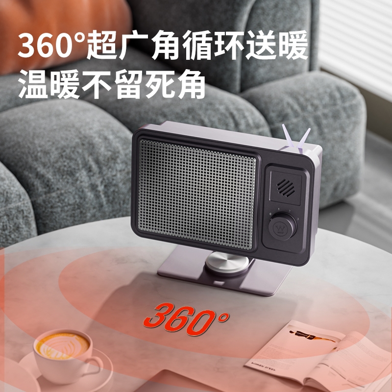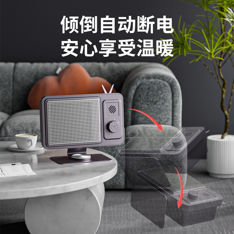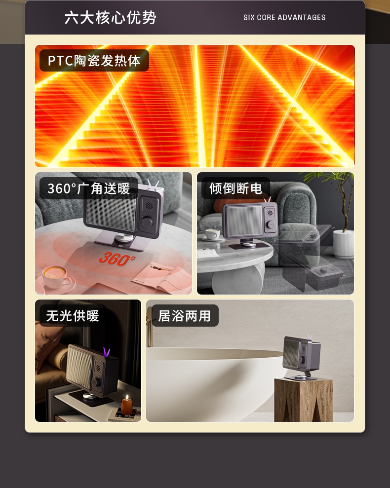 PTC陶瓷发热体;360°广角送暖;倾倒断电