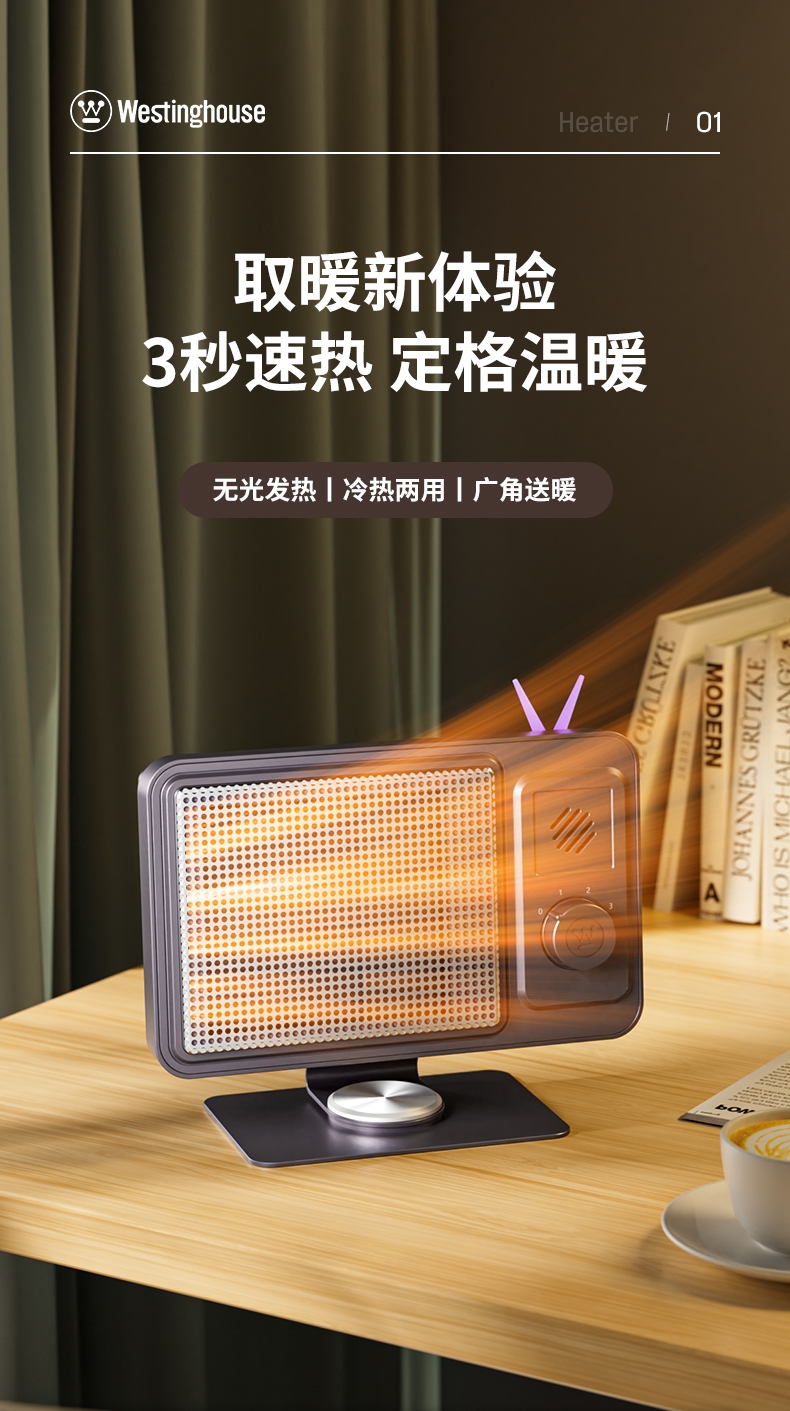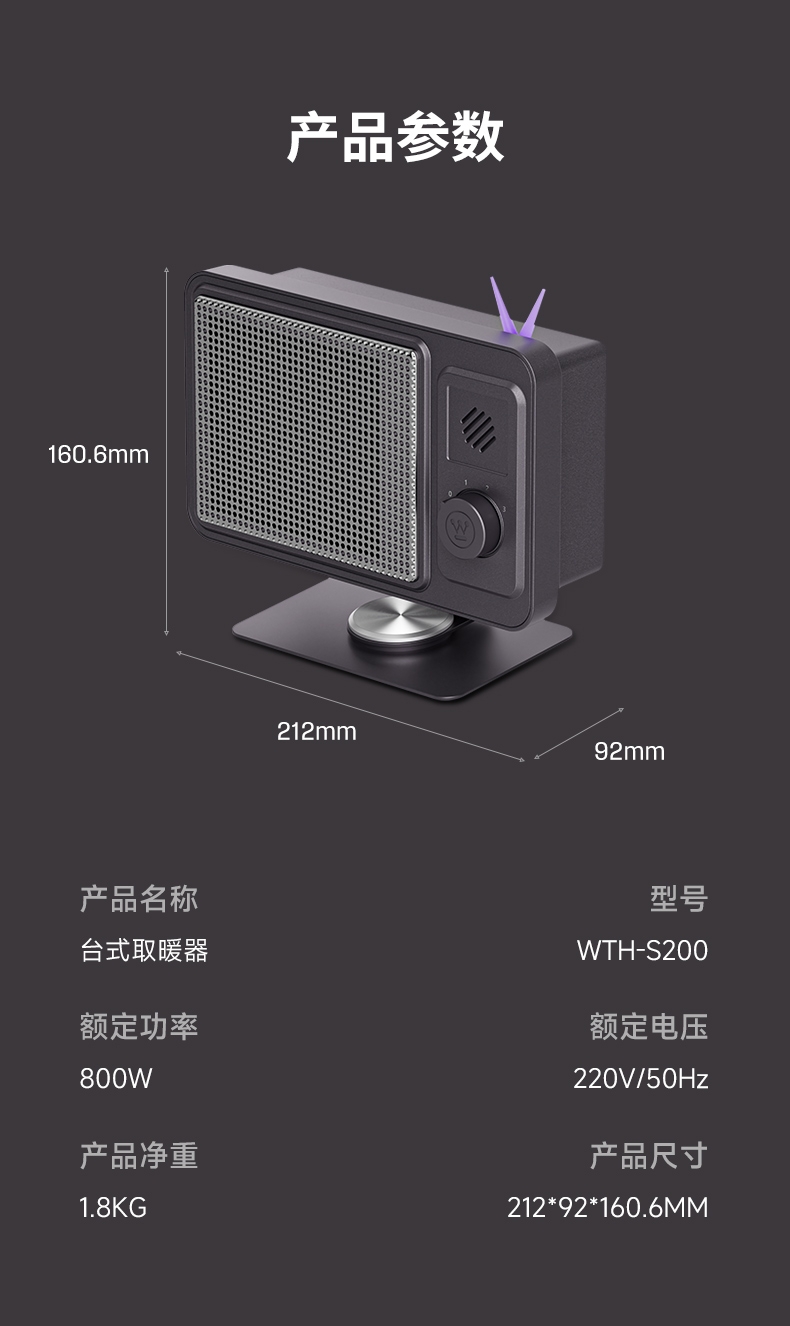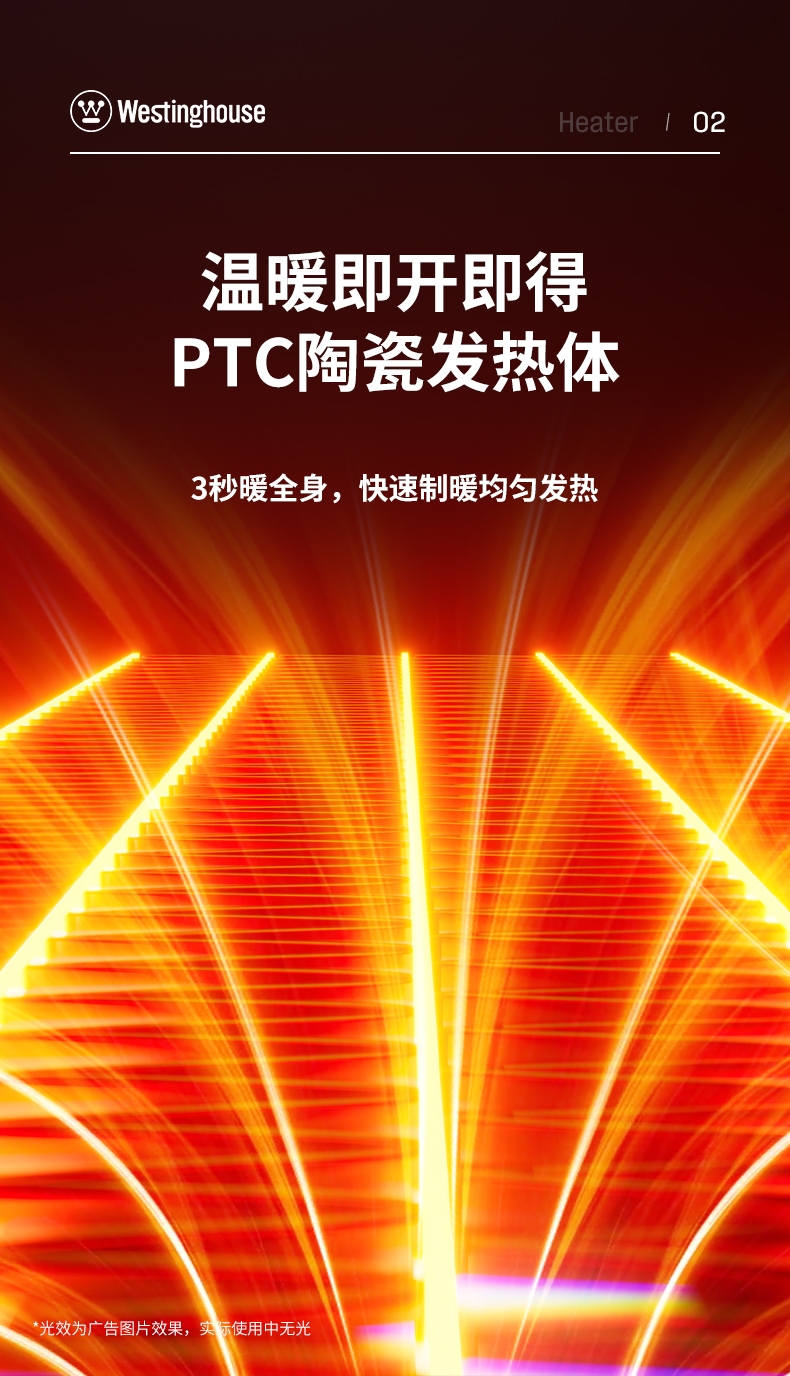PTC陶瓷发热体;360°广角送暖;倾倒断电