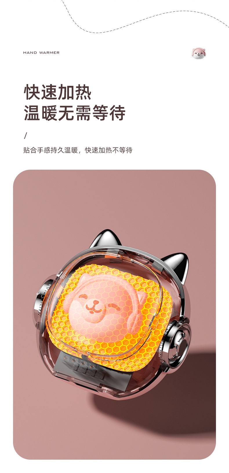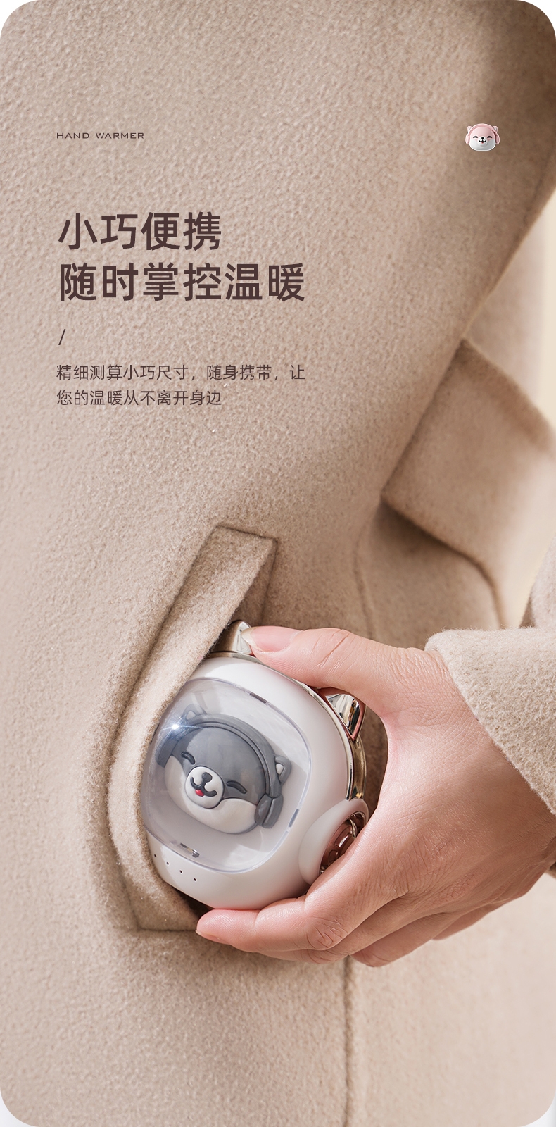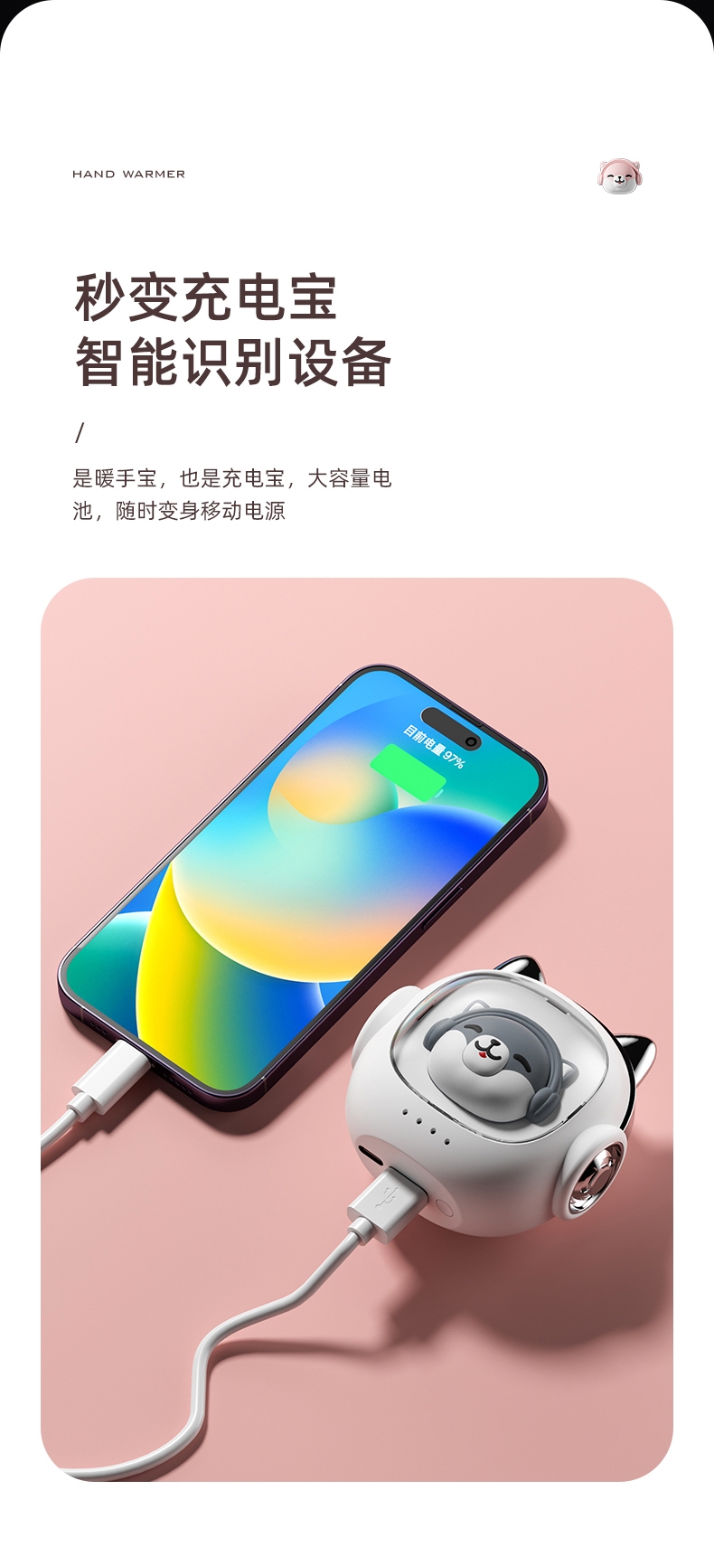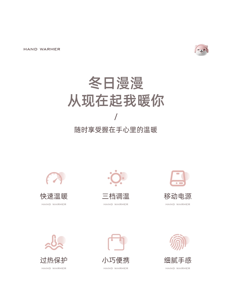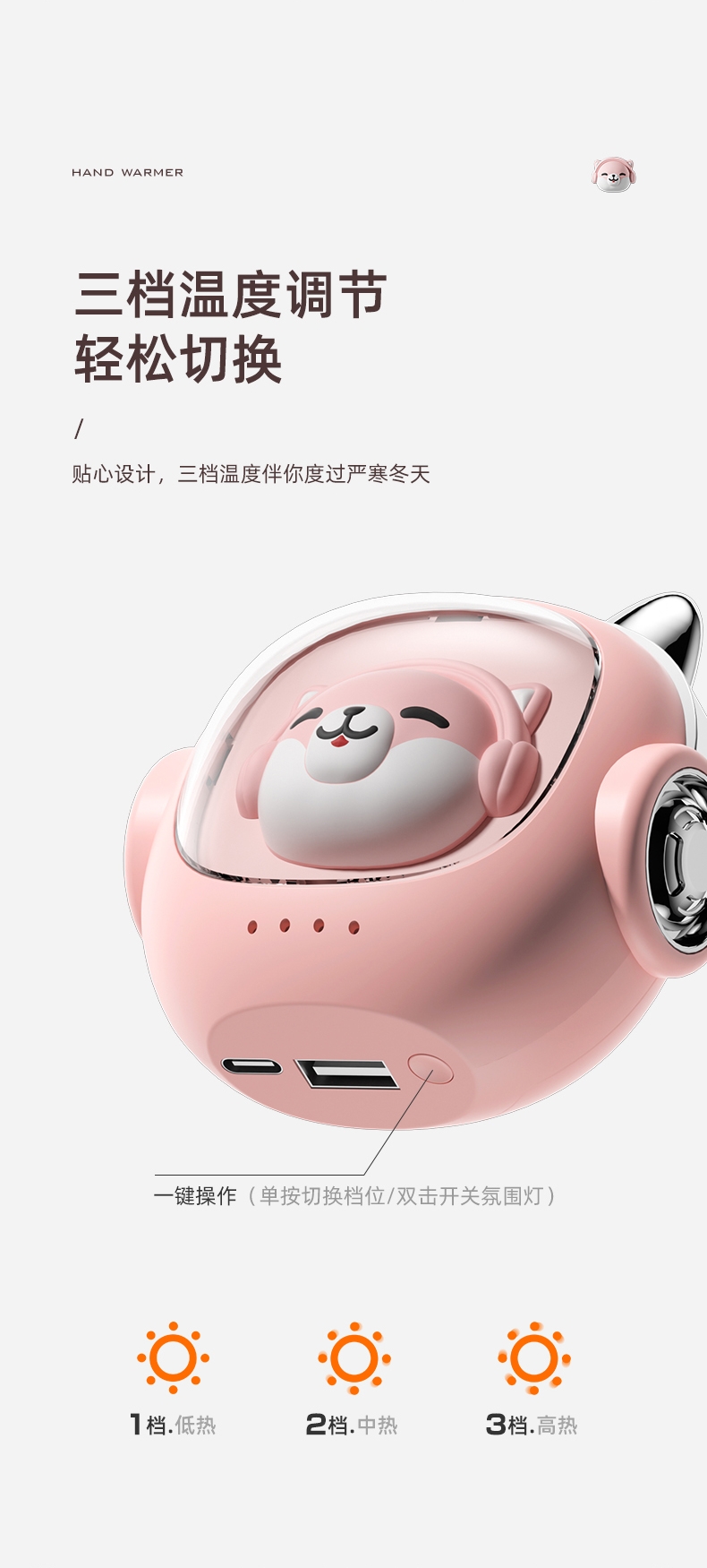 一键操作,三档温度调节;安全防爆,双重过热保护;即是暖手宝,又是充电宝;小夜灯设计,氛围感拉满;1800mAh大容量电池,超长续航