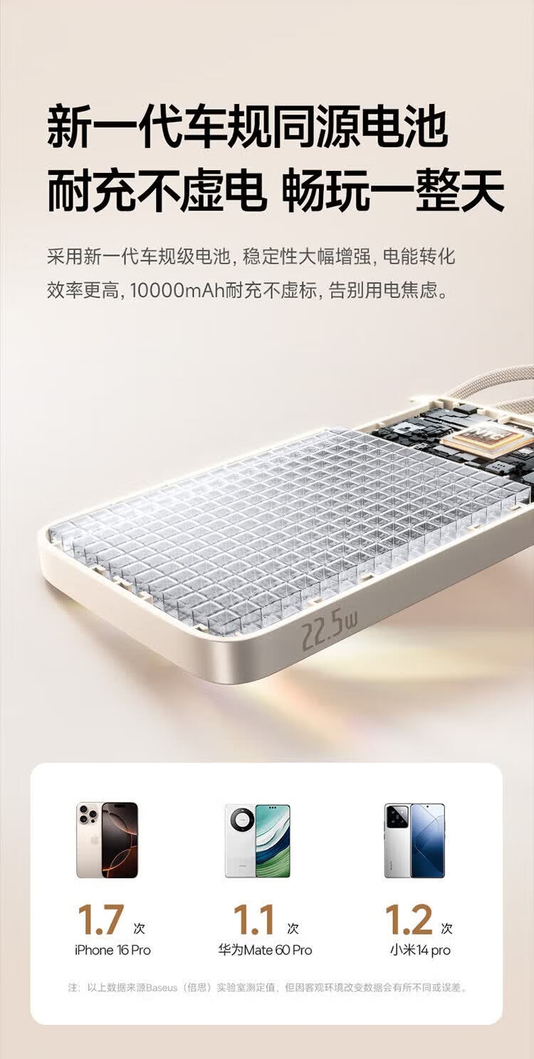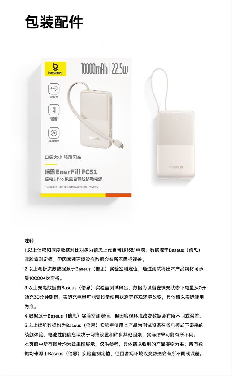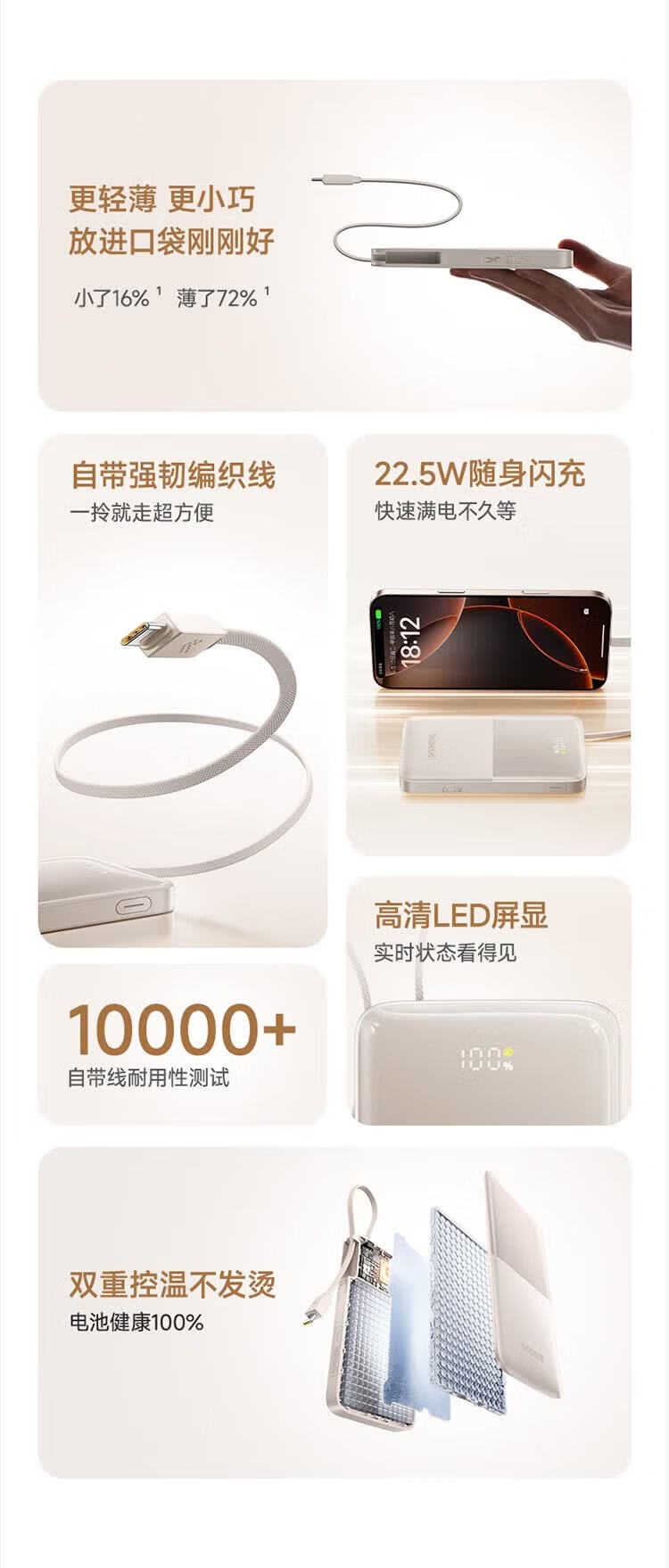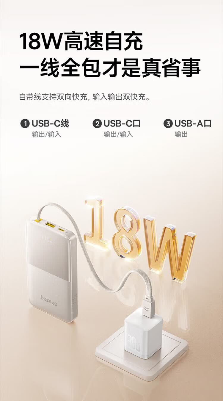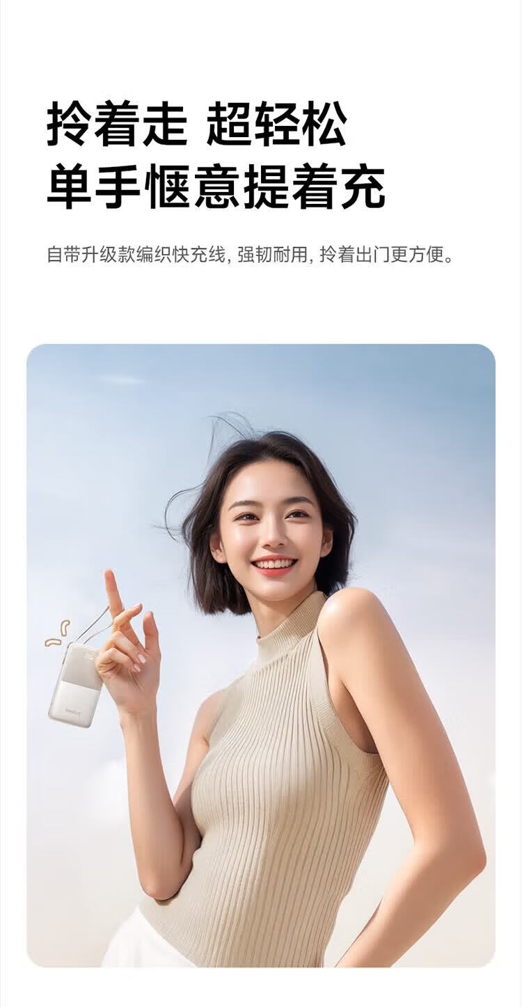 自带升级款编织快充线,强韧耐用;22.5W快充,主流品牌设备都能充;自带线支持双向充电,输入输出双快充