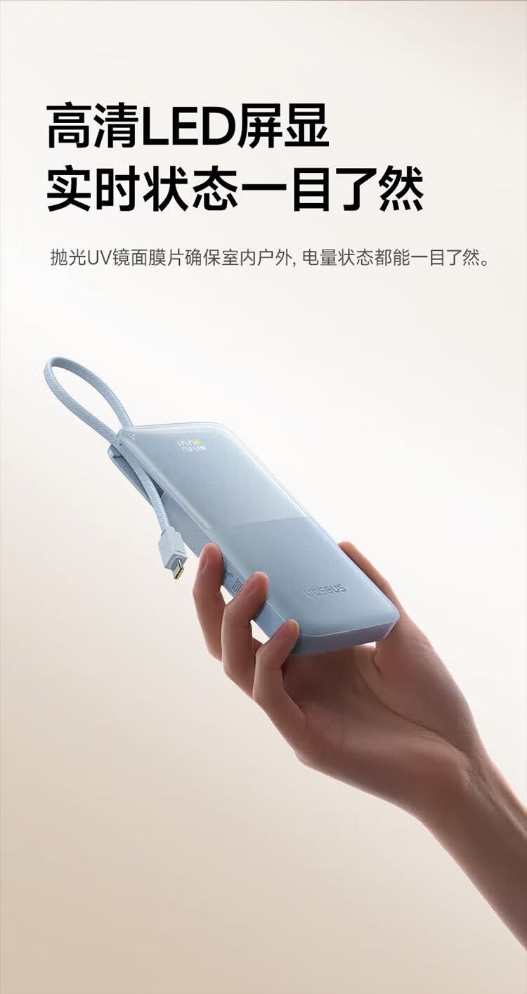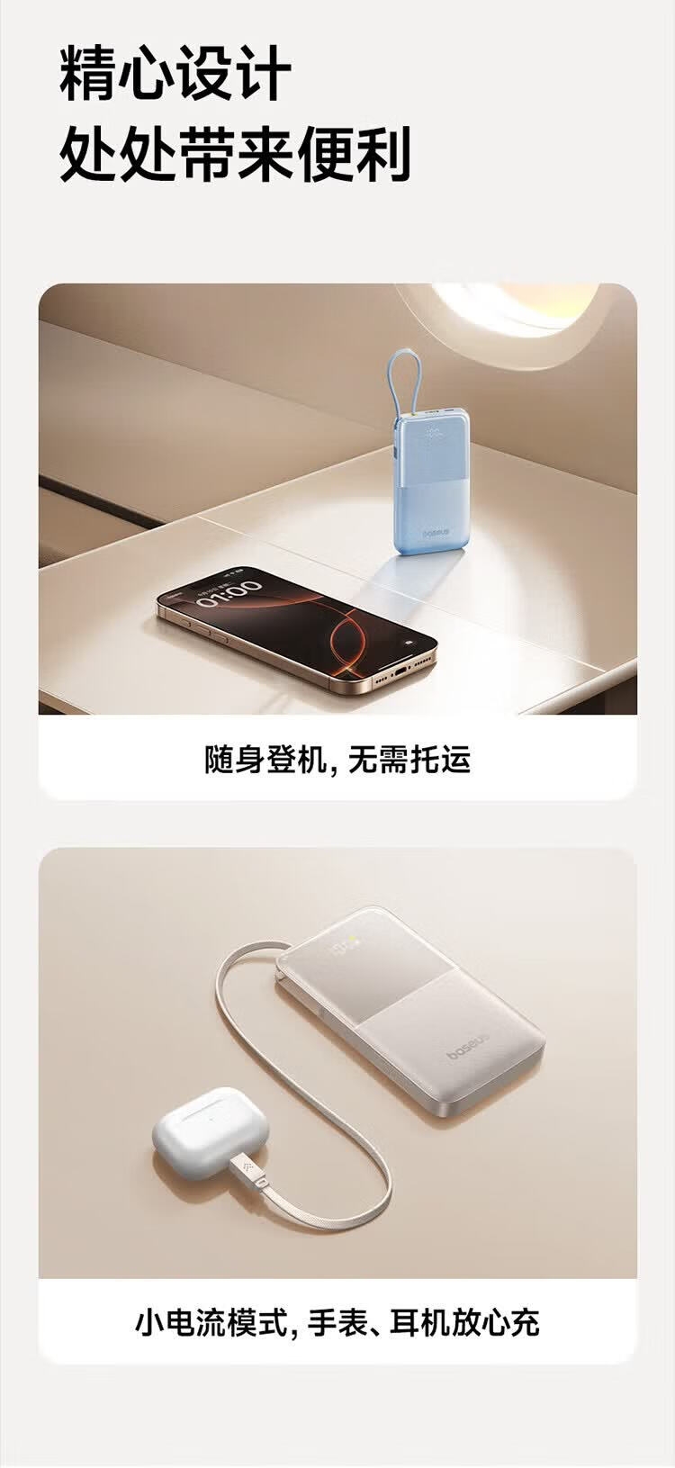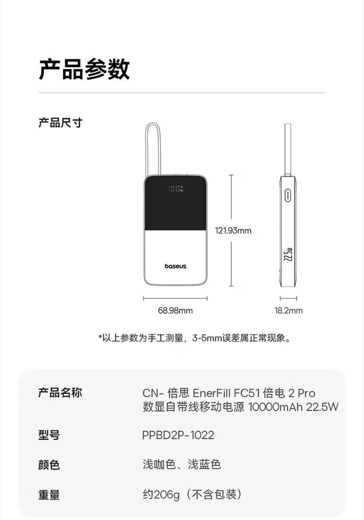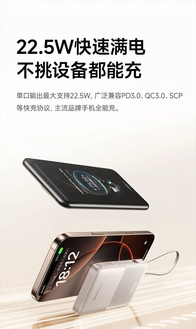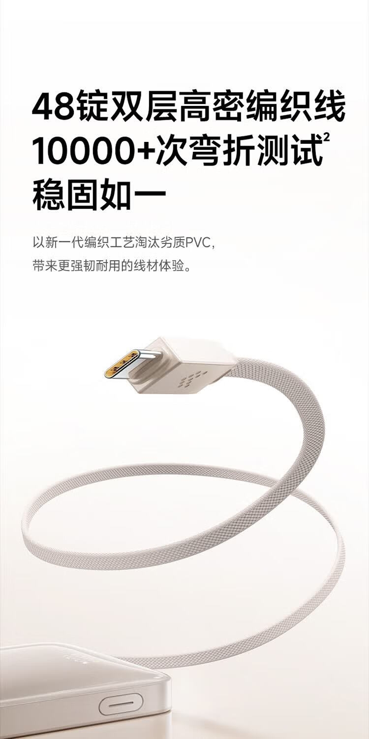 自带升级款编织快充线,强韧耐用;22.5W快充,主流品牌设备都能充;自带线支持双向充电,输入输出双快充