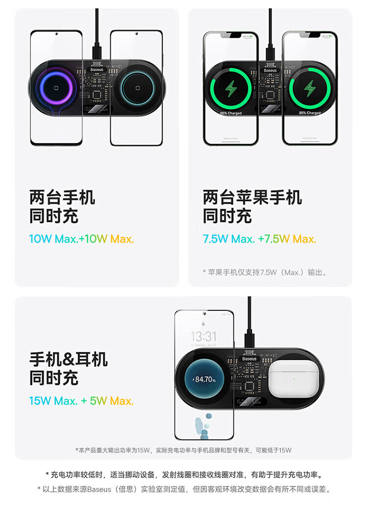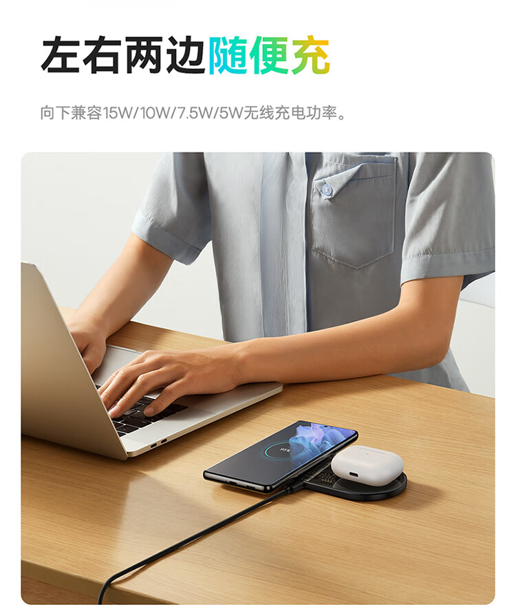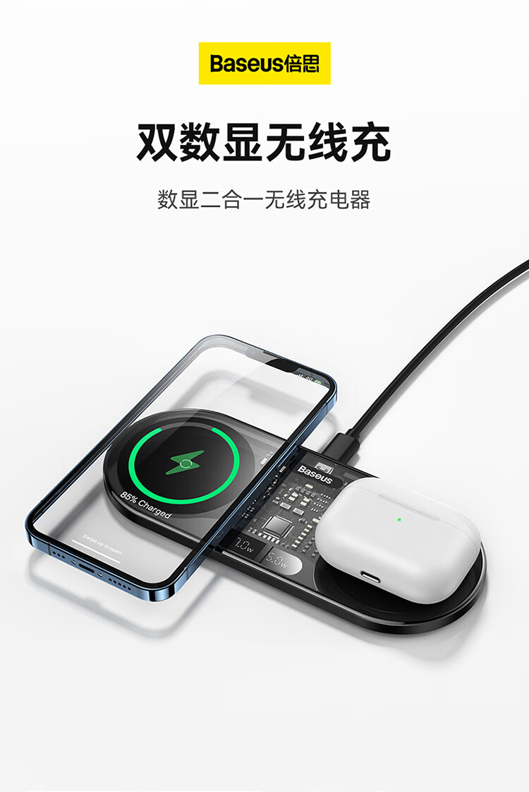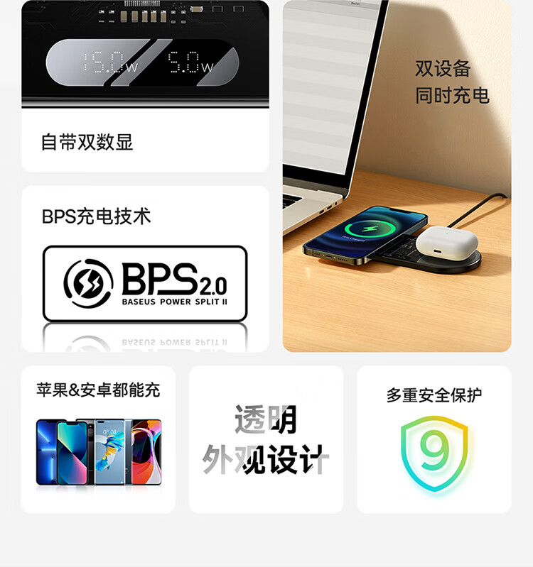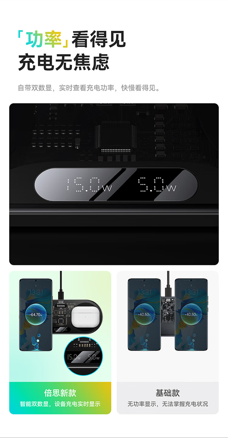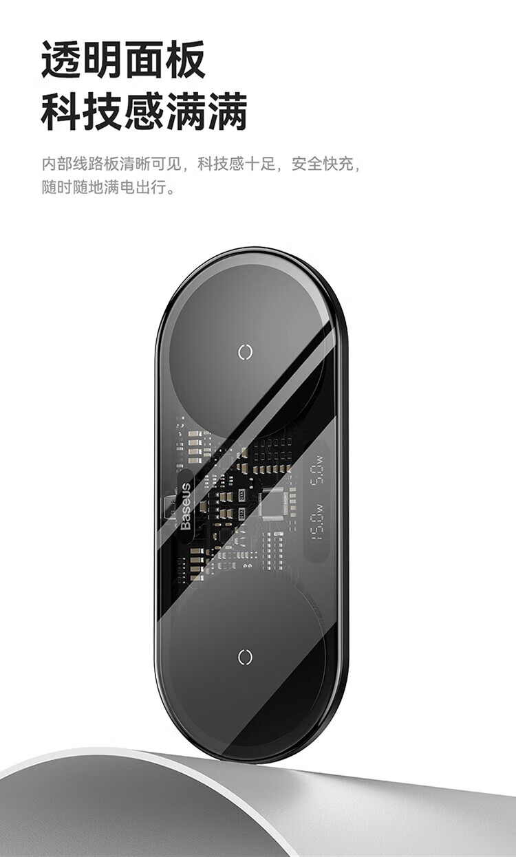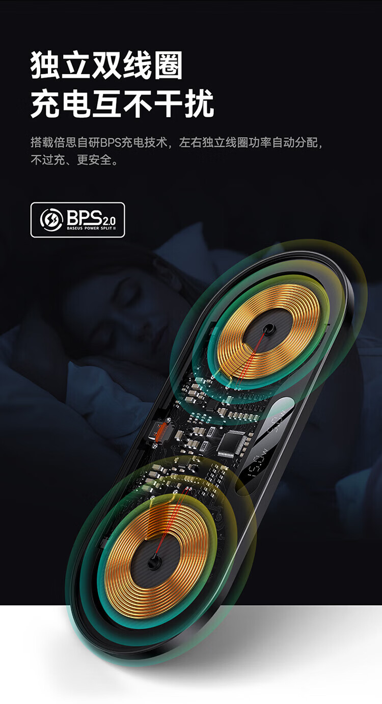 双设备同时充,自带双数显;独立双线圈,充电互不干扰;轻薄易携带,带壳照样充