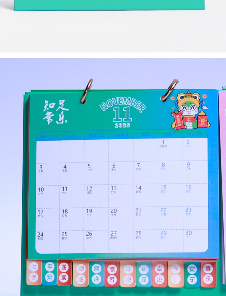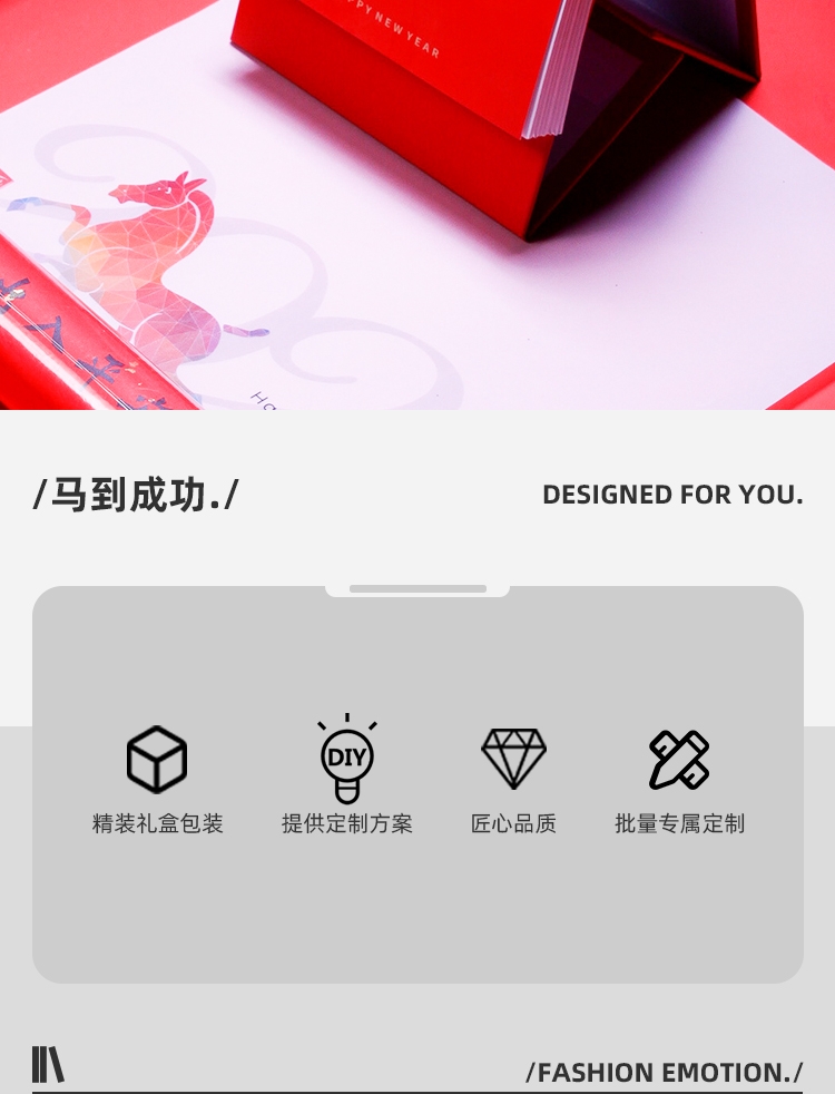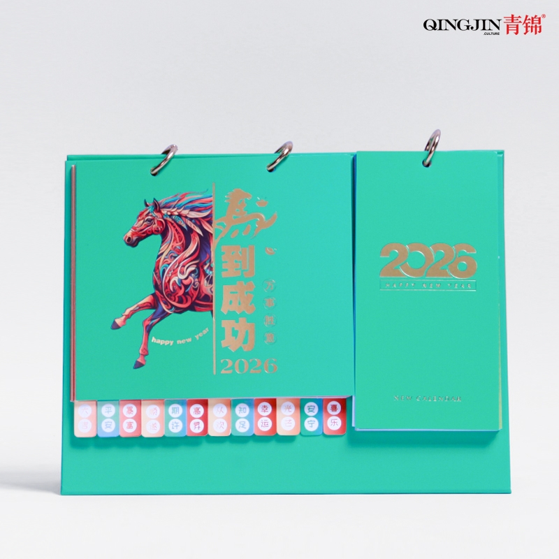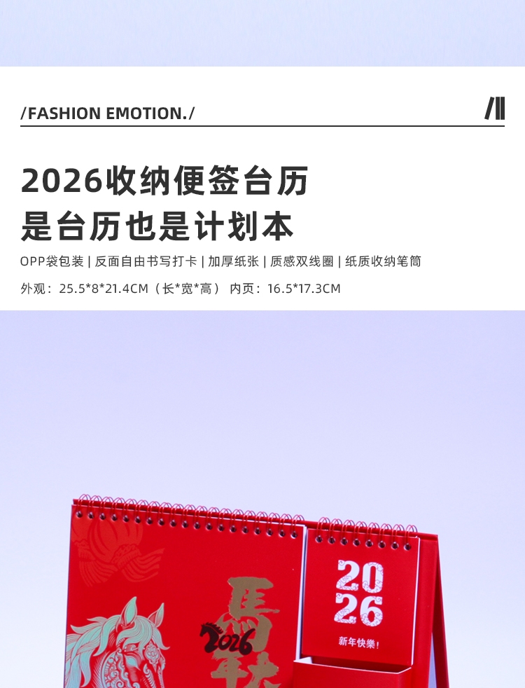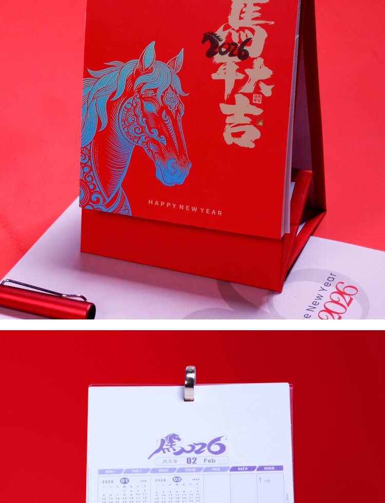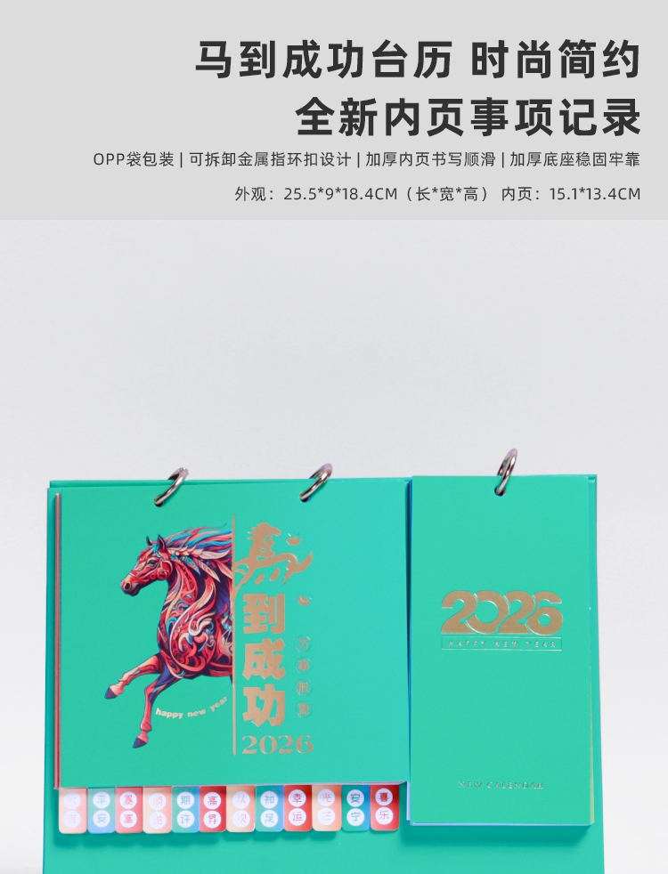 配置清单:包装OPP袋 材质 台历封面350克自卡纸双面复膜 台历内页300克自卡纸。 台历便签封面300克白卡纸, 台历便签内页200克 台历架外纸157克铜版覆膜 台历架内衬纸70克双胶纸,台历架纸板2.2厚