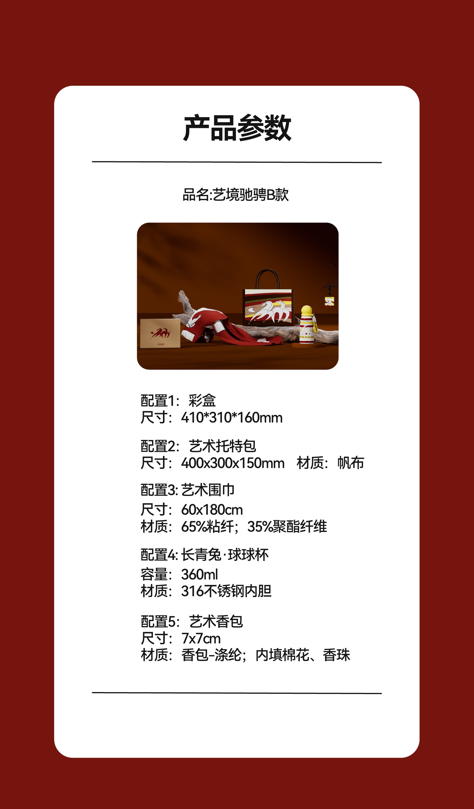 配置清单:艺术牛皮纸盒x1 长青兔·艺术托特包x1 长青兔·球球杯x1 长青兔·艺术围巾x1 长青兔·艺术香包x1、贺卡x1
