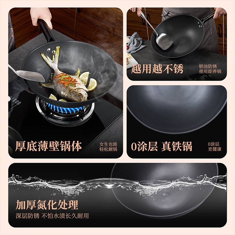 采用优质精铁基材,卷边工艺,经久耐用;;一体旋压,厚底薄壁,均匀受热;;无涂层氮化深层处理,深层防锈,健康耐用,不挑铲;;可视化锅盖,配件齐全烹饪美食随时看得到;;实木手柄,握感舒适,隔热防烫,高颜值。