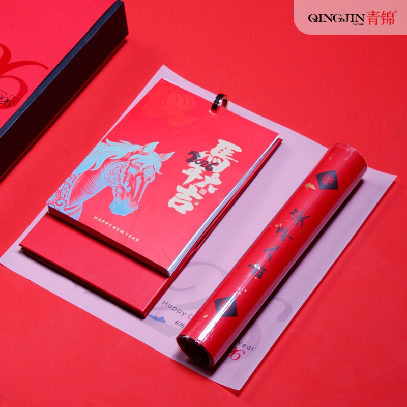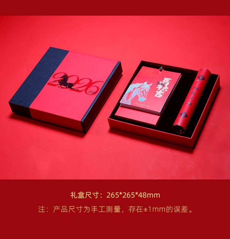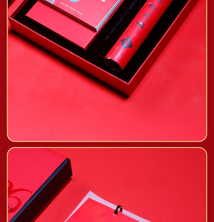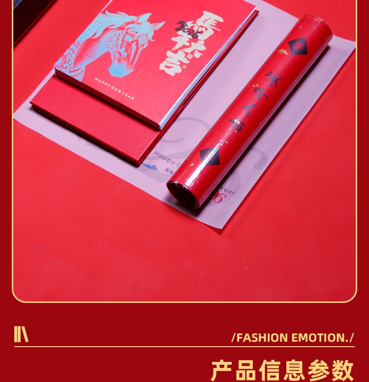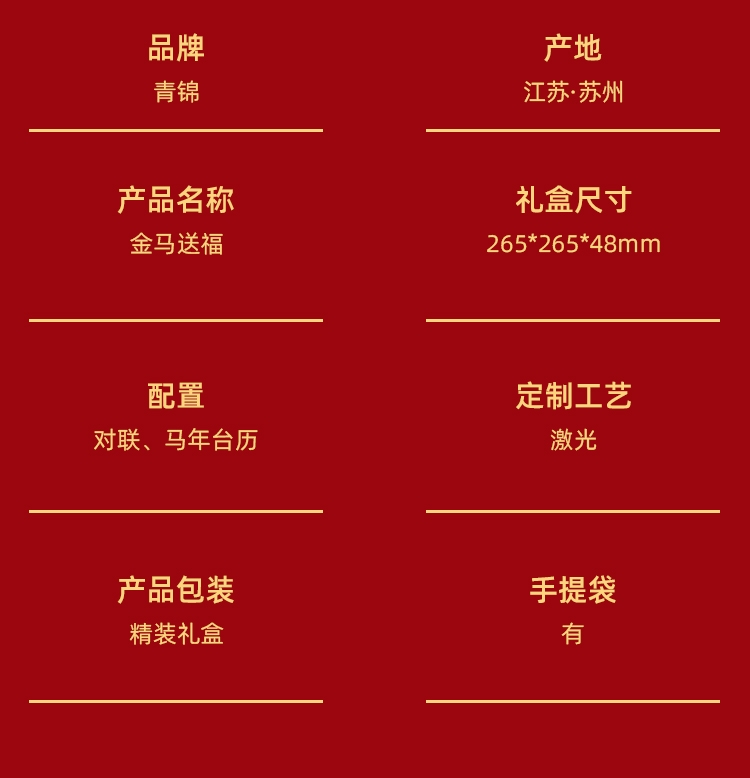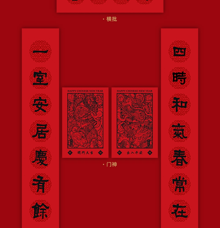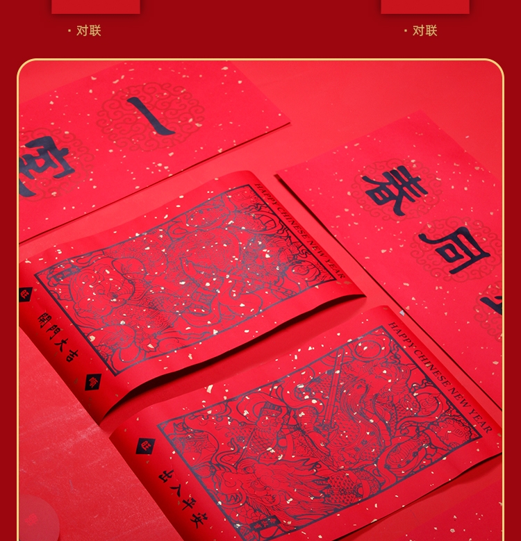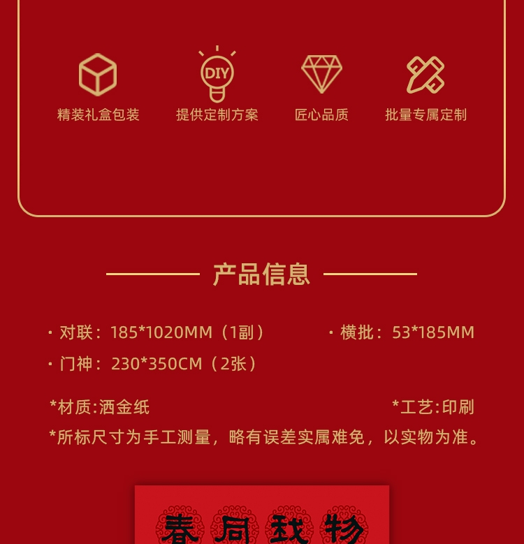 配置清单:配置 春联*2横批*1 门神*2 台历 *1 材质 台历 高级艺术纸 撒金纸-触感纸 工艺 印刷烫金 尺寸 春联185*1020cm*2 横批185*530cm*1 门神230*350cm*2 台历 220*110mm 礼盒:265*265*48mm