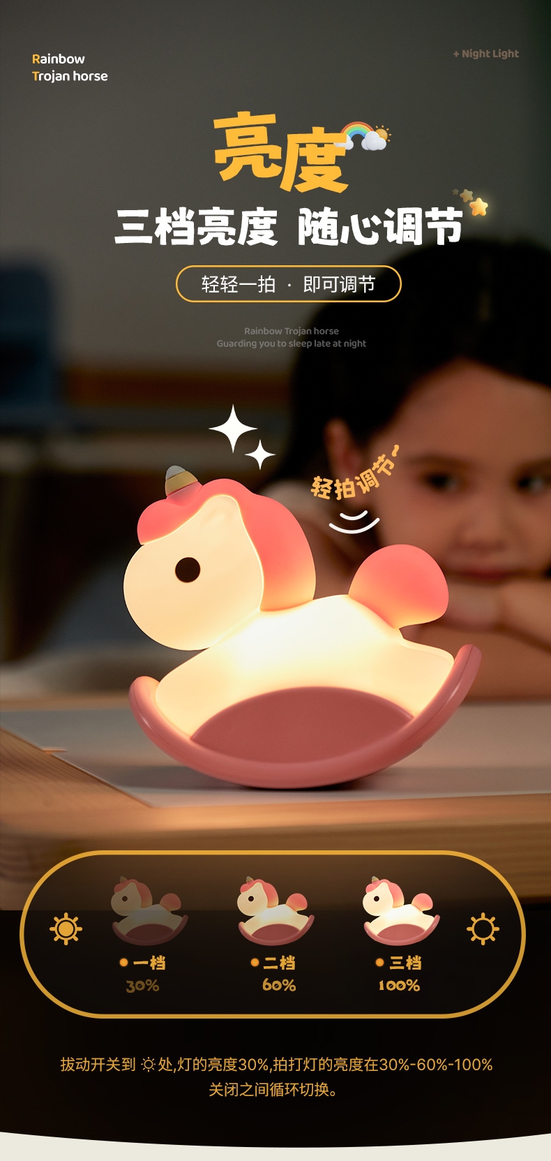 任拍,任打,任捏,手感柔软;柔光护眼,守护入眠;三档亮度,随心调节