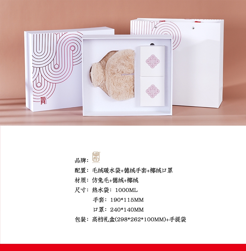 配置:毛绒暖水袋+德绒手套+椰绒口罩