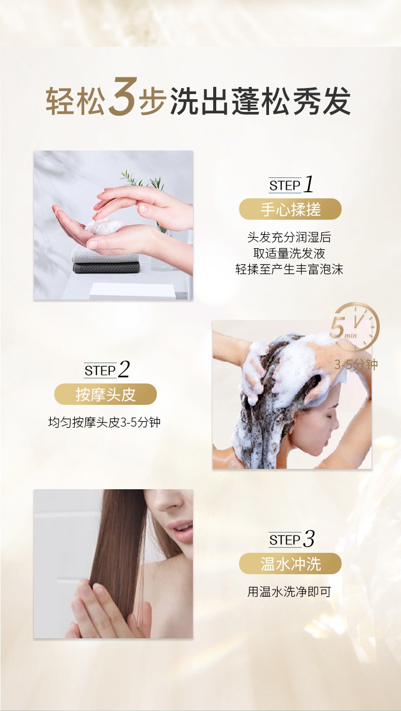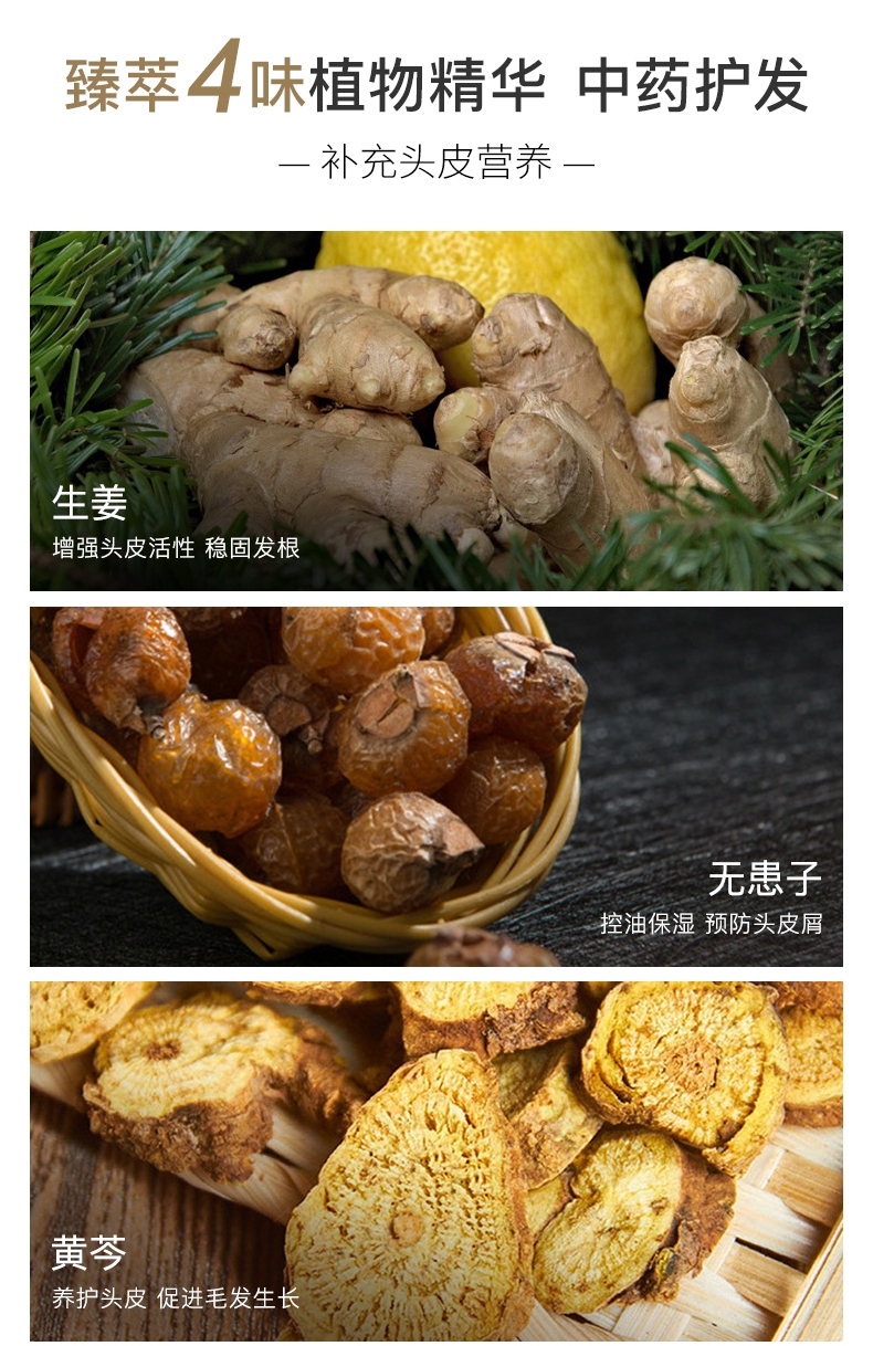 甄选生姜、无患子、黄芩、薄荷4味植物精华,中药护发;补充头皮营养;复合氨基酸配方,润泽保湿,营造秀发健康生长环境