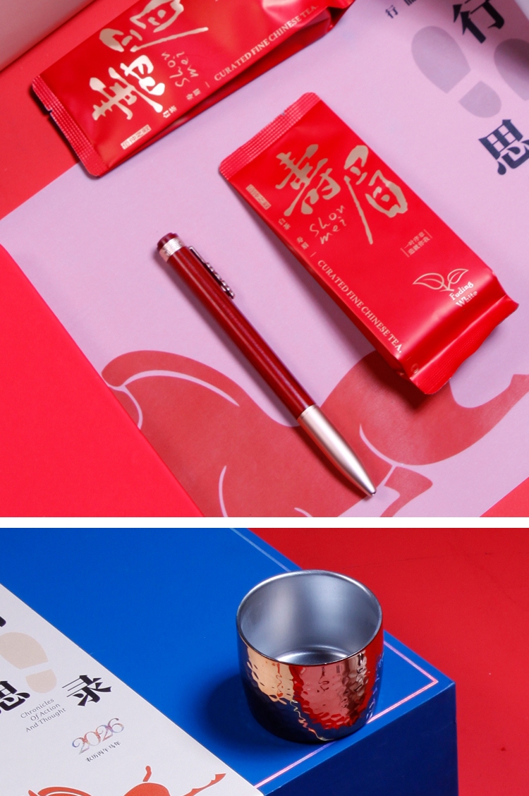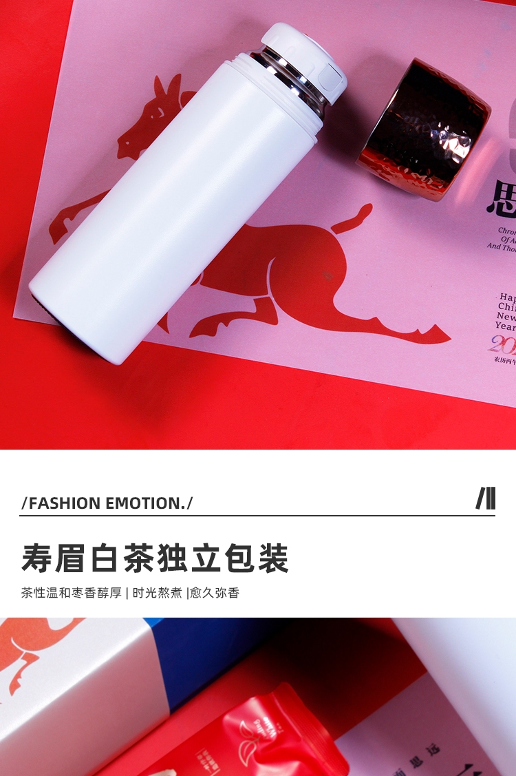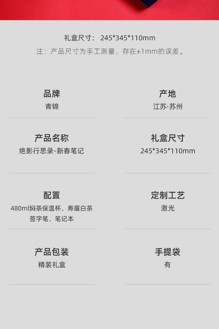 配置清单:焖茶保温杯480ML*1 颜色:橘橙色/黑色/白色/墨绿色 锦云签字笔*1 颜色 红花梨木色 绝影笔记本*1 颜色红色/白色 寿眉白茶*2包 精装礼盒手提袋*1
