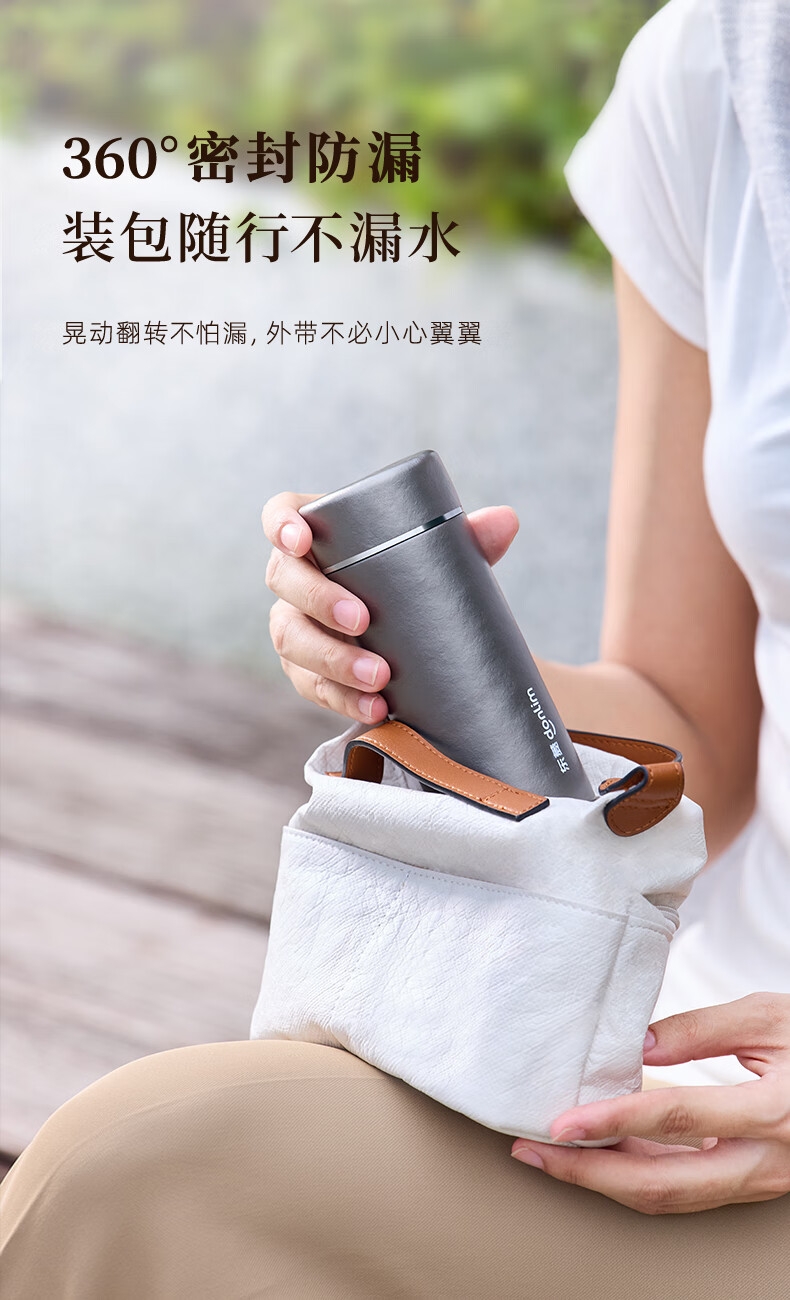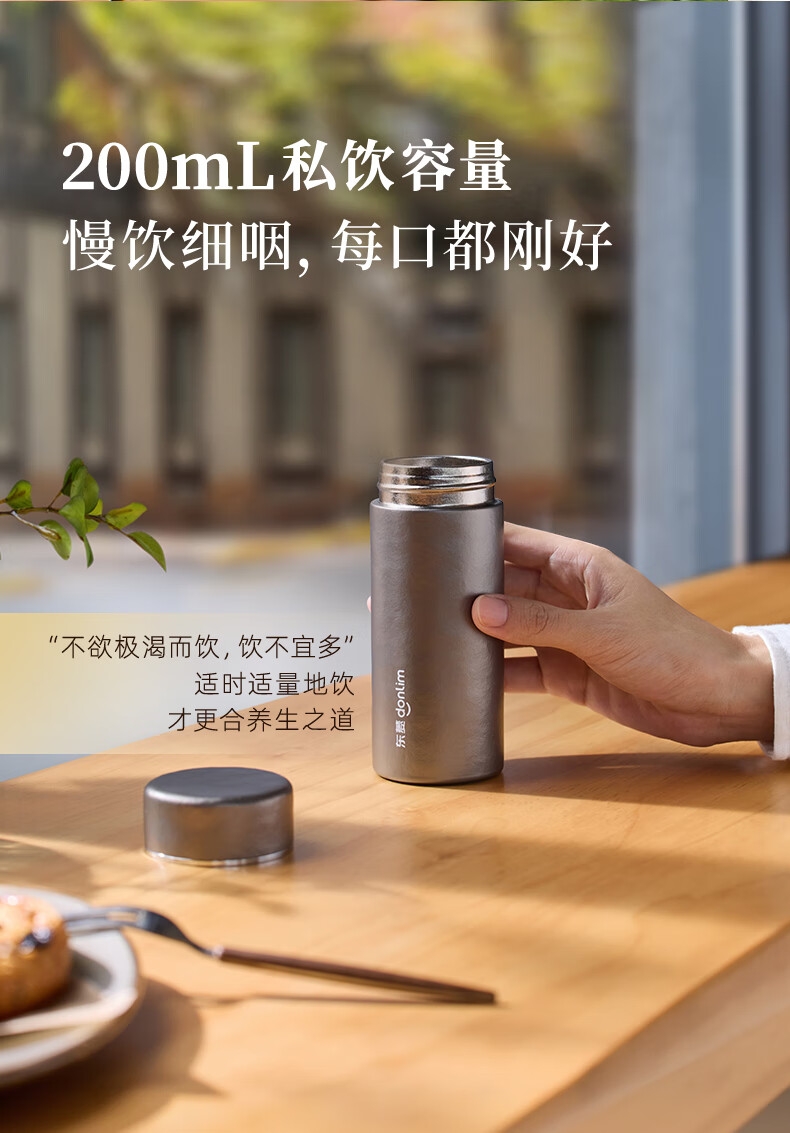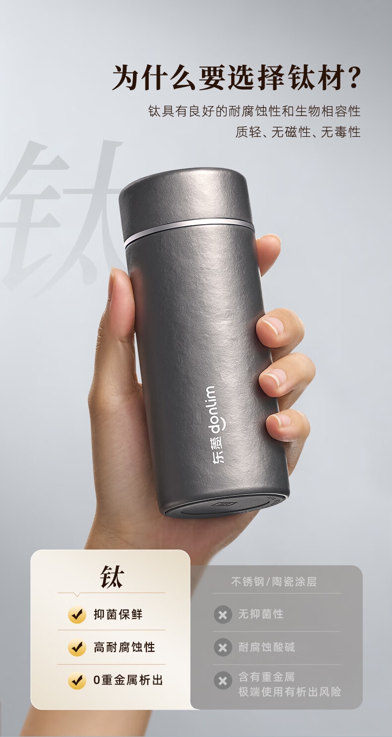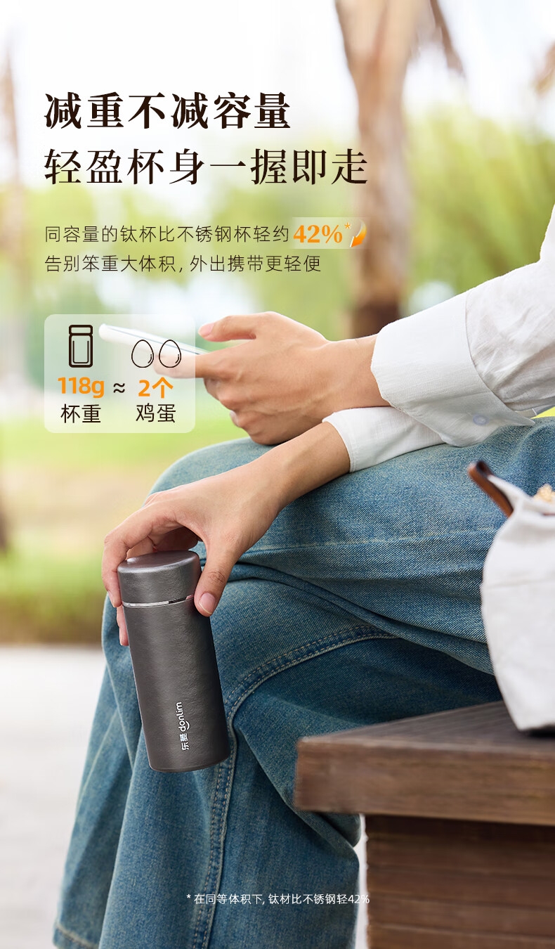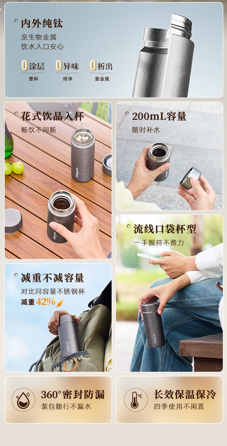 115g轻便,口袋轻松放;99%双层纯钛,不含重金属,泡茶更纯正;保鲜12小时,保温保冷6小时