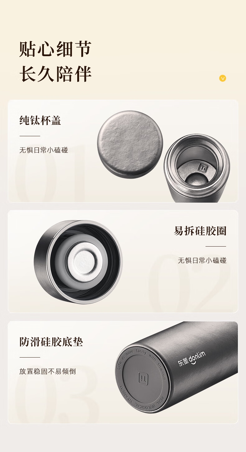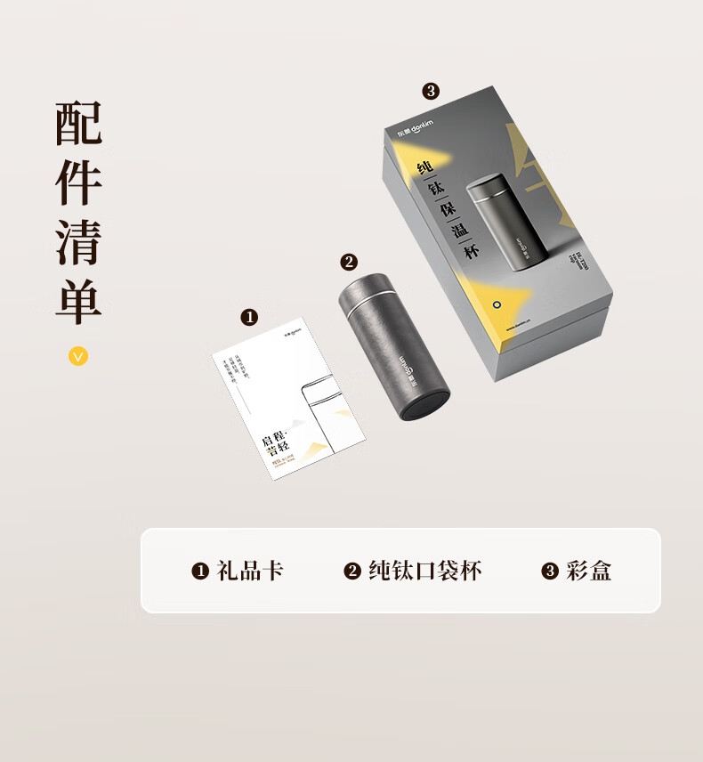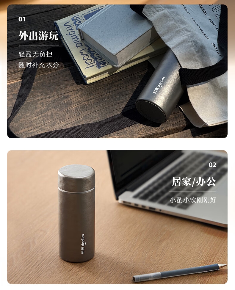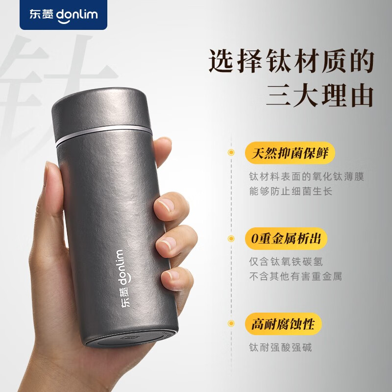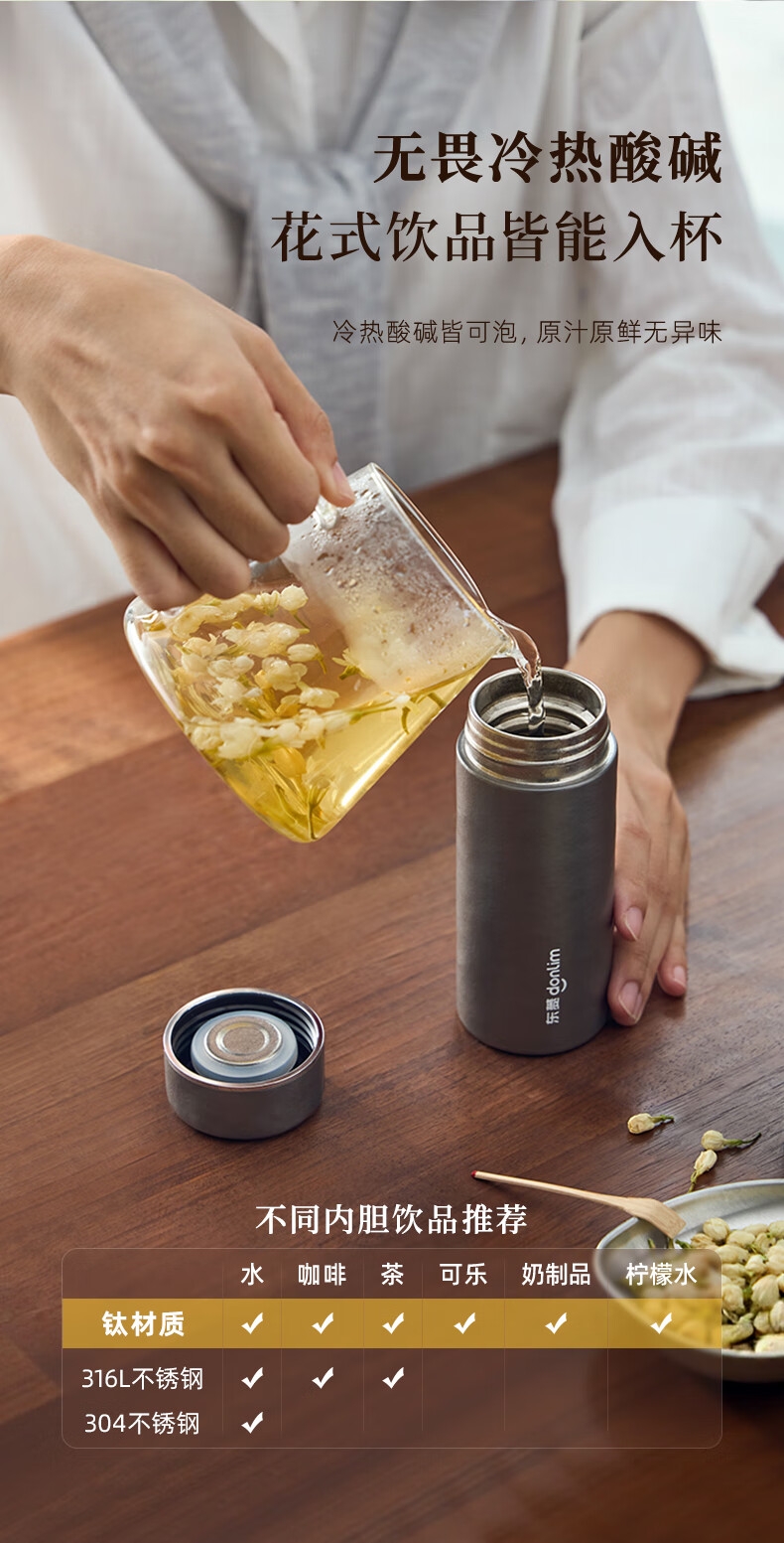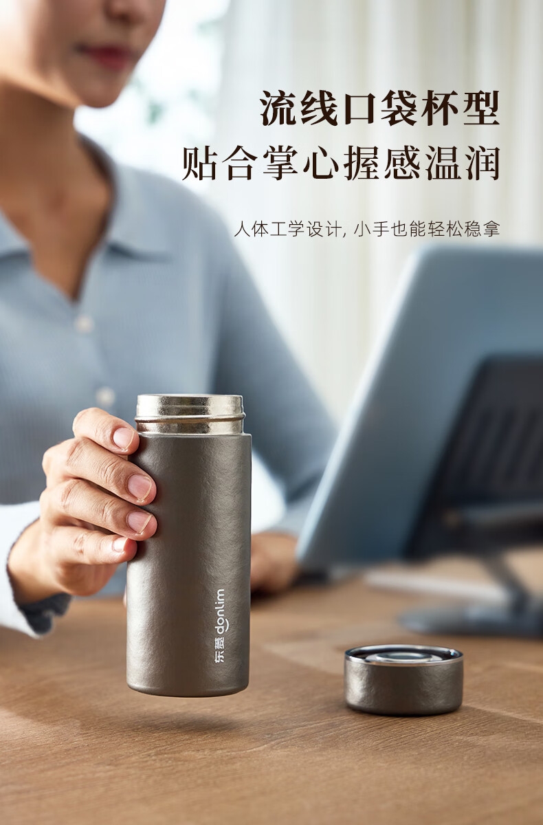 115g轻便,口袋轻松放;99%双层纯钛,不含重金属,泡茶更纯正;保鲜12小时,保温保冷6小时