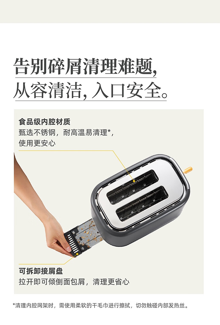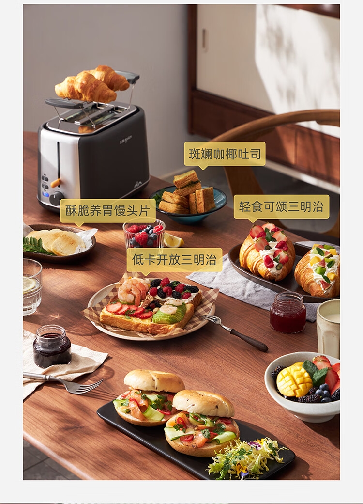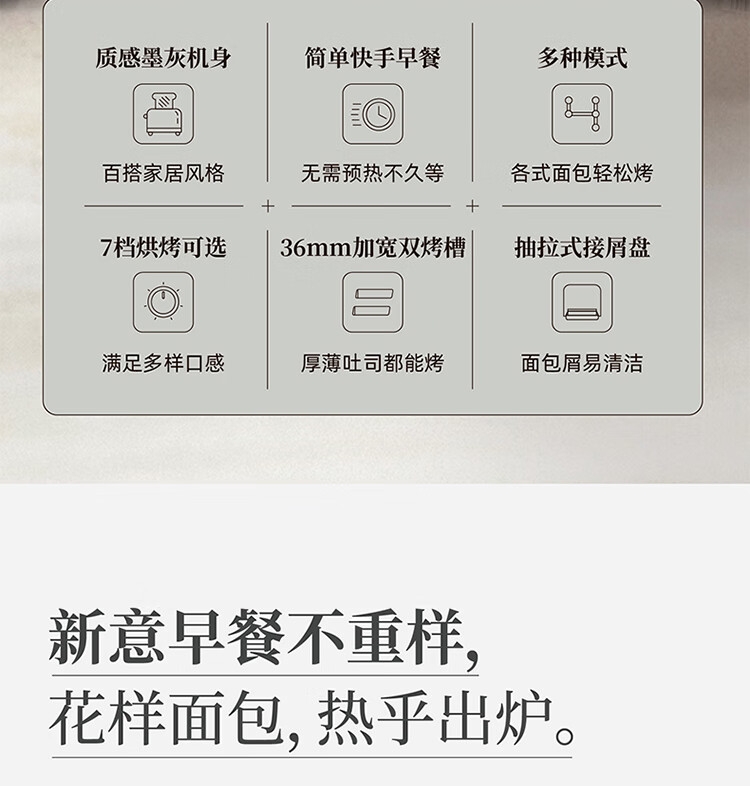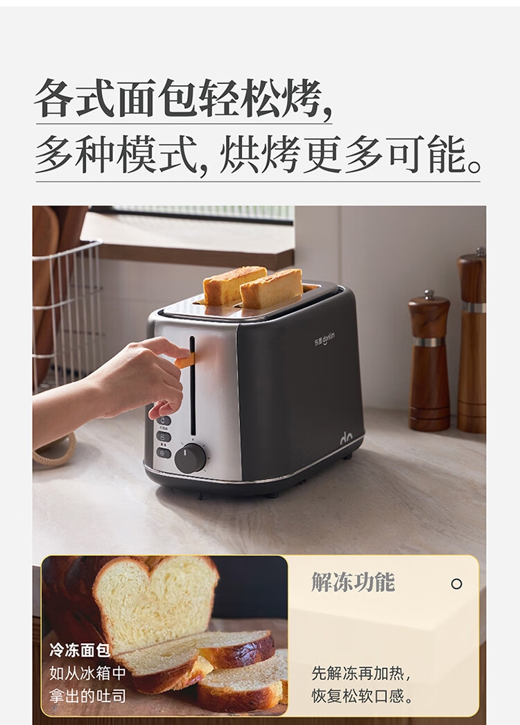 简单快手,热乎早餐不久等;质感墨灰机身,家居风格轻松百搭;烘烤/解冻/再加热/搭配烘烤架,各式面包轻松烤