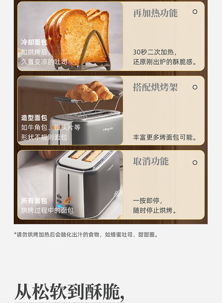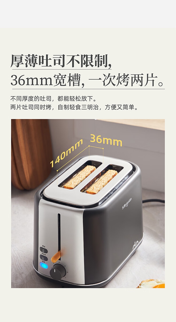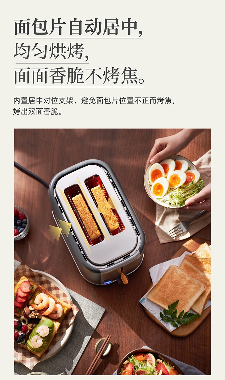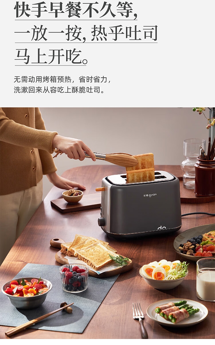 简单快手,热乎早餐不久等;质感墨灰机身,家居风格轻松百搭;烘烤/解冻/再加热/搭配烘烤架,各式面包轻松烤
