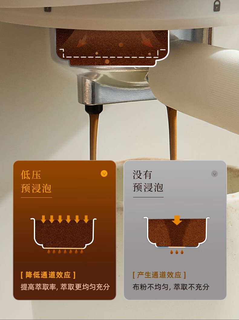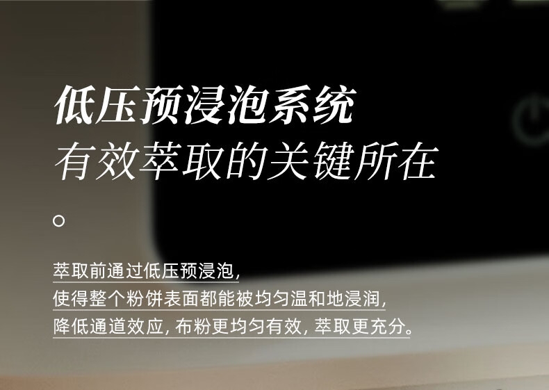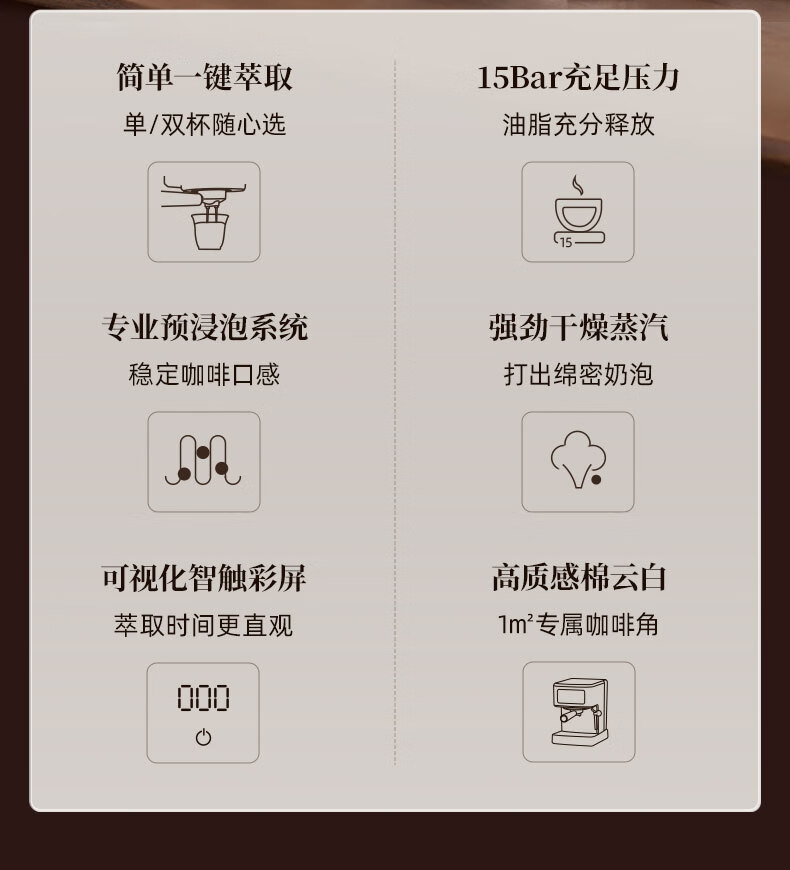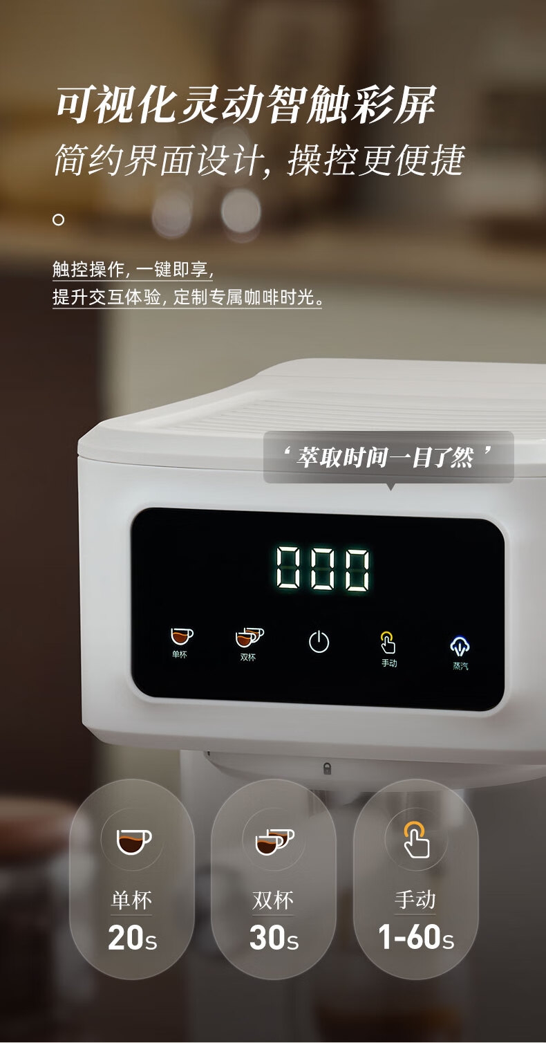 简单一键萃取,单/双杯随心选;15Bar充足压力,专业预浸泡系统;可视化智触彩屏,萃取时间更直观