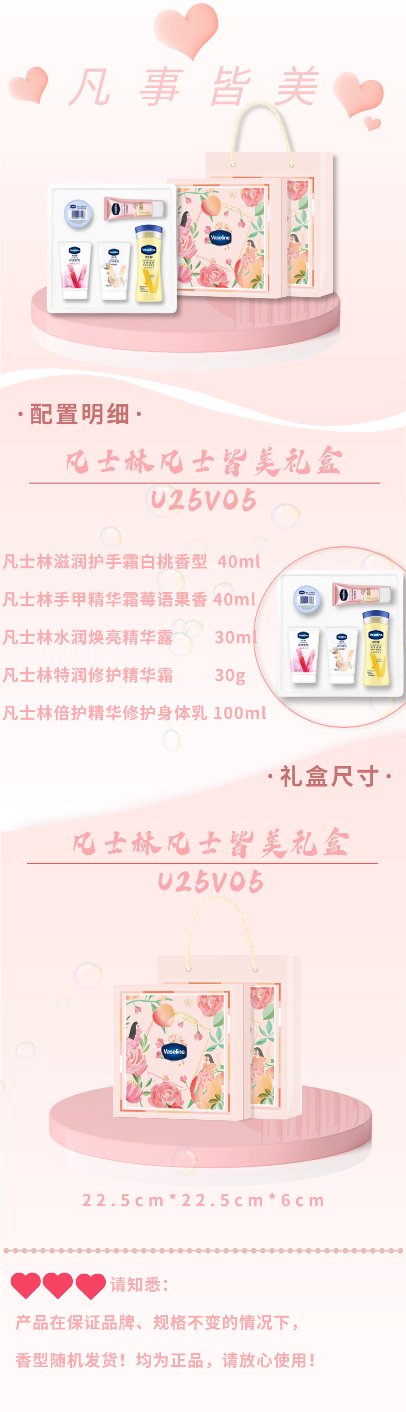 配置清单:凡士林滋润护手霜白桃香型 40ml 凡士林保湿莹亮手甲精华霜莓语果香 40ml 凡士林水润焕亮精华露 30ml 凡士林特润修护精华霜 30g 凡士林倍护精华修护身体乳 100ml