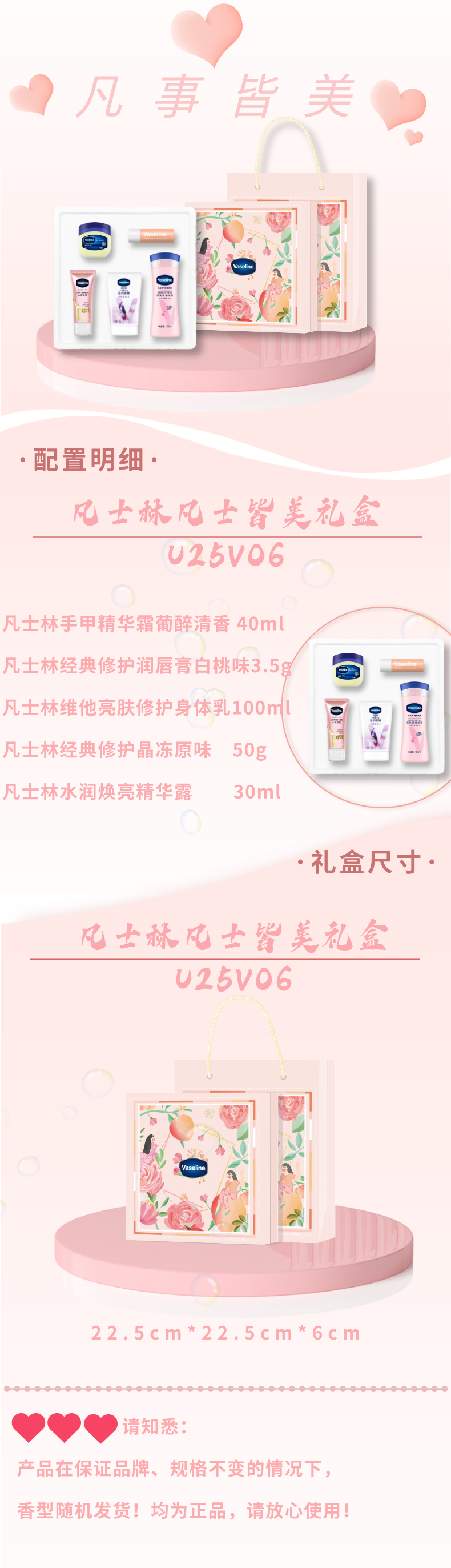 配置清单:凡士林滋润柔嫩手甲精华霜葡醉清香 40ml 凡士林经典修护弹润润唇膏清甜白桃味 3.5g 凡士林维他亮肤烟酰胺焕亮修护身体乳 100ml 凡士林经典修护晶冻原味 50g 凡士林水润焕亮精华露 30ml