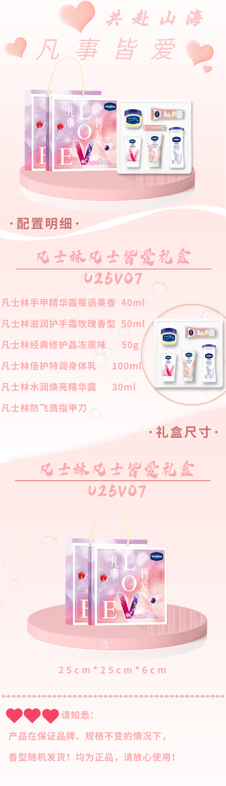 配置清单:凡士林保湿莹亮手甲精华霜莓语果香 40ml 凡士林滋润护手霜玫瑰香型 50ml 凡士林经典修护晶冻原味 50g 凡士林倍护特润修护身体乳清香型 100ml 凡士林水润焕亮精华露 30ml 凡士林防飞溅指甲刀