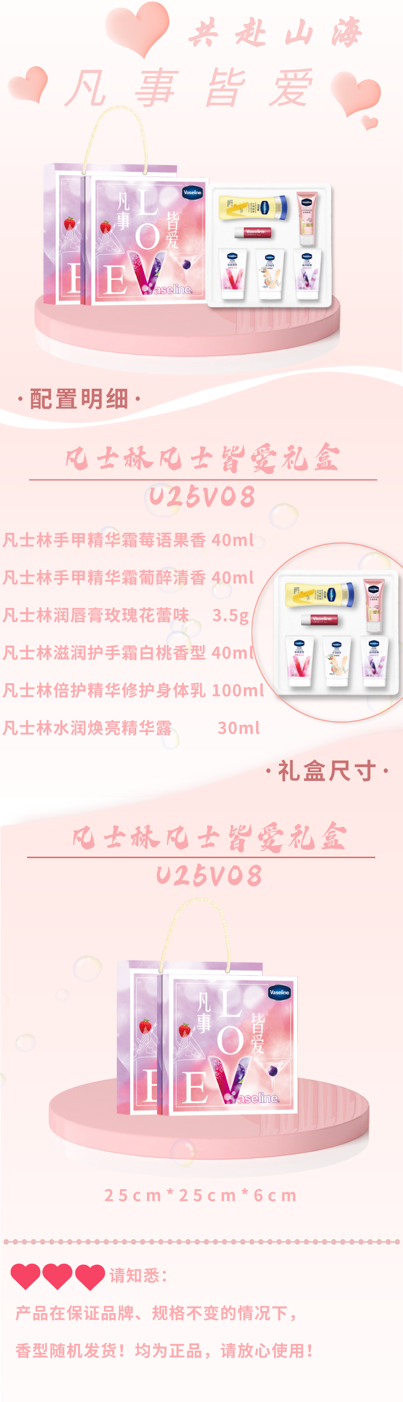 配置清单:凡士林保湿莹亮手甲精华霜莓语果香 40ml 凡士林滋润柔嫩手甲精华霜葡醉清香 40ml 凡士林经典修护焕采润唇膏玫瑰花蕾味 3.5g 凡士林滋润护手霜白桃香型 40ml 凡士林倍护精华修护身体乳 100ml 凡士林水润焕亮精华露 30ml