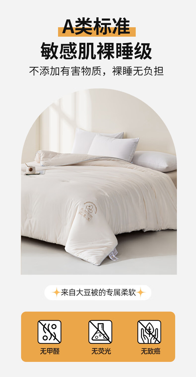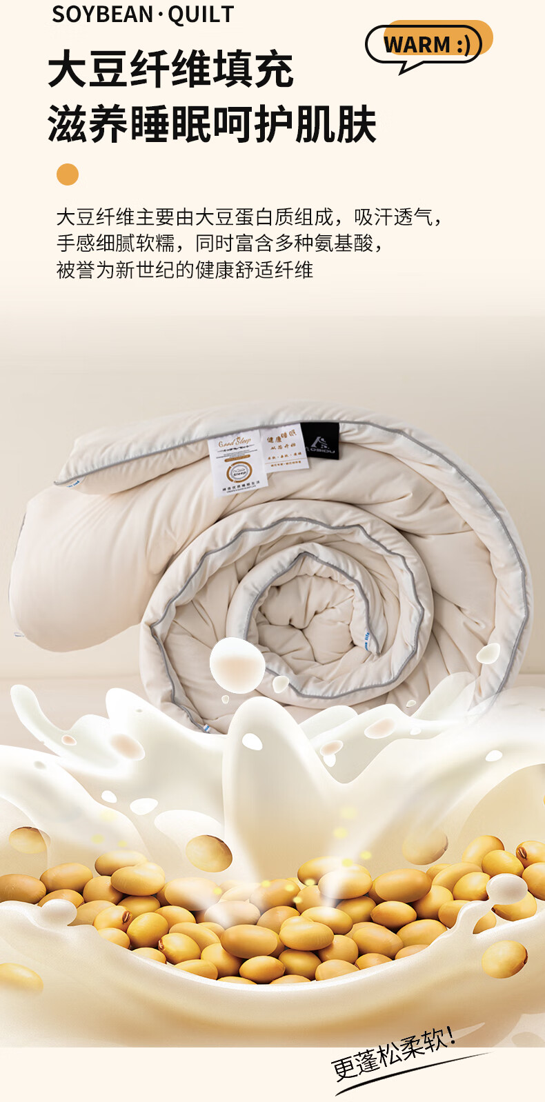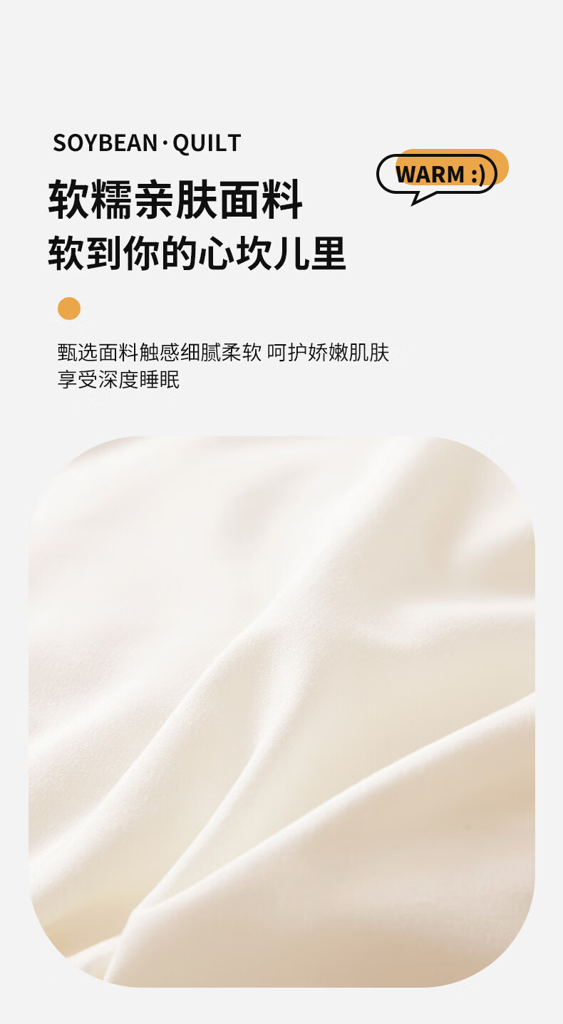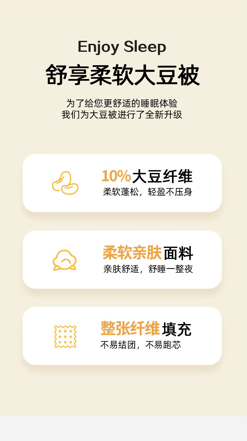 甄选软糯亲肤面料,细腻舒适,呵护肌肤,享受深度睡眠;A类安全标准,不添加有害物质,裸睡无负担;10%大豆纤维填充,黄金比例,蓬松轻盈贴合身体