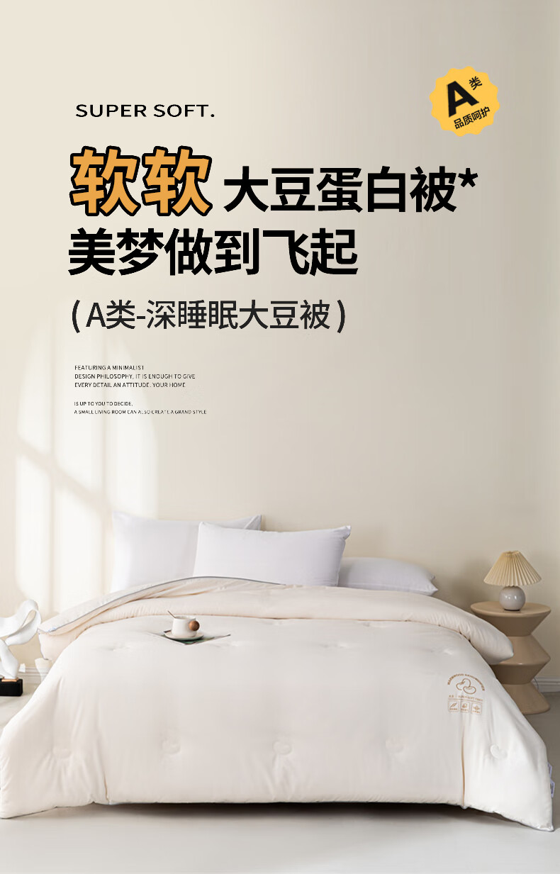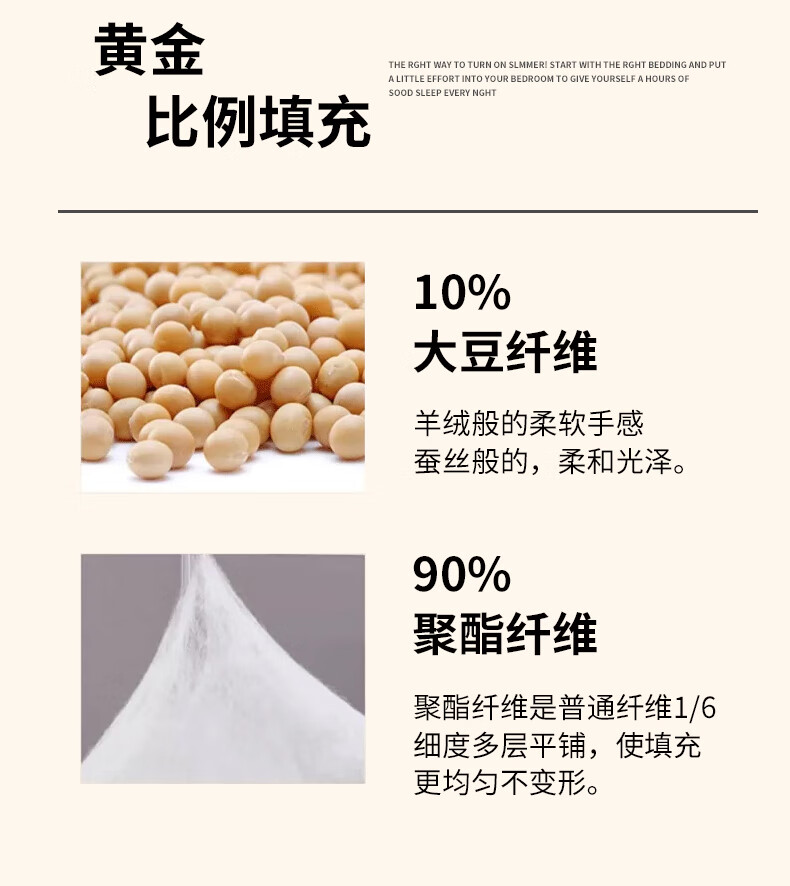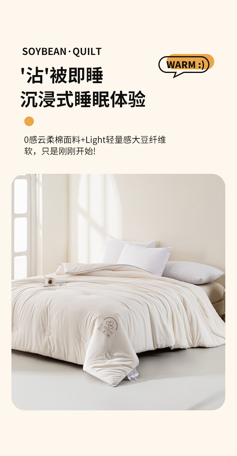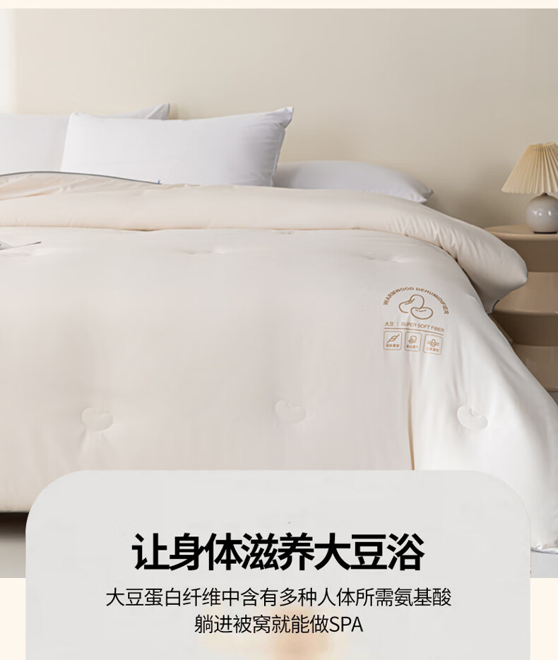 甄选软糯亲肤面料,细腻舒适,呵护肌肤,享受深度睡眠;A类安全标准,不添加有害物质,裸睡无负担;10%大豆纤维填充,黄金比例,蓬松轻盈贴合身体