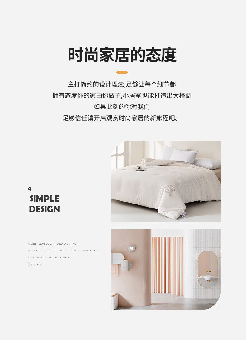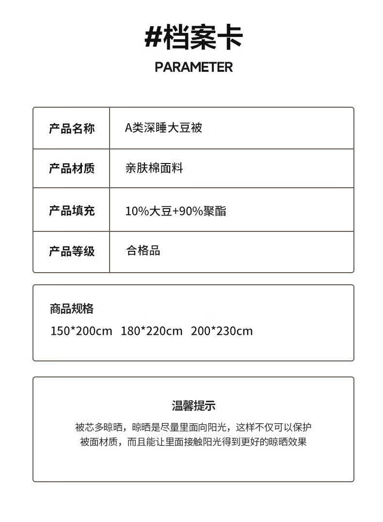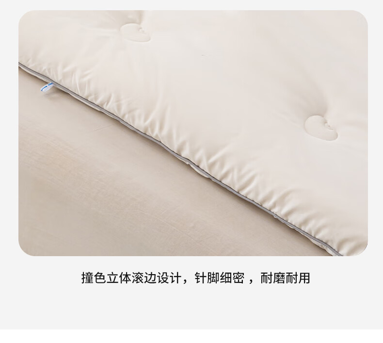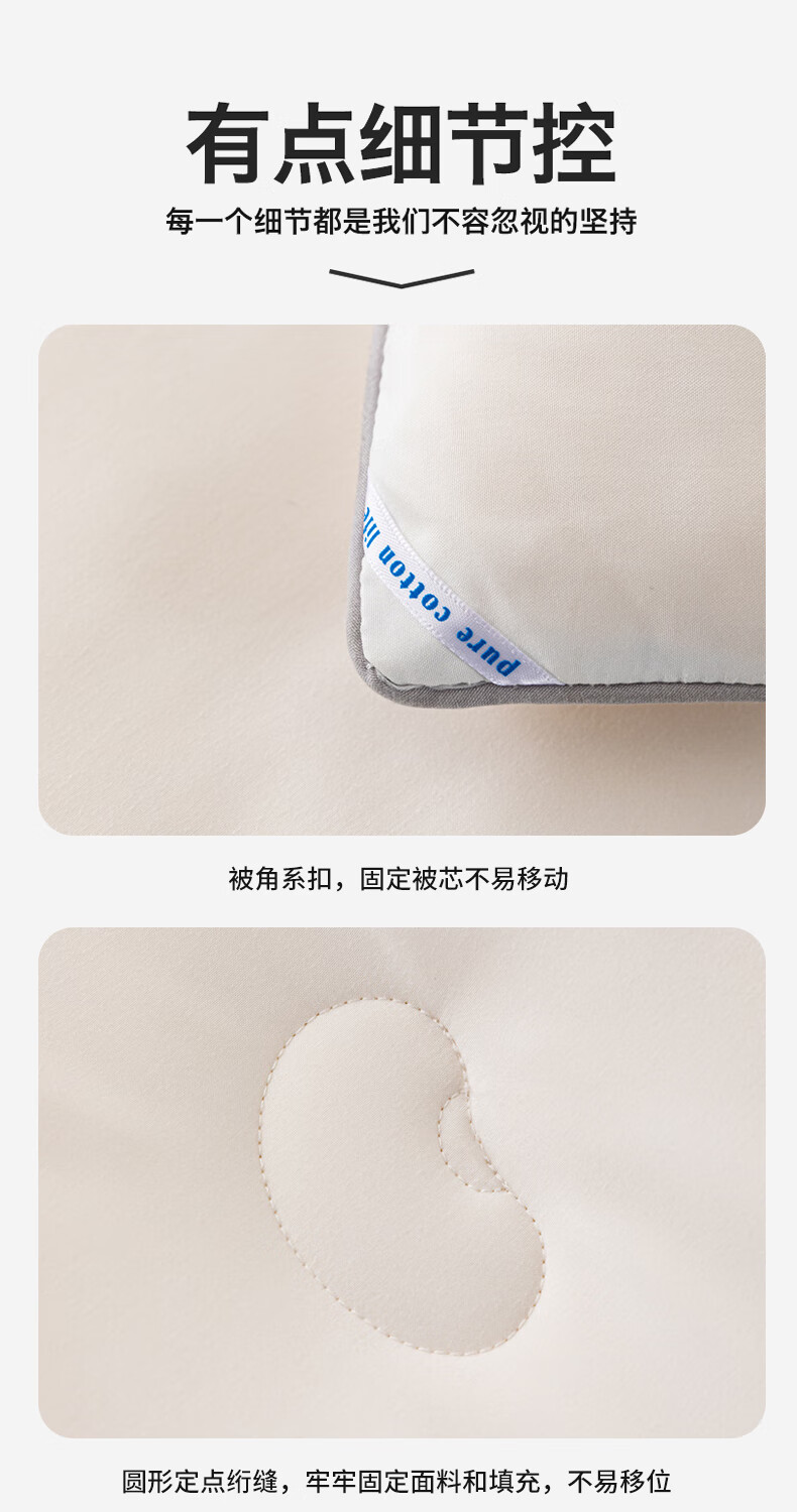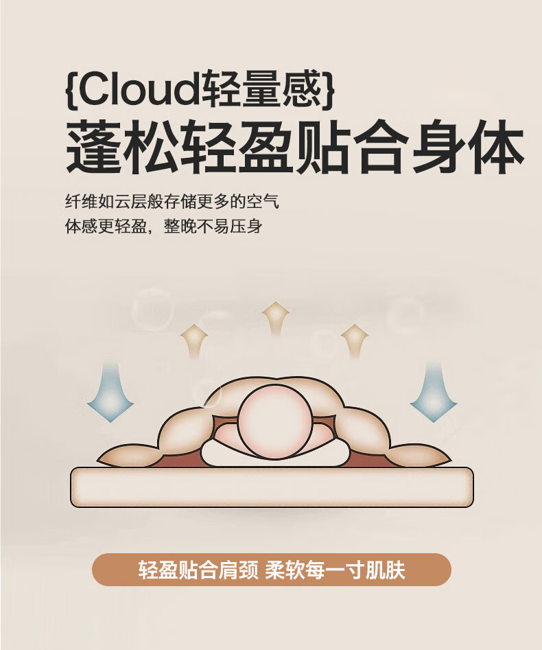甄选软糯亲肤面料,细腻舒适,呵护肌肤,享受深度睡眠;A类安全标准,不添加有害物质,裸睡无负担;10%大豆纤维填充,黄金比例,蓬松轻盈贴合身体