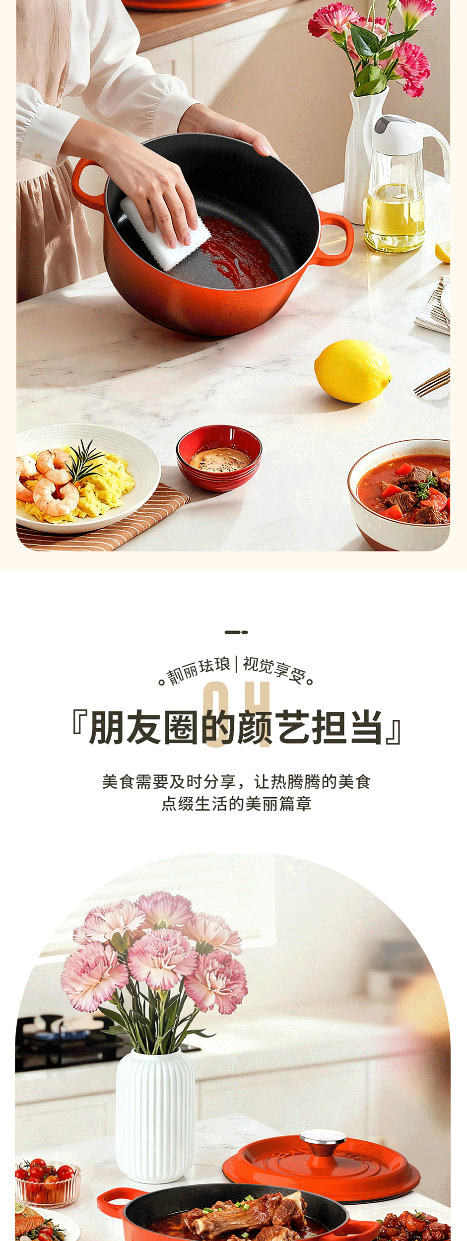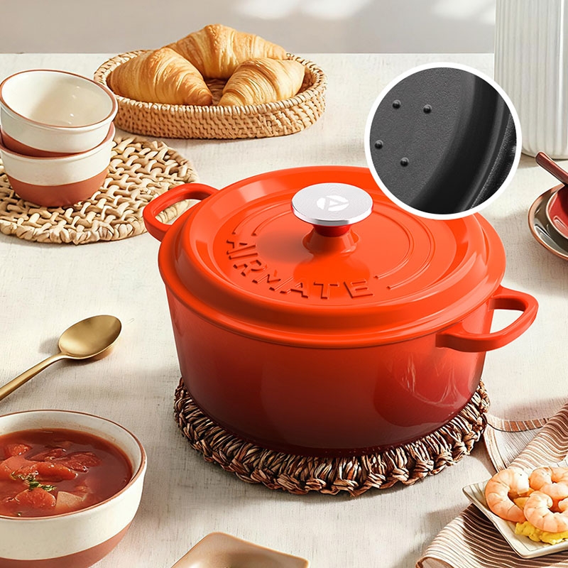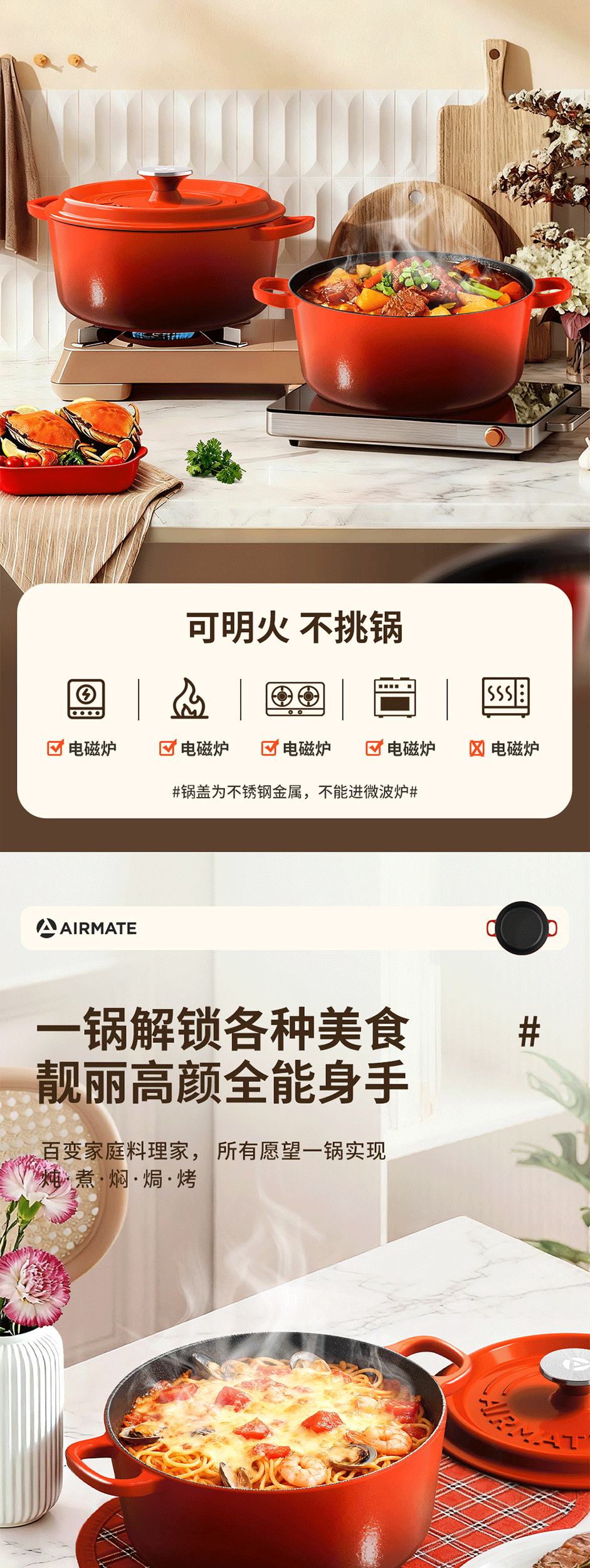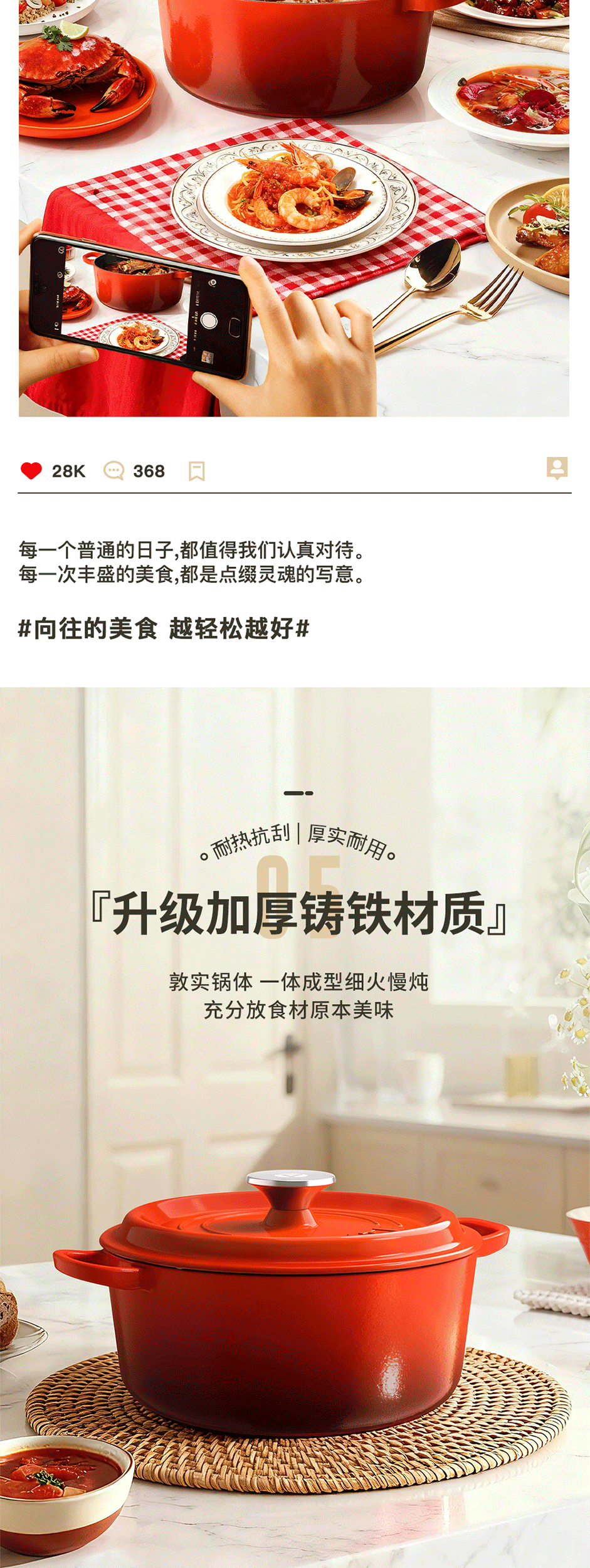 铸铁材质,受热均匀,经久耐用;可用于炖、煲、焖、煎、炒、烤等多种烹饪方式;铸铁材质,受热均匀,经久耐用