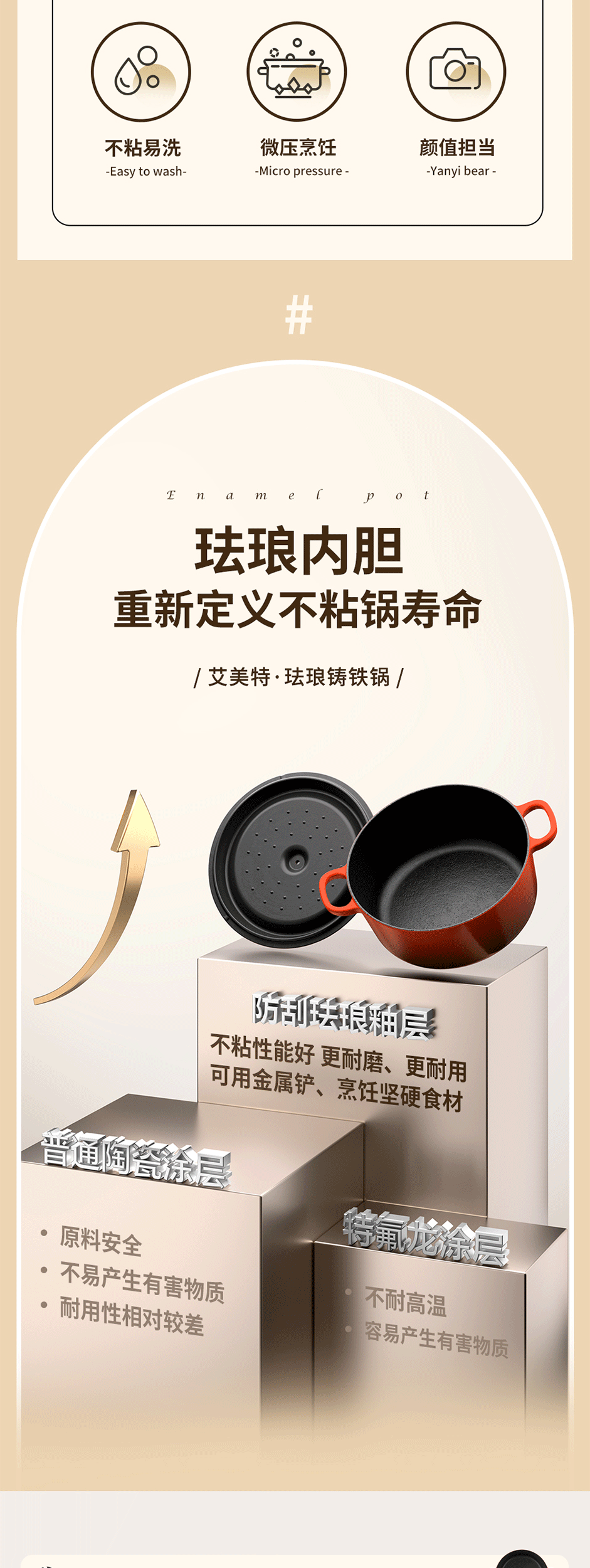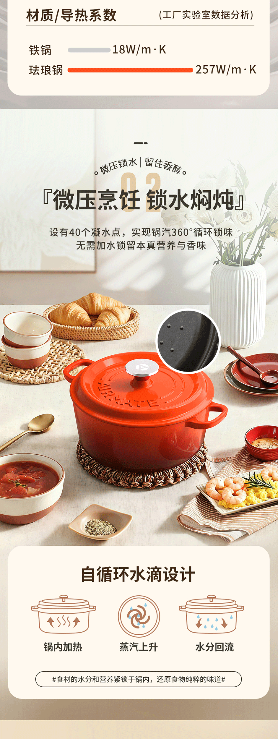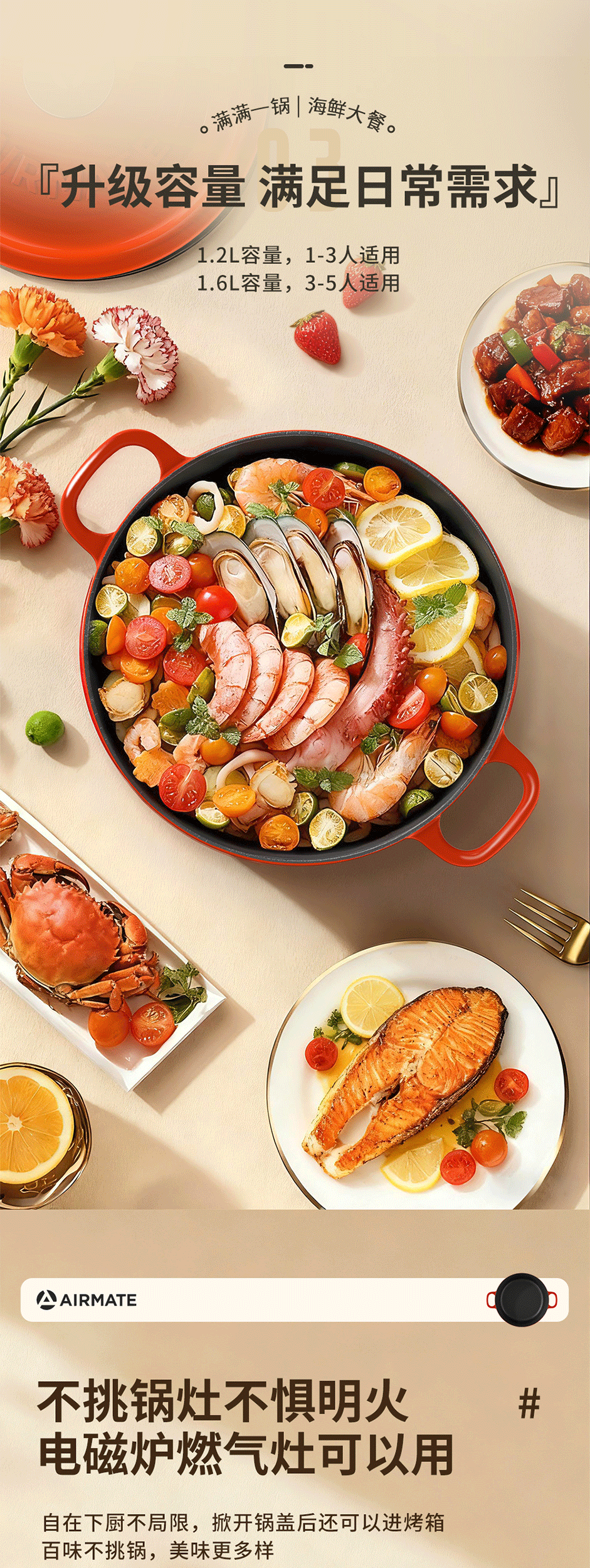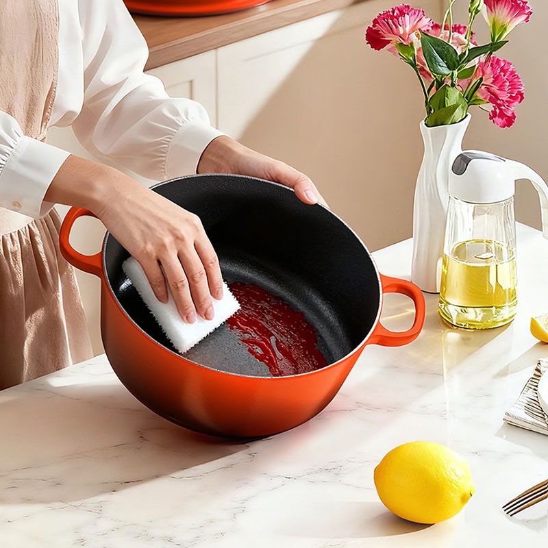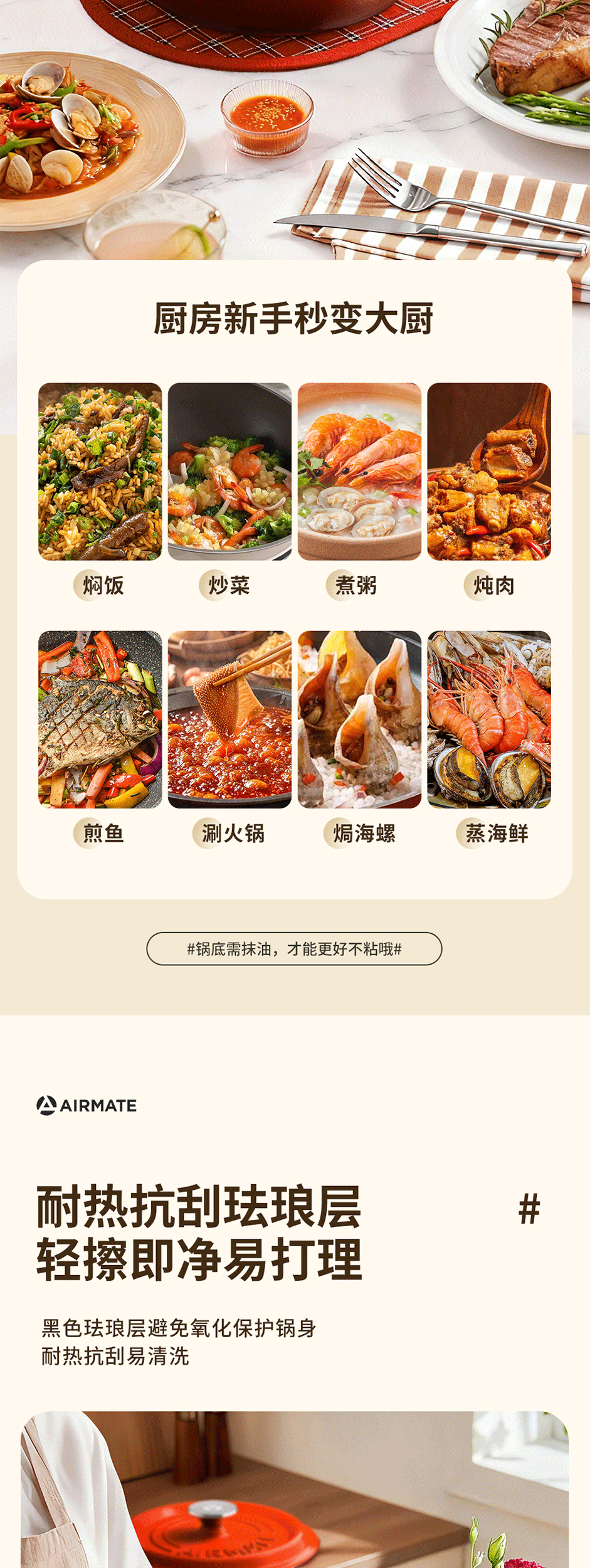 铸铁材质,受热均匀,经久耐用;可用于炖、煲、焖、煎、炒、烤等多种烹饪方式;铸铁材质,受热均匀,经久耐用