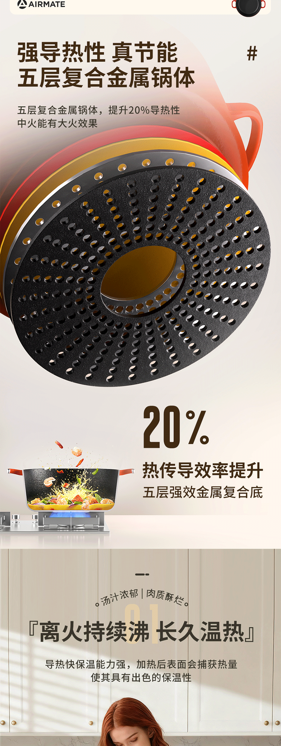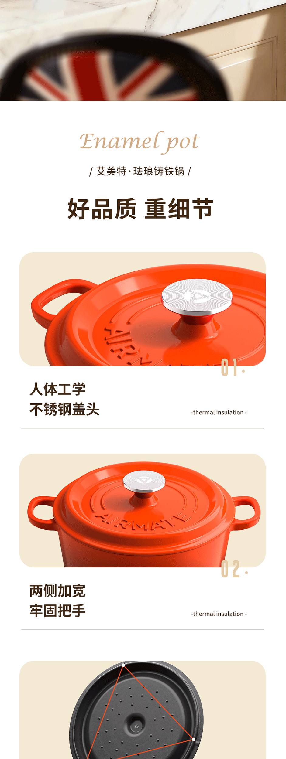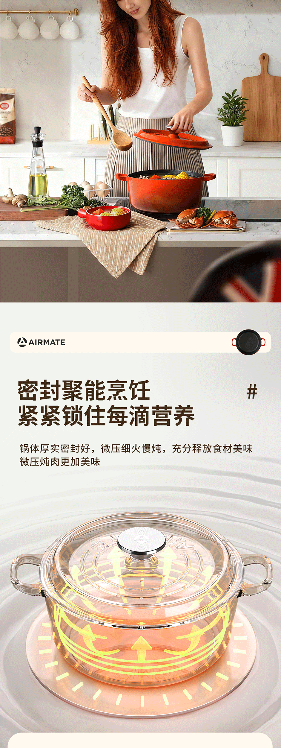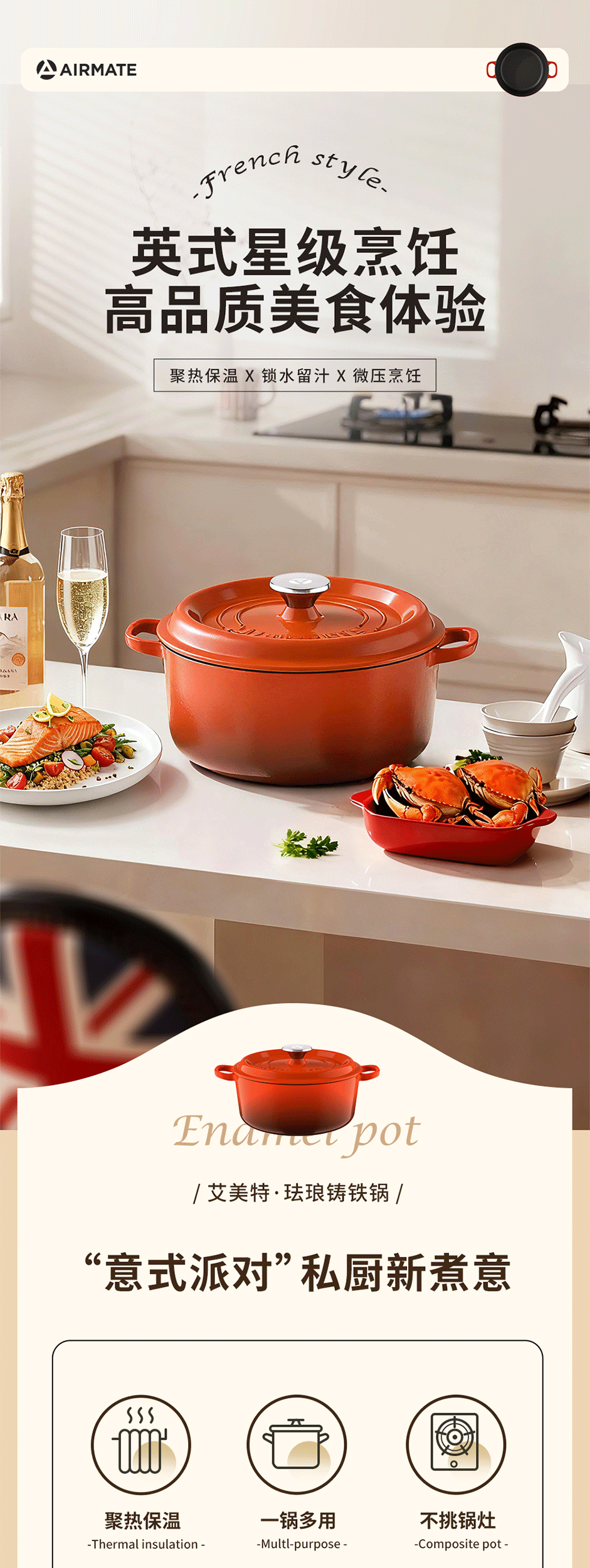 铸铁材质,受热均匀,经久耐用;可用于炖、煲、焖、煎、炒、烤等多种烹饪方式;铸铁材质,受热均匀,经久耐用