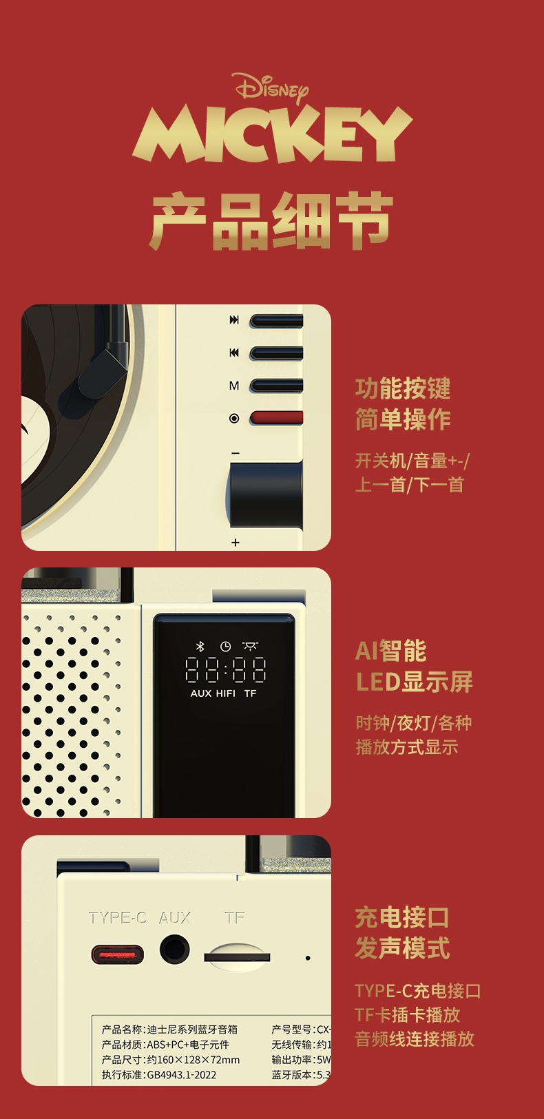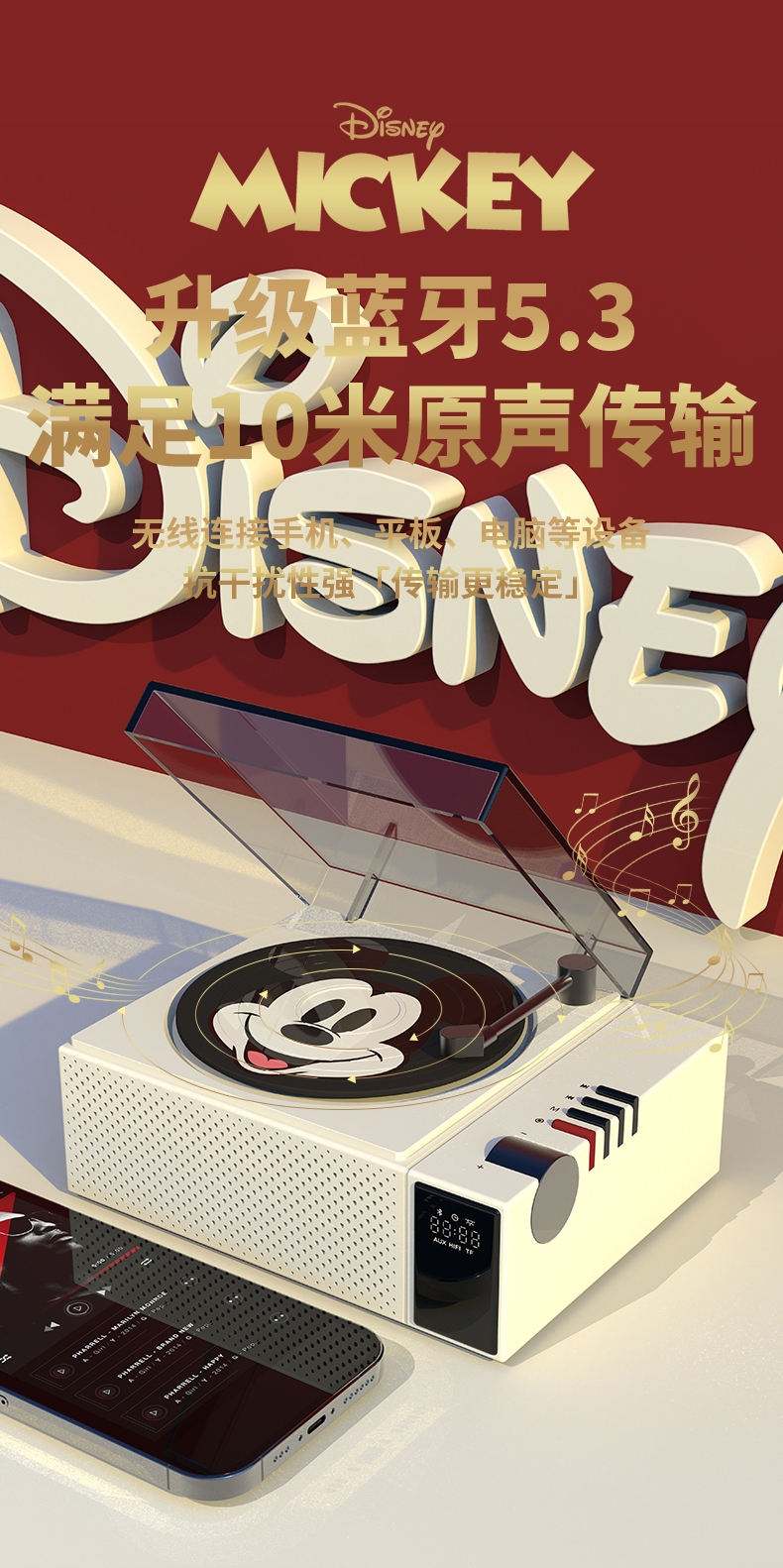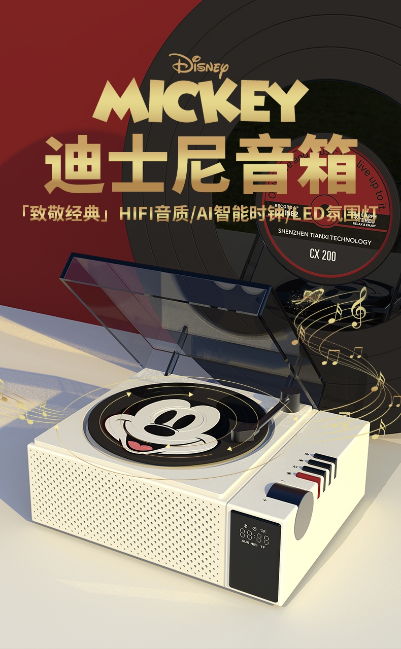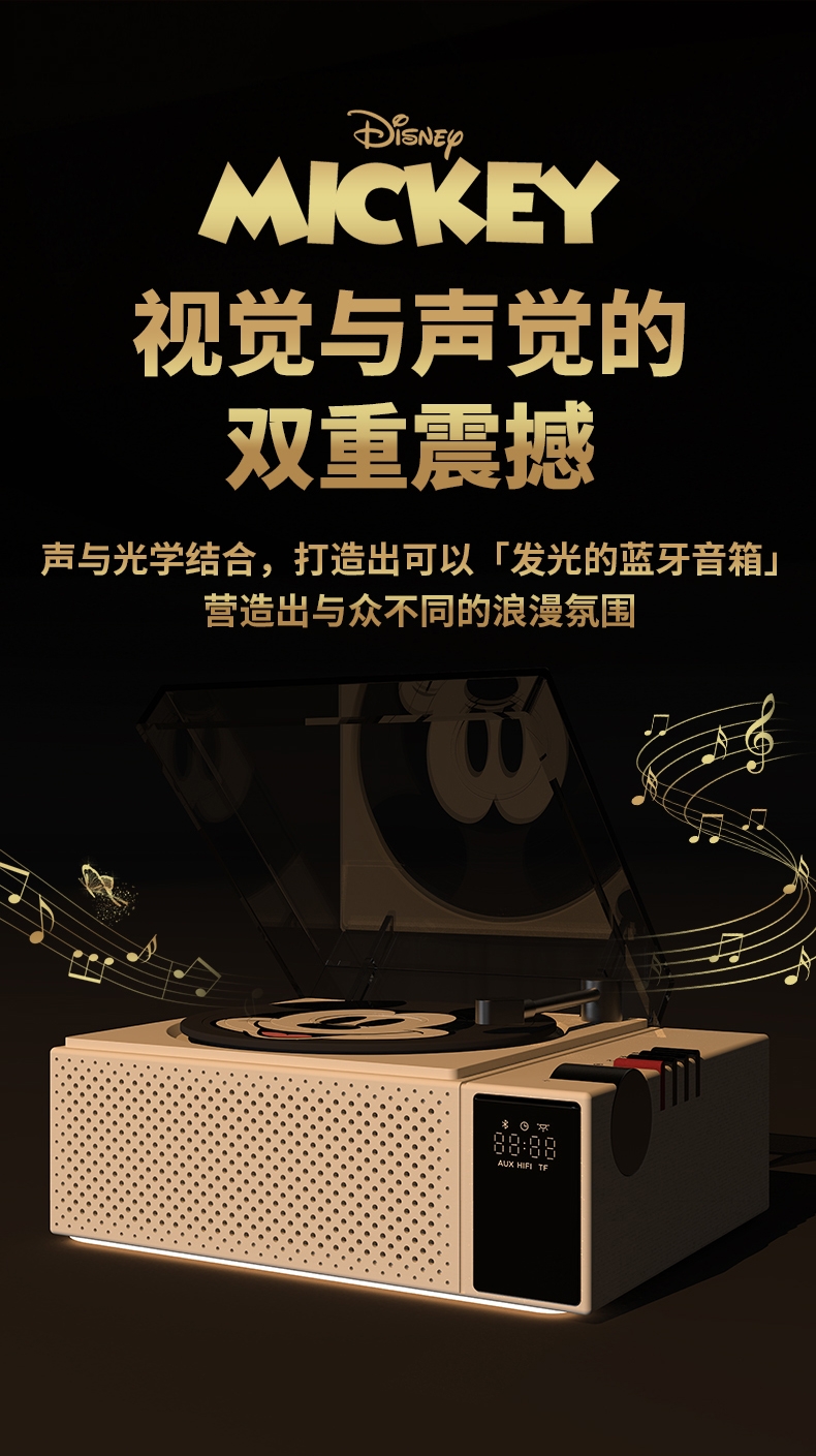 HIF音质/智能时钟显示/LED氛围灯;黑胶情怀致敬传统美学;360°高保真旋律,大师级专业调音