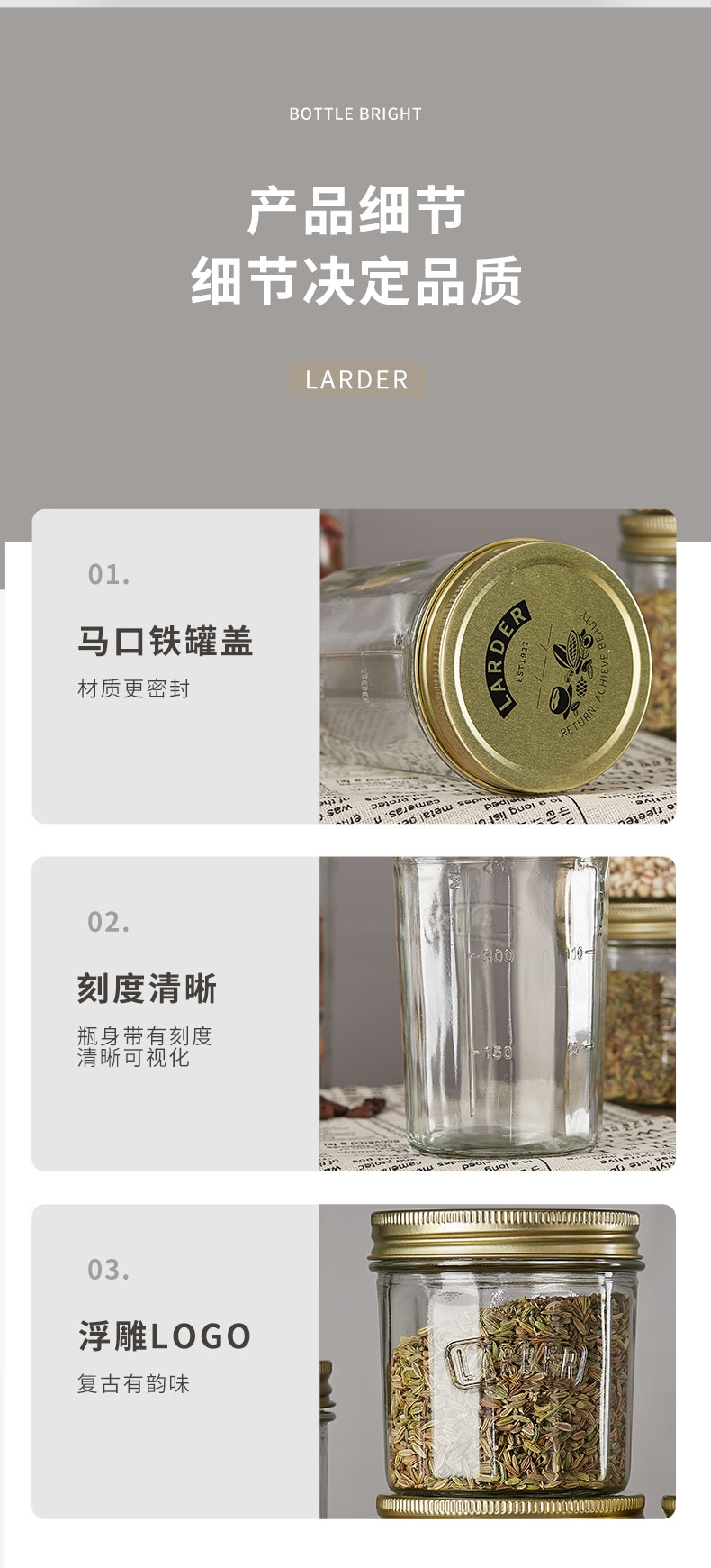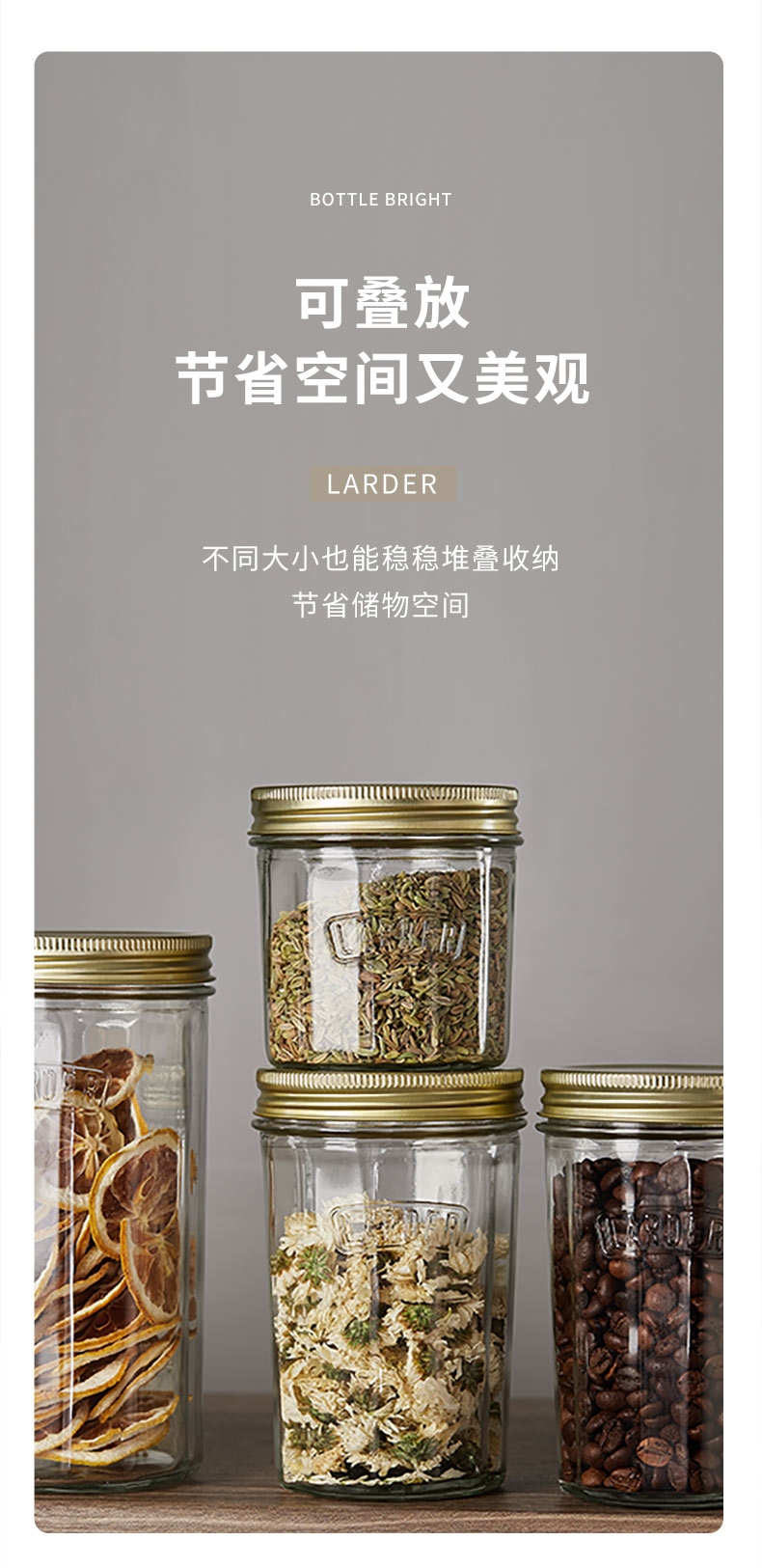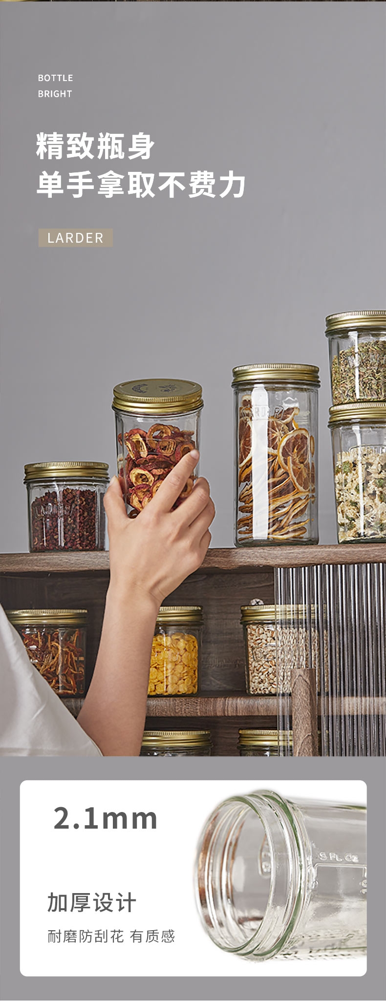 采用高透光无铅玻璃瓶身,无毒无异味;古铜色马口铁螺纹防滑盖+棱纹金属质感;三容量选择,满足厨房储物、吧台调酒