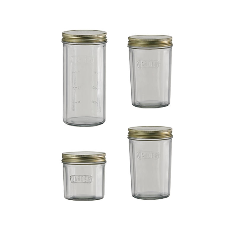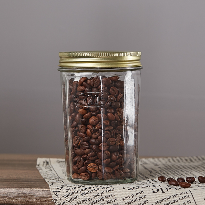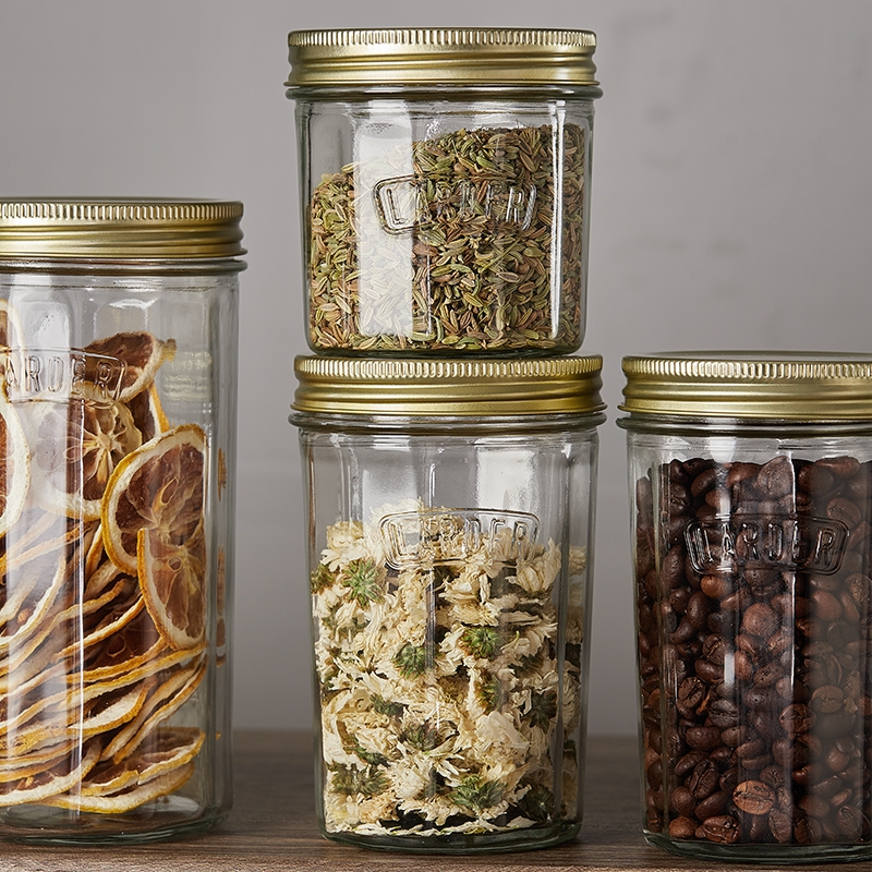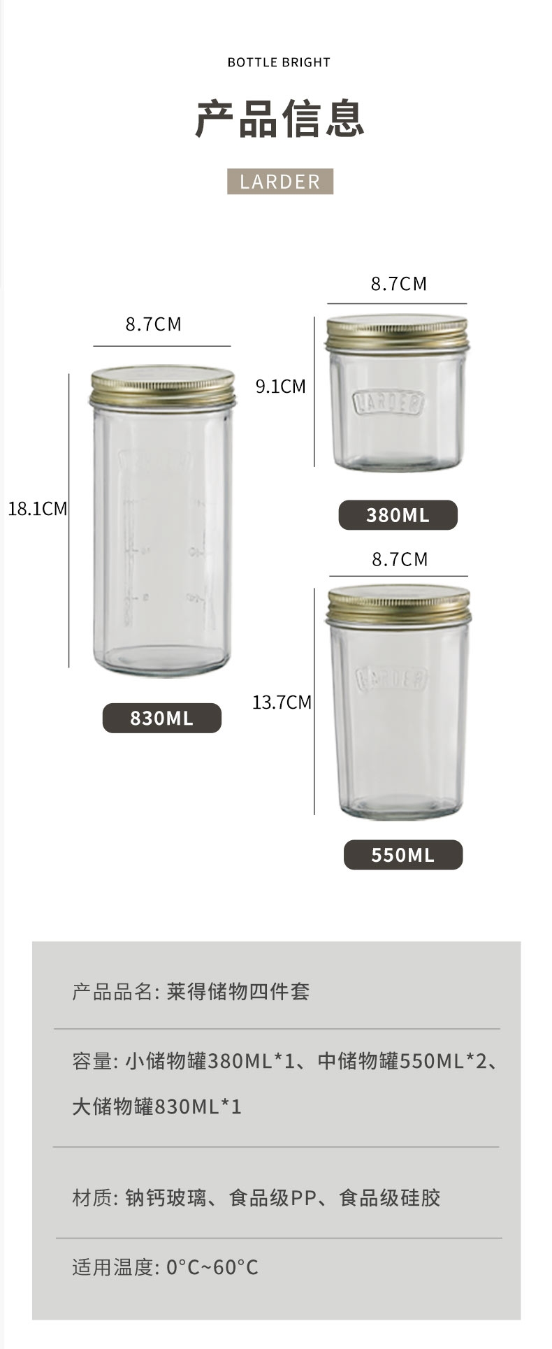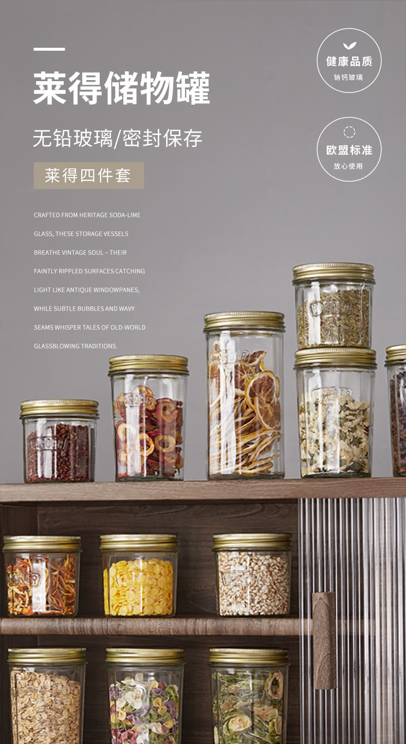 采用高透光无铅玻璃瓶身,无毒无异味;古铜色马口铁螺纹防滑盖+棱纹金属质感;三容量选择,满足厨房储物、吧台调酒