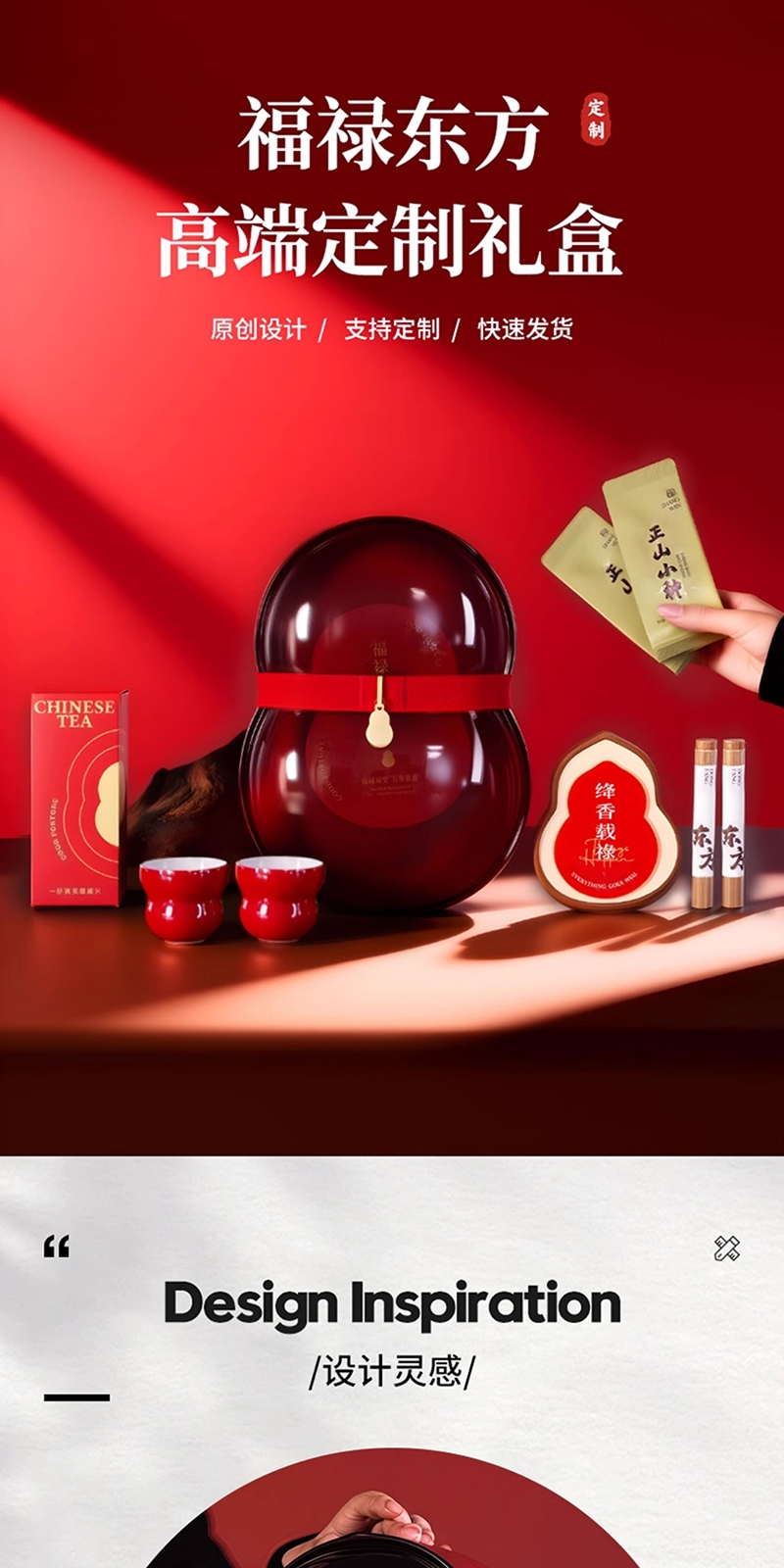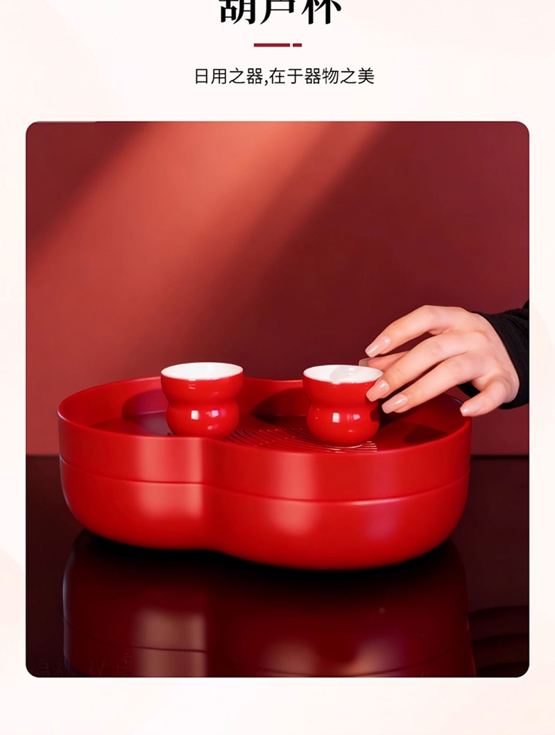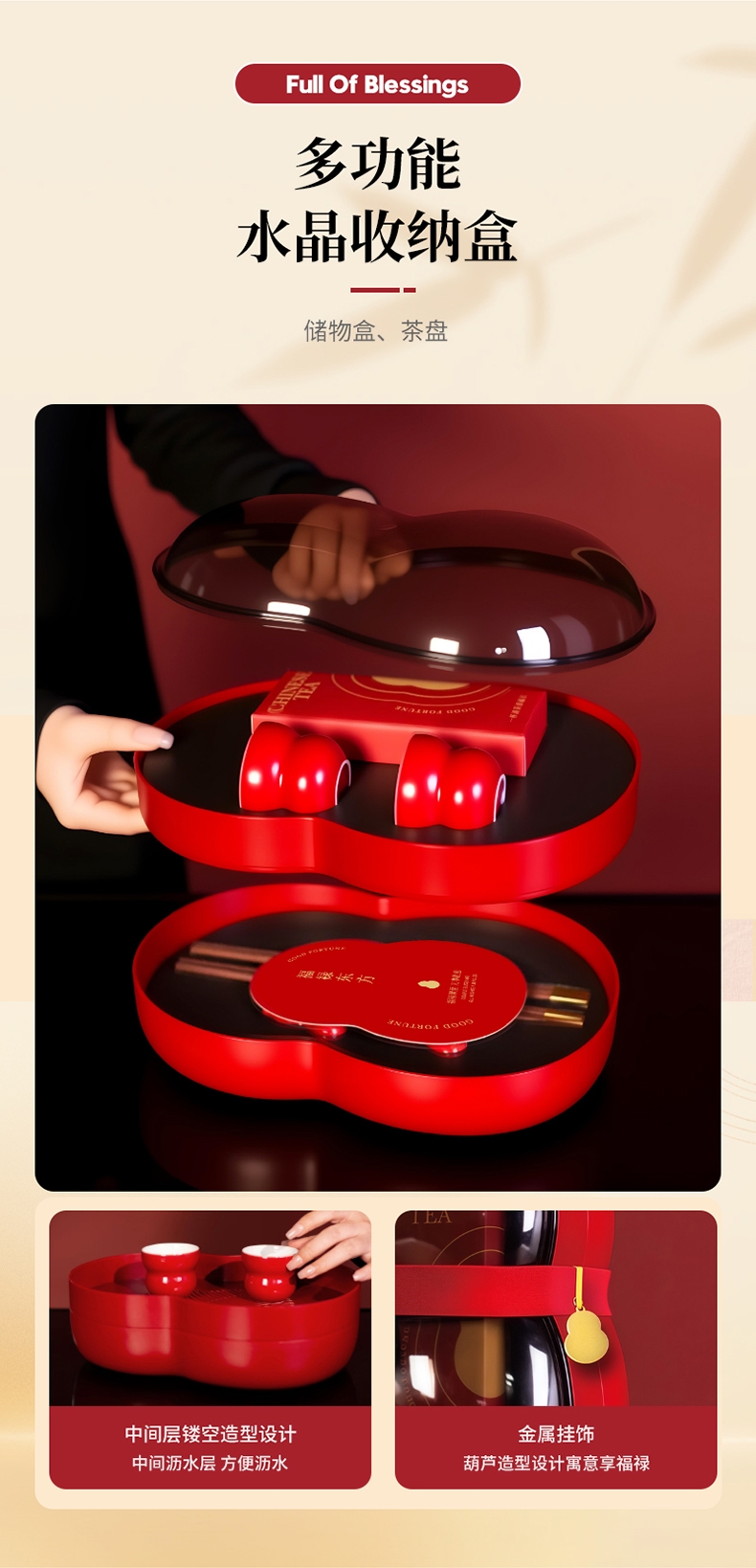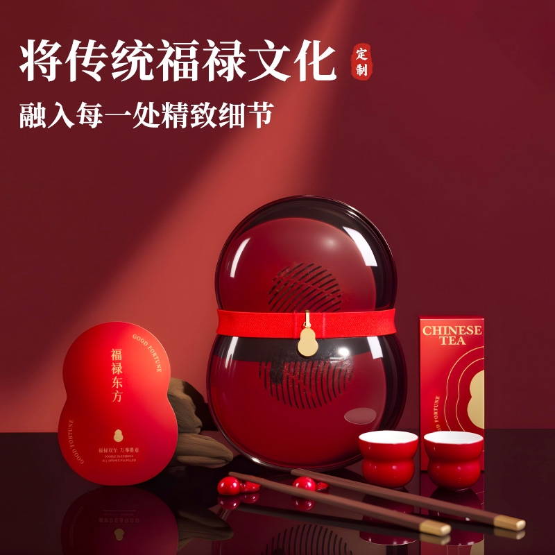 配置一:❶ 水晶收纳盒 ❷ 葫芦杯 ❸ 桐木关正山小种茶 ❹ 葫芦筷托 ❺ 红木筷 ❺ 手提袋