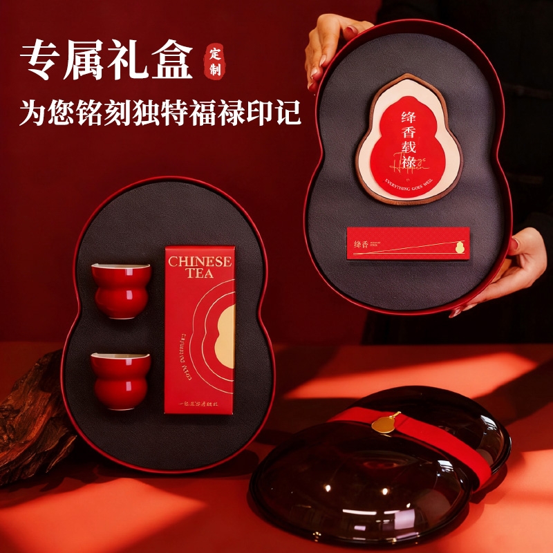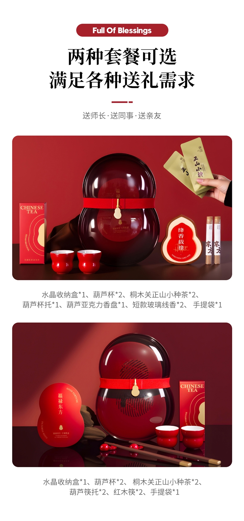 配置二:❶ 水晶收纳盒 ❷ 葫芦杯 ❸ 桐木关正山小种茶 ❹ 葫芦筷托 ❺ 葫芦亚克力香盘 ❺ 短款玻璃线香 ❻ 手提袋