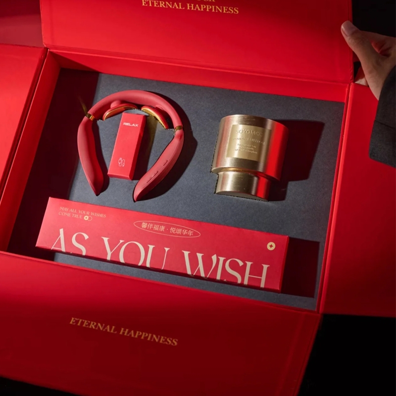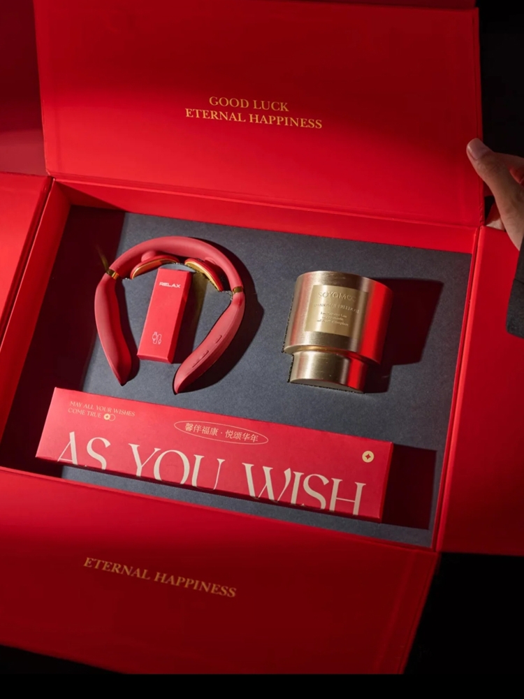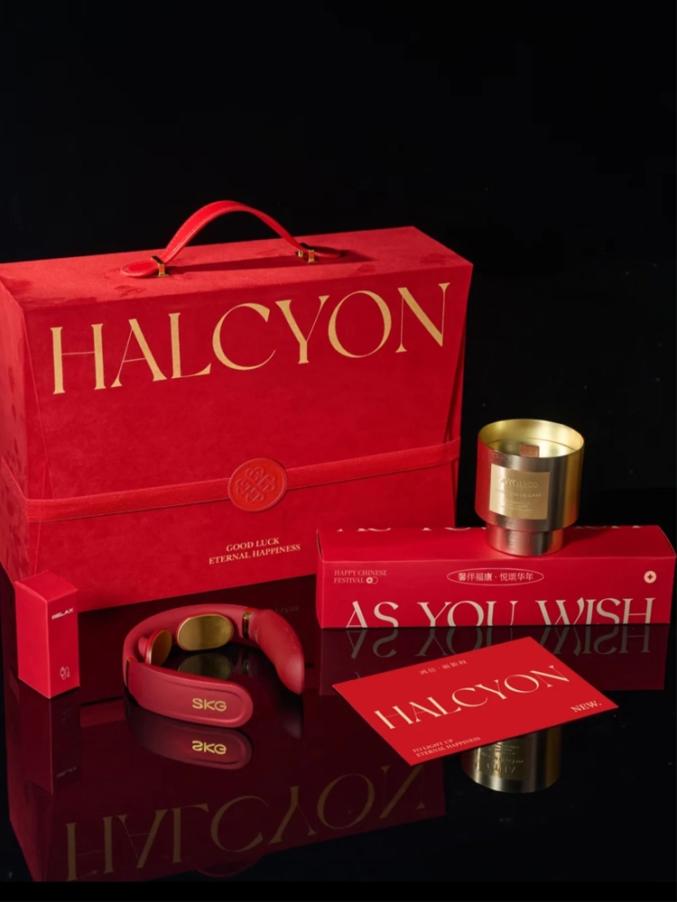 配置:❶ 麂皮绒信封礼盒 ❷ SKG颈部按摩仪 ❸ 香薰蜡烛 ❹ 对联福字