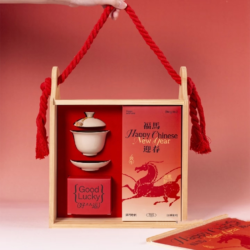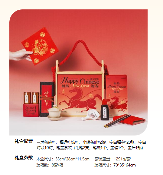 配置:三才盖碗*1、福运挂饰*1、小罐茶叶*2罐、空白福字*20张、空白对联10对、笔墨套装(毛笔2支、笔袋1个、墨蝶1个、墨汁1瓶)