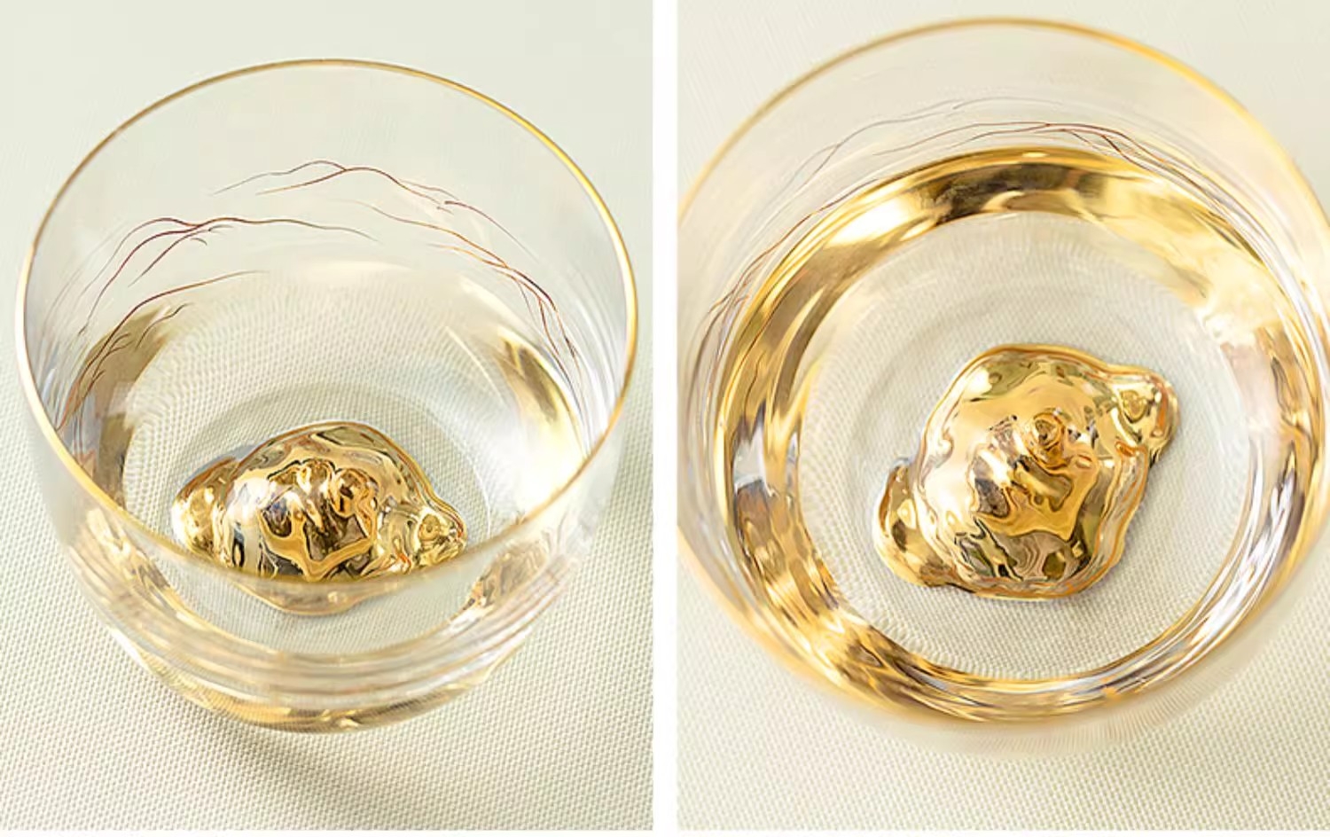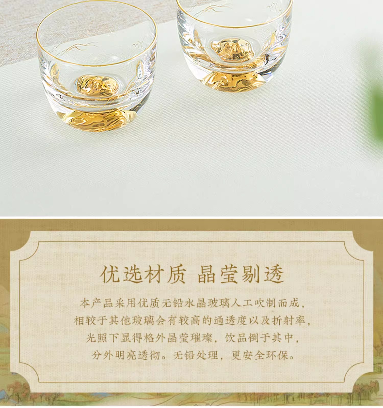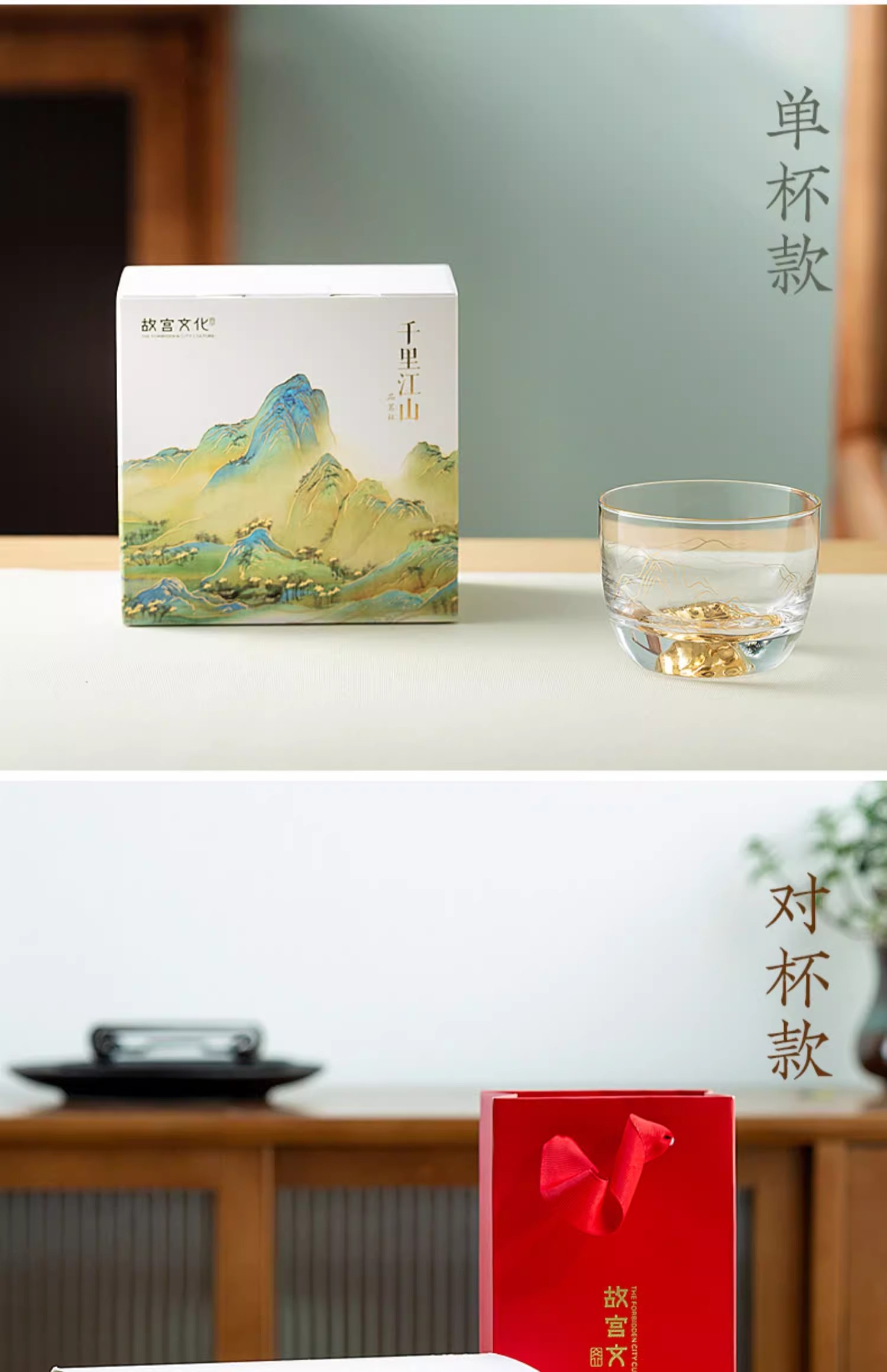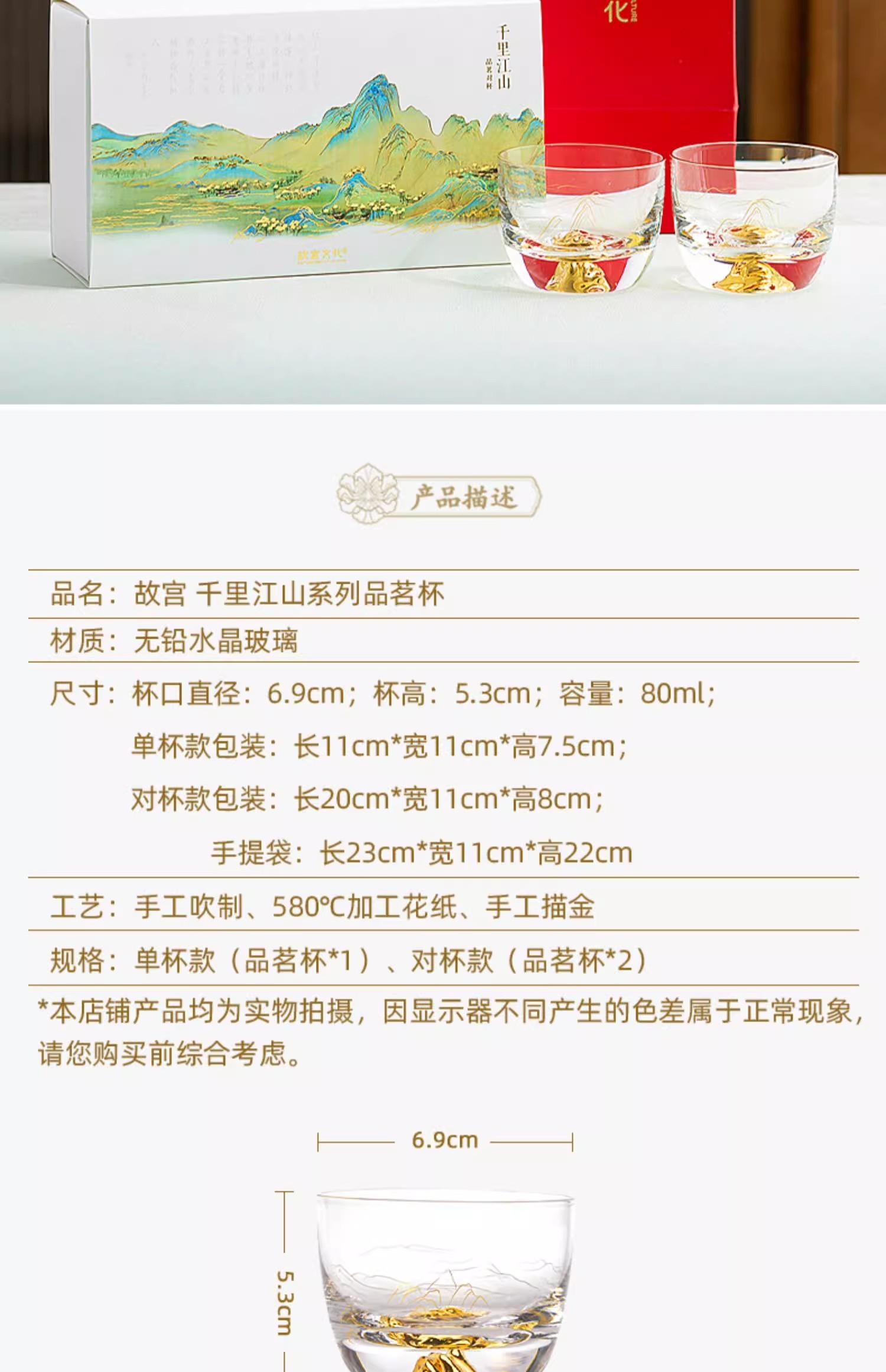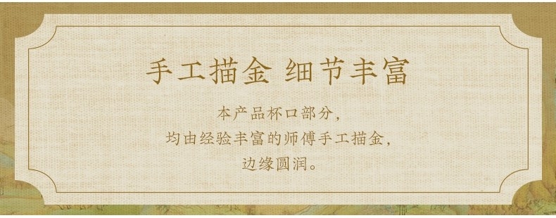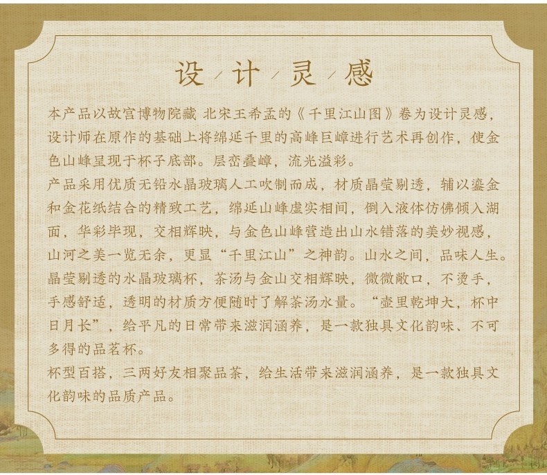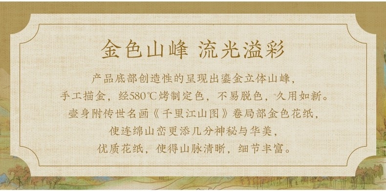 手工描金 立体山峰 千里江山 金花纸;手工吹制、580℃加工定色 不易脱色,久用如新, ;大气有度 心意之选