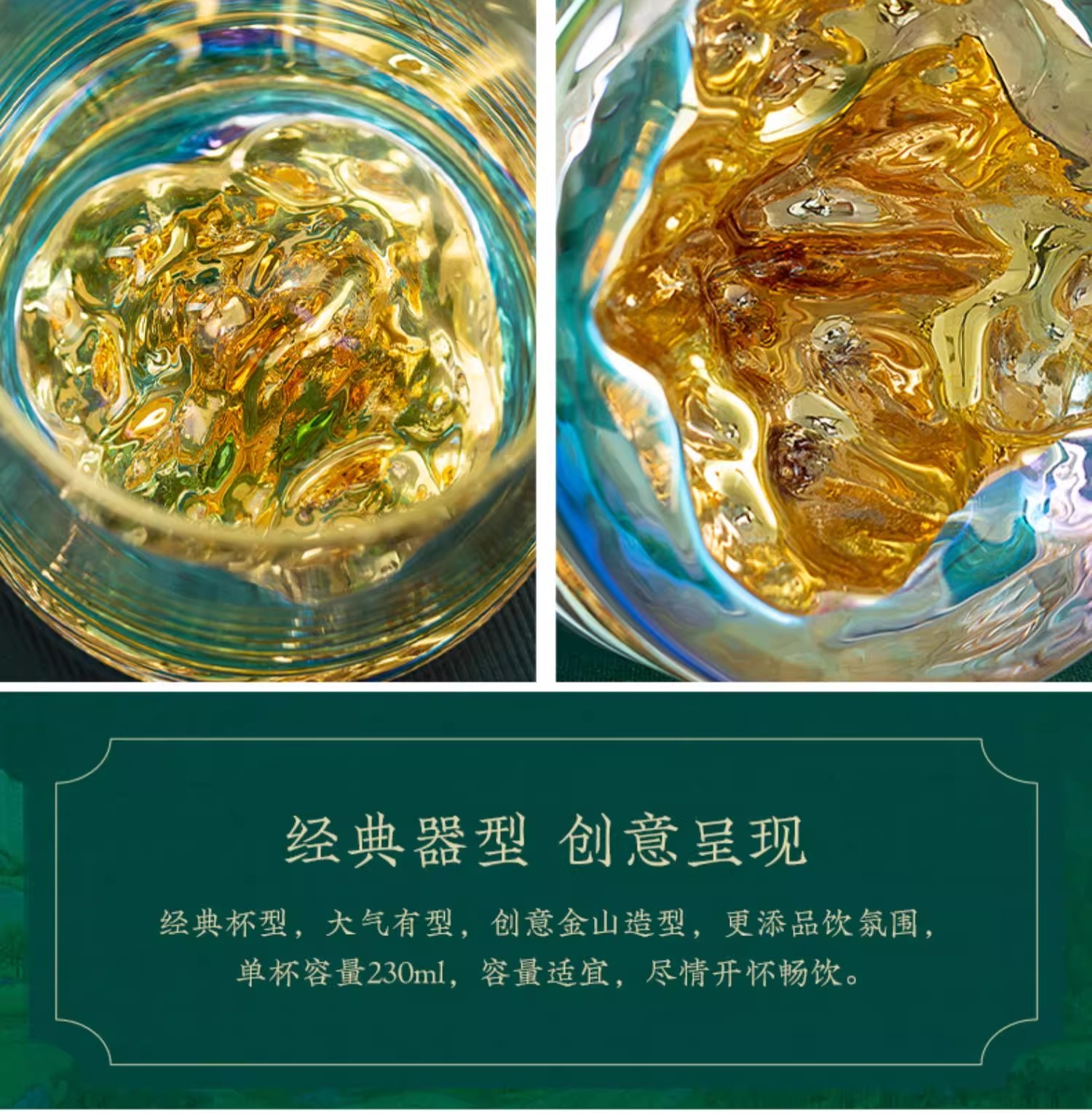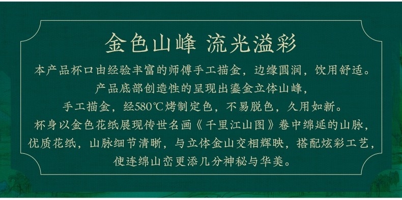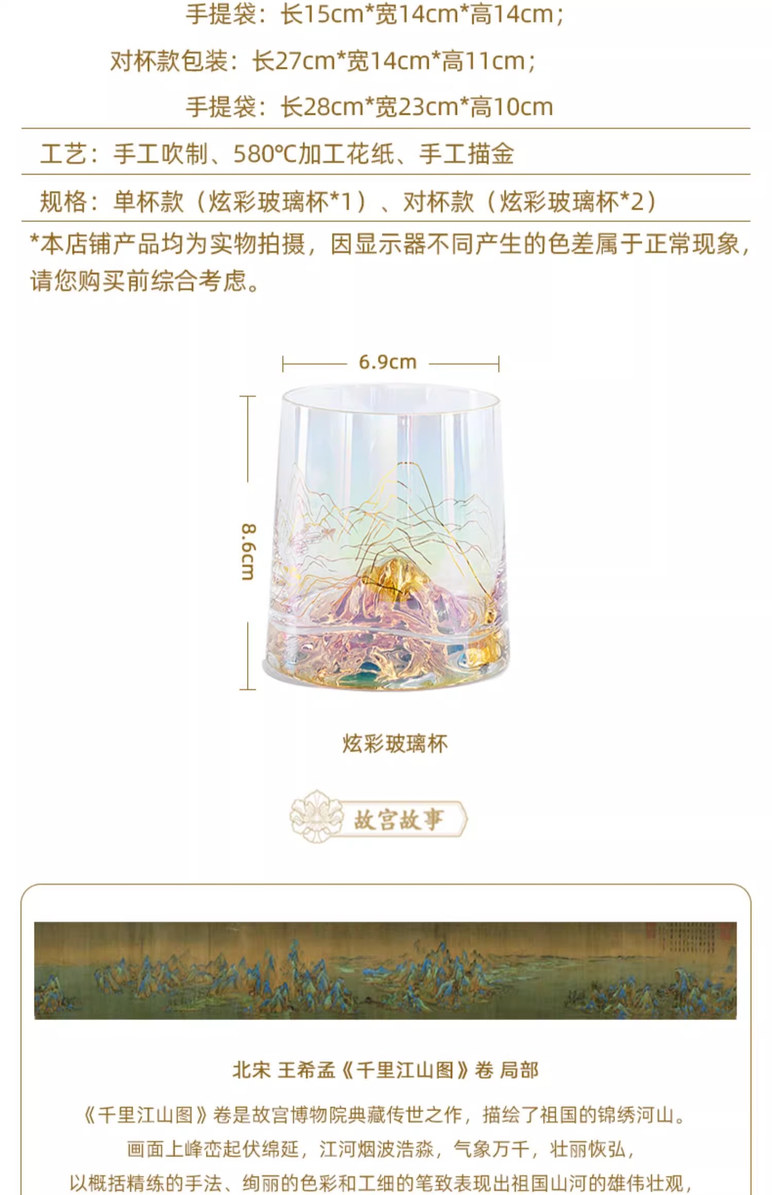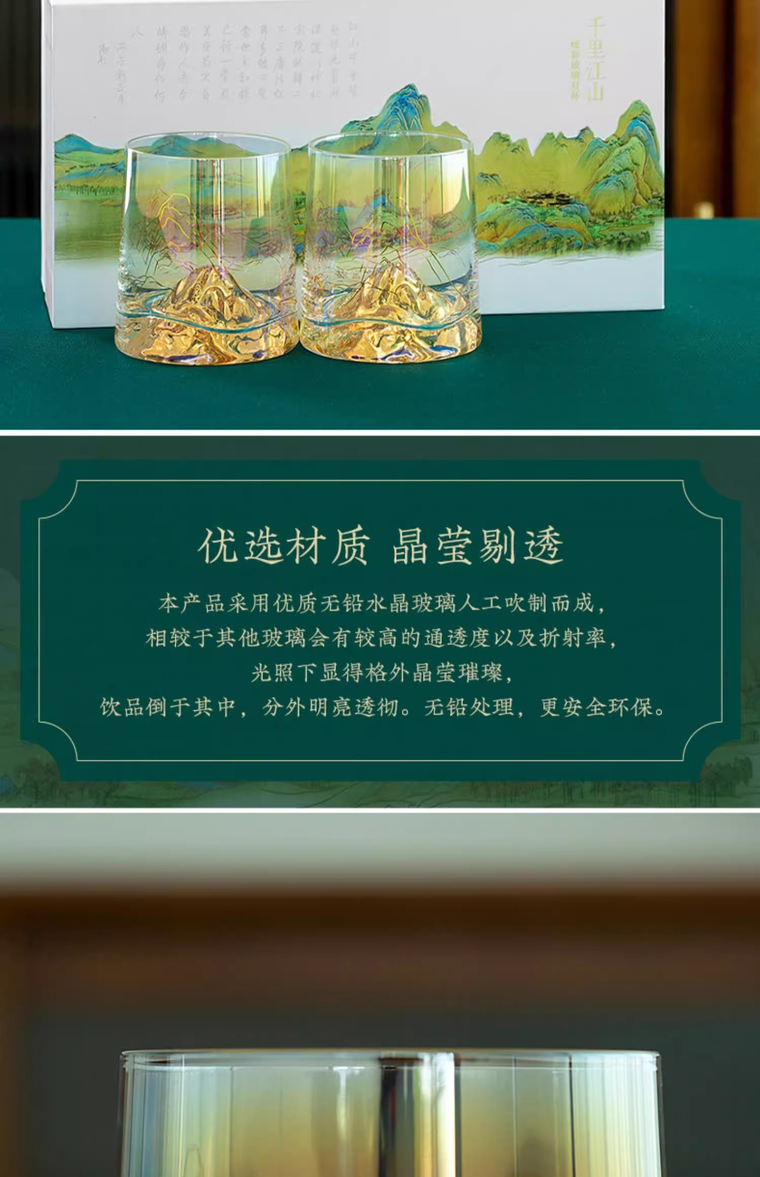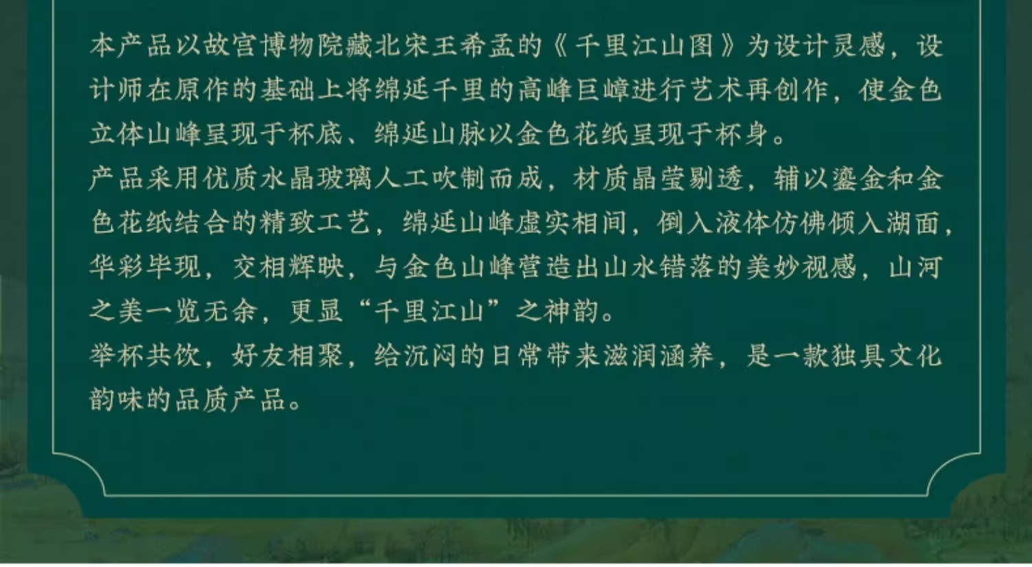 全手工吹制 全手工描金;K金+无铅水晶玻璃 手绘刻版《千里江山图》真金花纸;手工吹制、580℃加工定色 不易脱色,久用如新