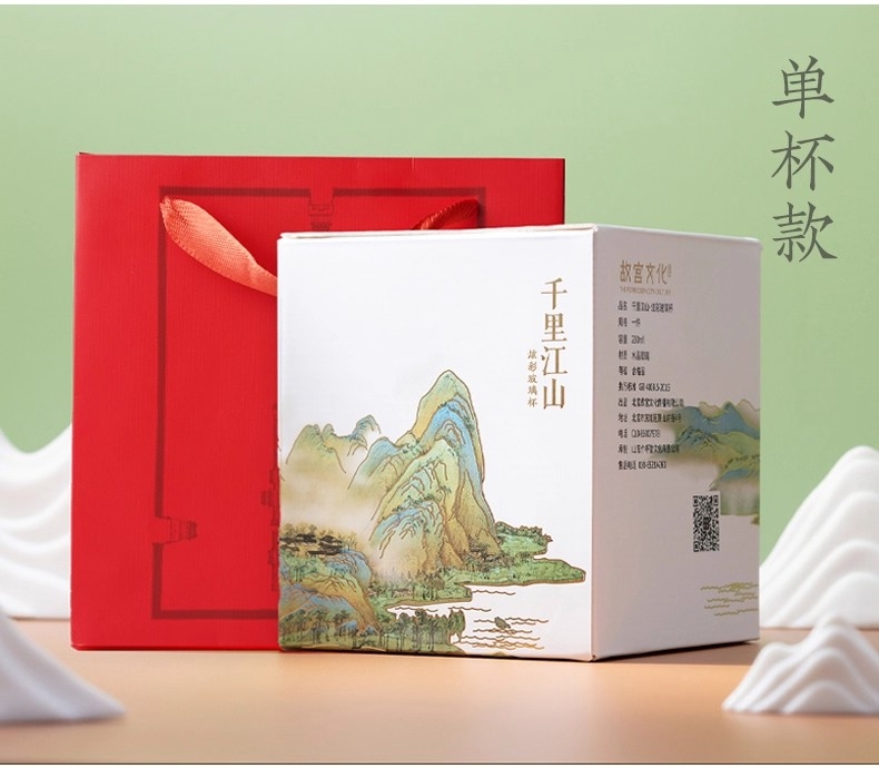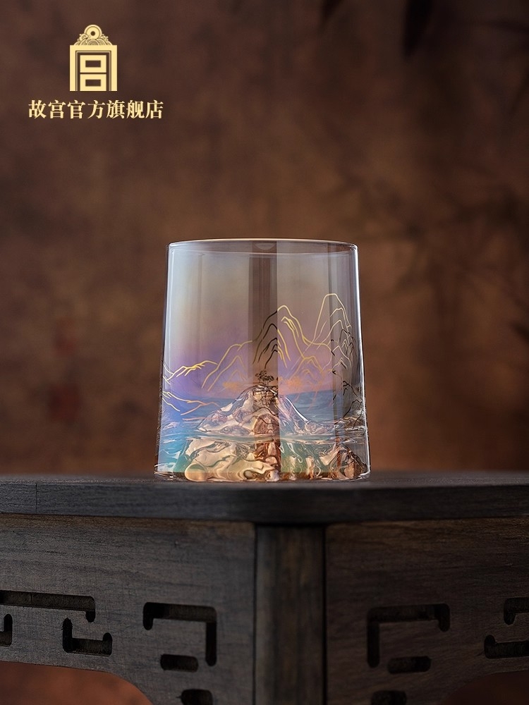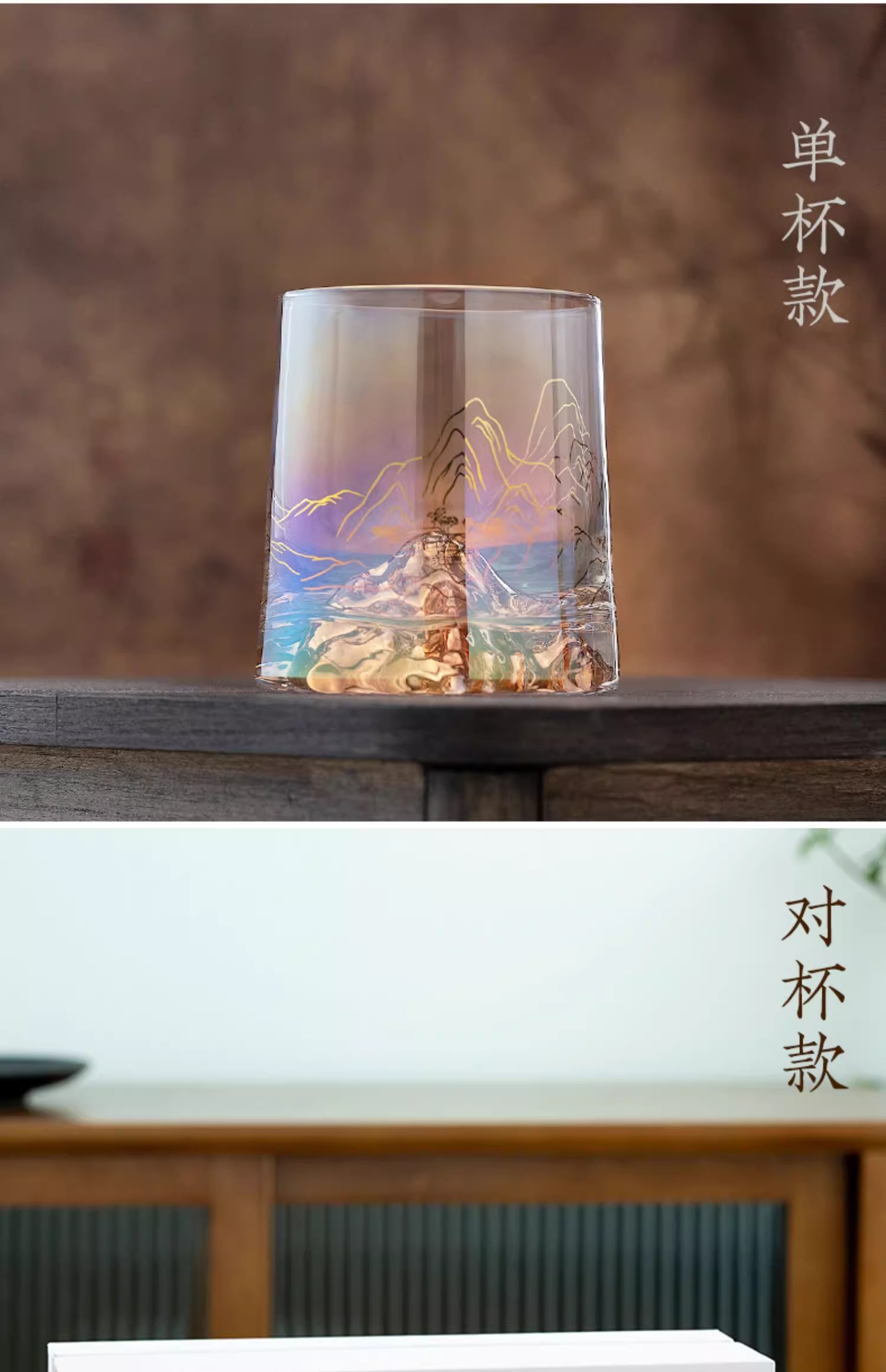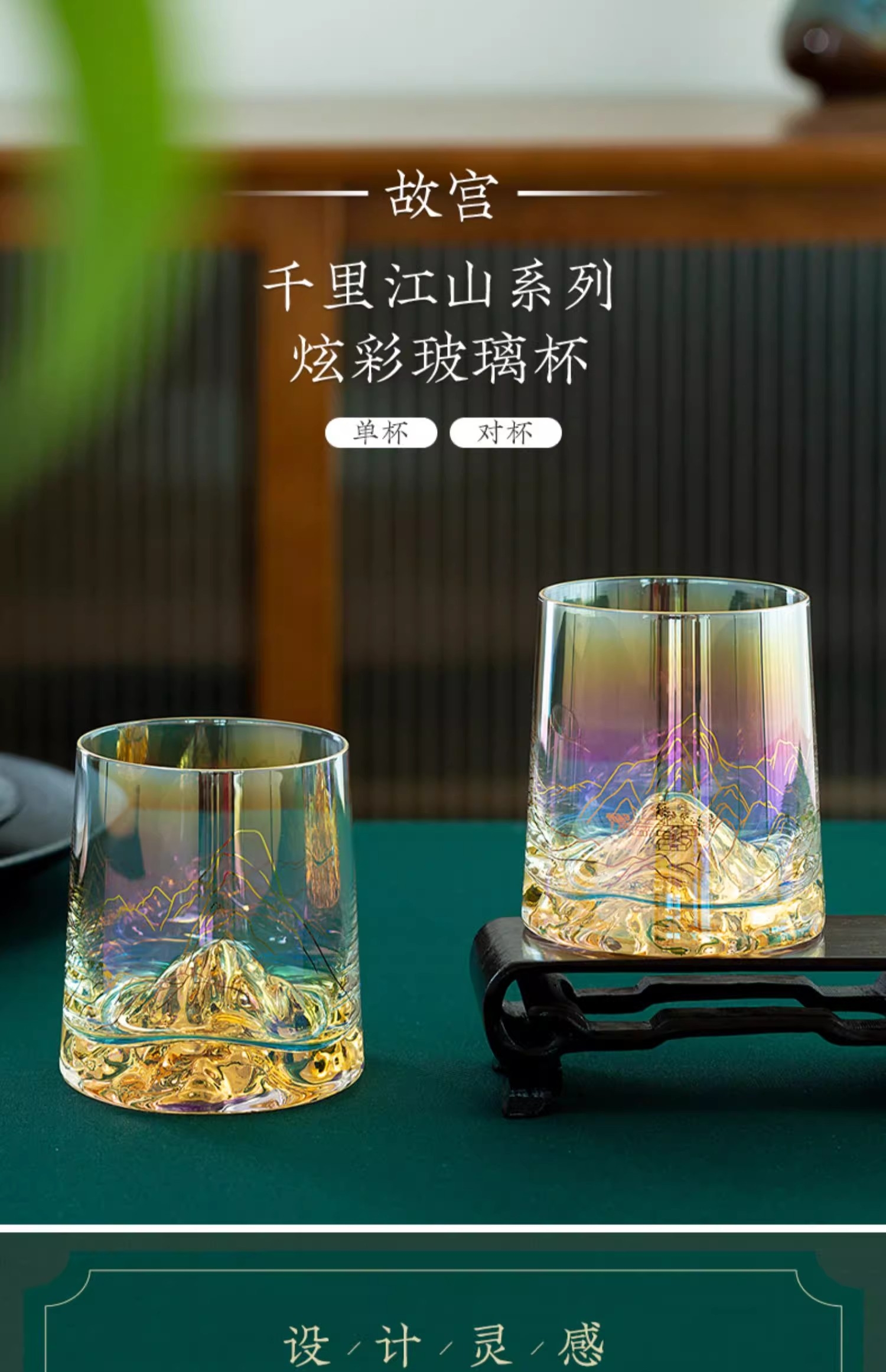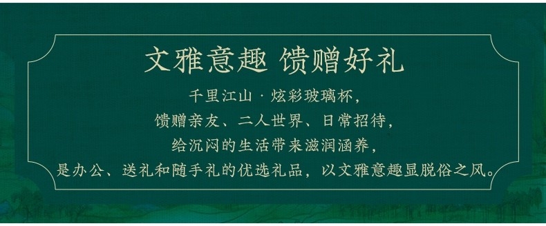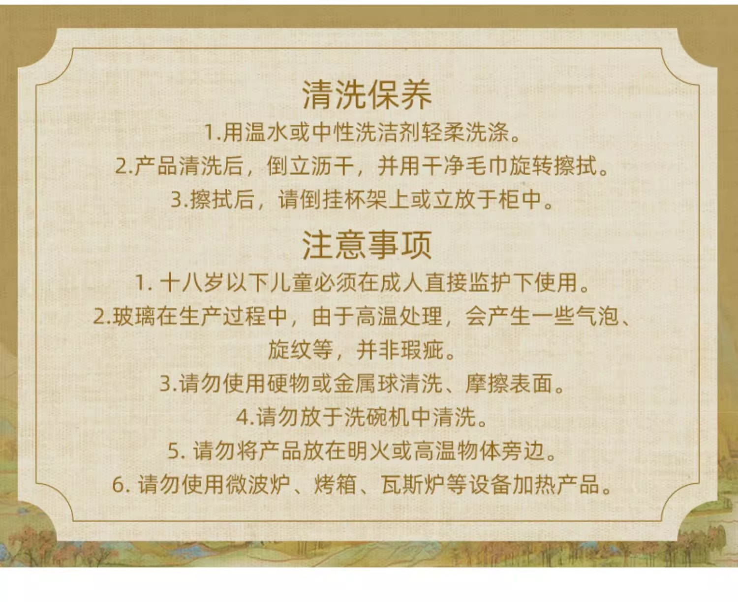 全手工吹制 全手工描金;K金+无铅水晶玻璃 手绘刻版《千里江山图》真金花纸;手工吹制、580℃加工定色 不易脱色,久用如新
