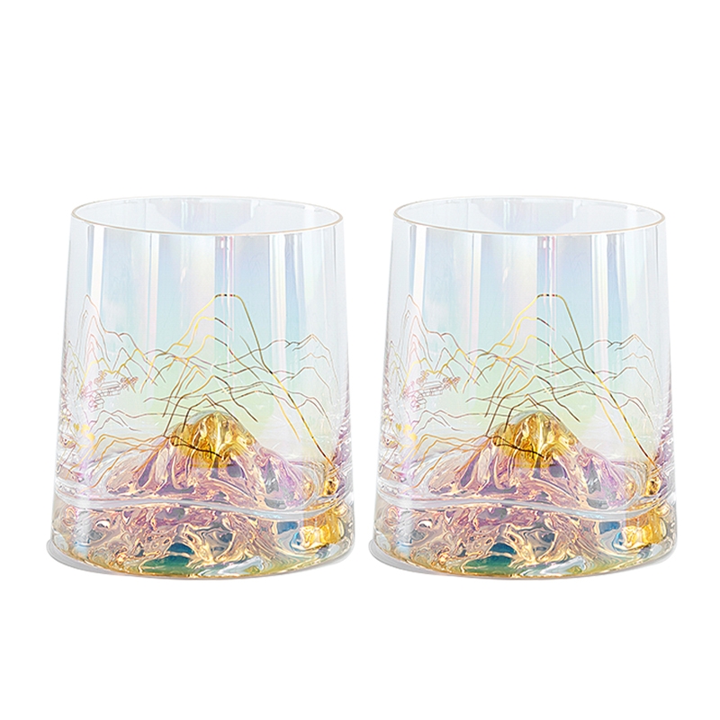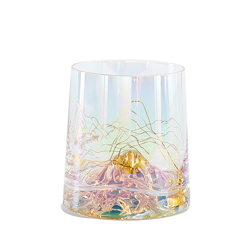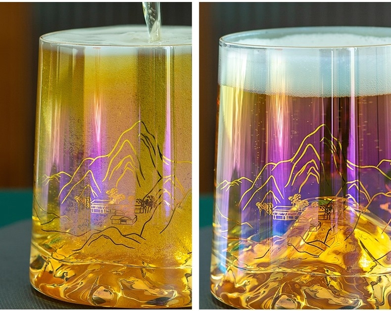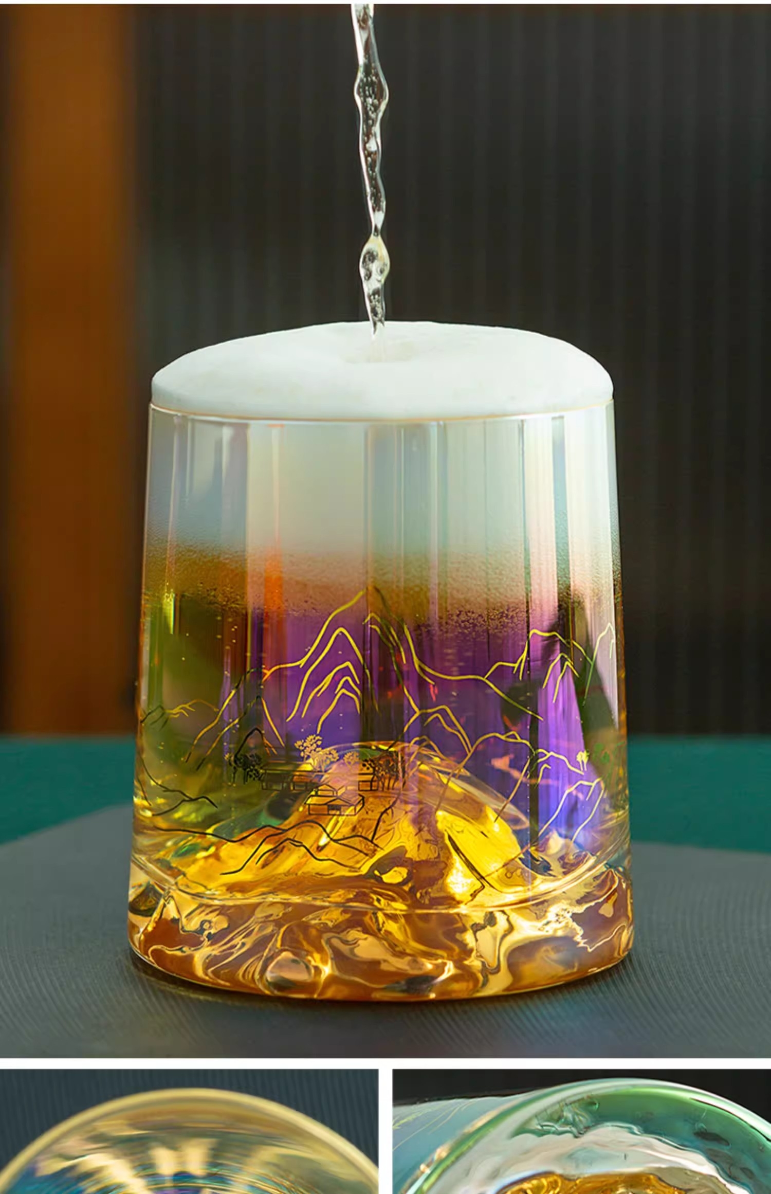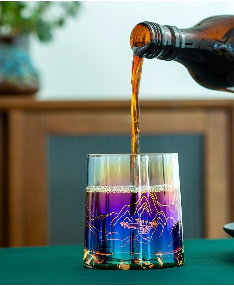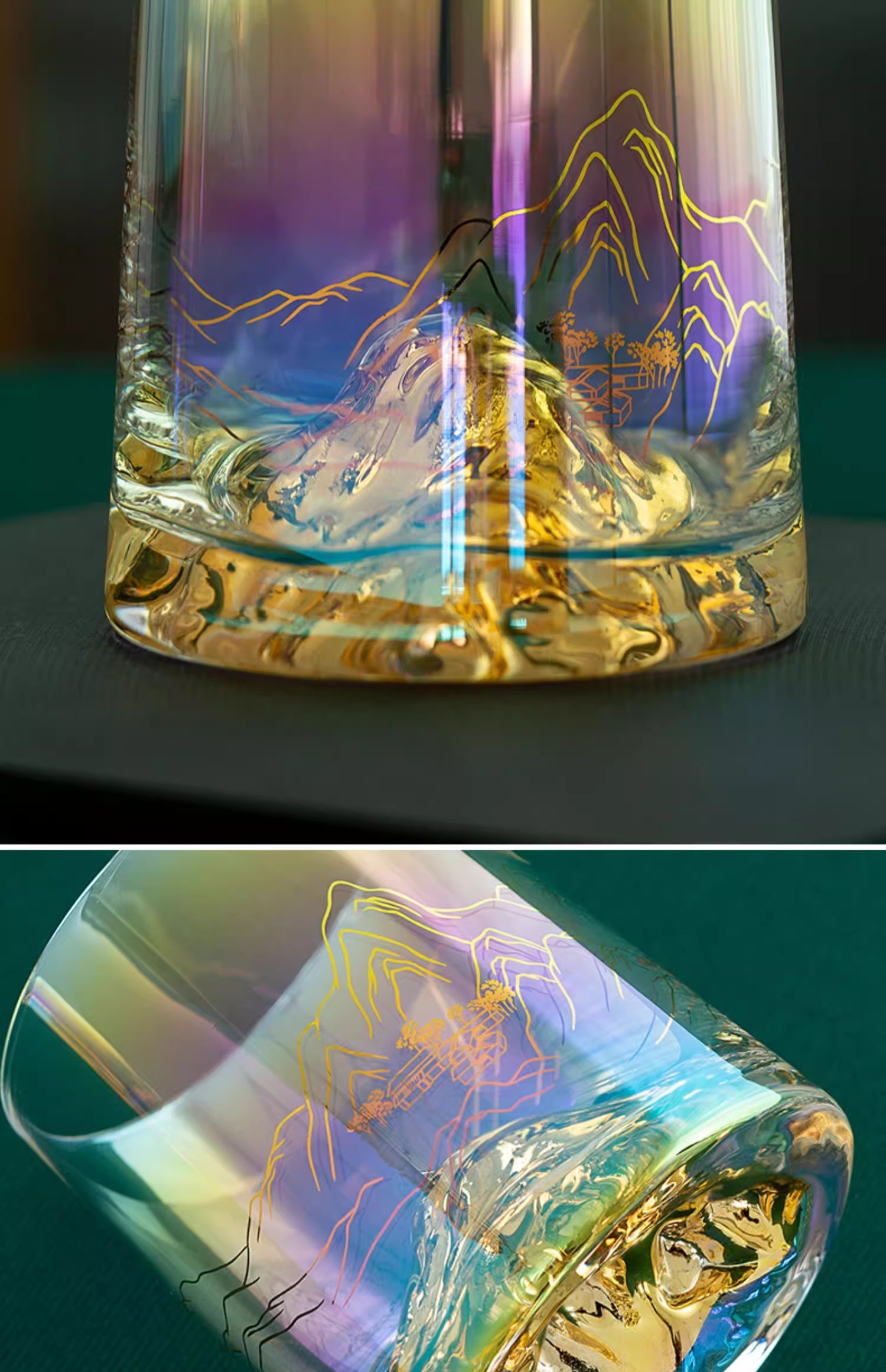 全手工吹制 全手工描金;K金+无铅水晶玻璃 手绘刻版《千里江山图》真金花纸;手工吹制、580℃加工定色 不易脱色,久用如新