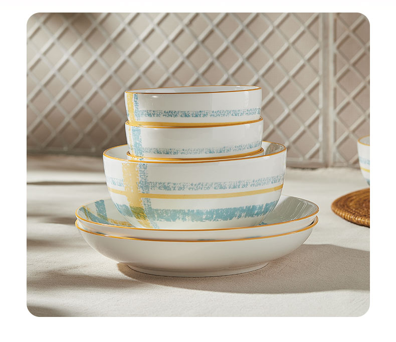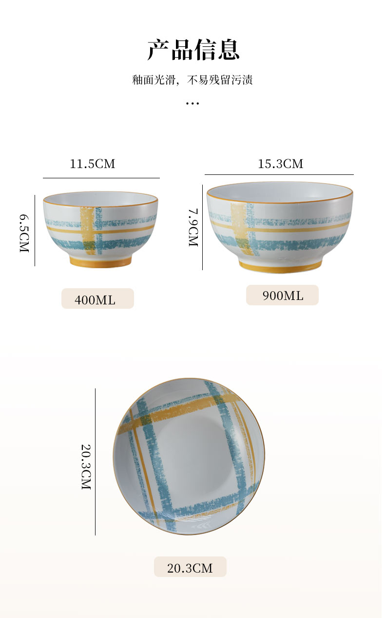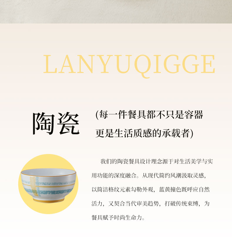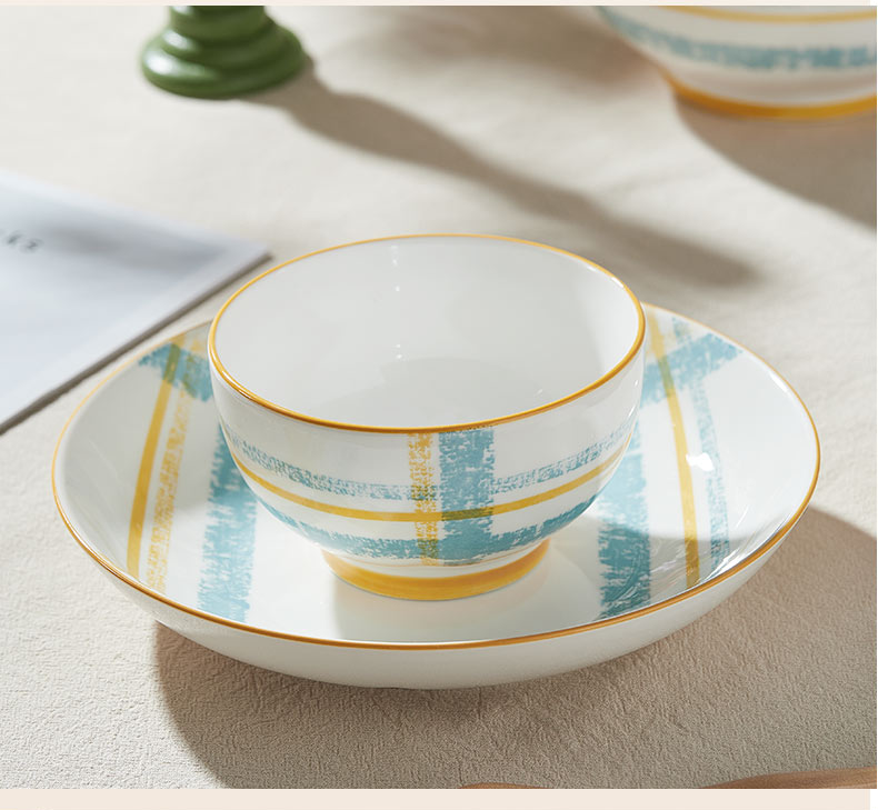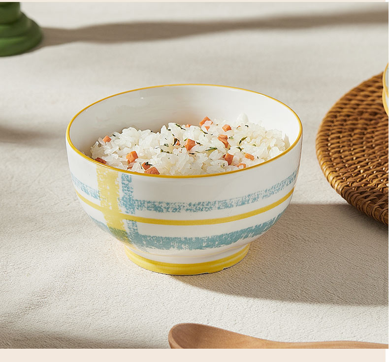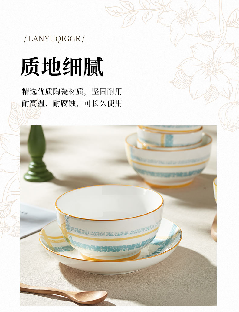 厚实瓷质,隔热防烫,外观色彩清新、光洁透亮;釉面光滑细腻,久用不褪色,釉下彩工艺;描边碗沿,田园复古风格,底部不上釉防滑设计