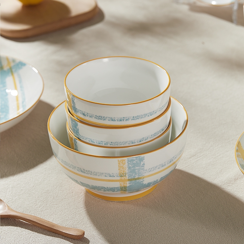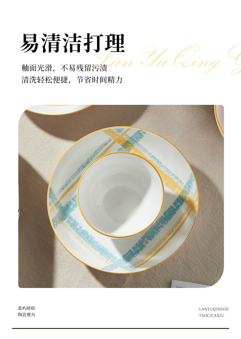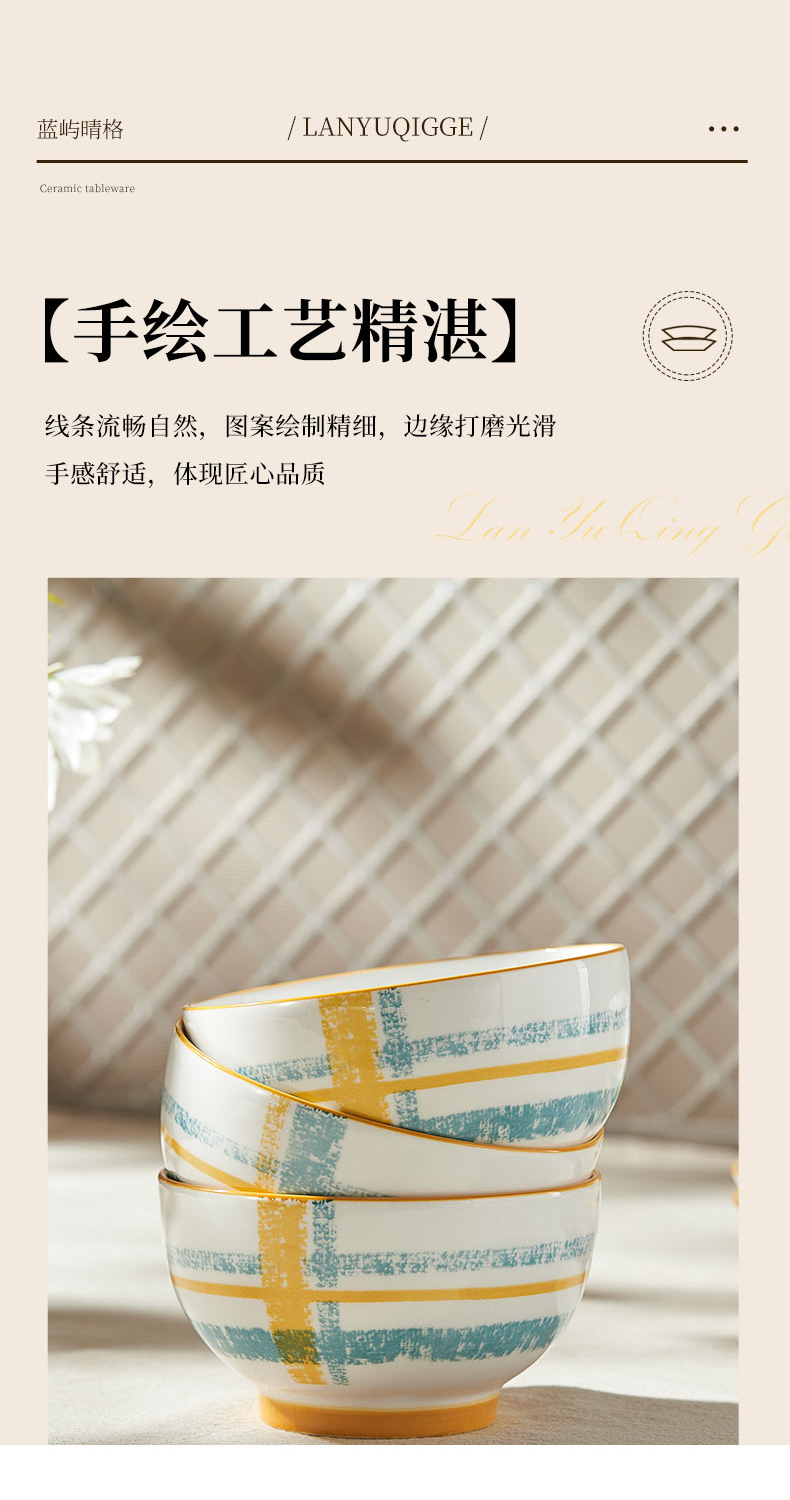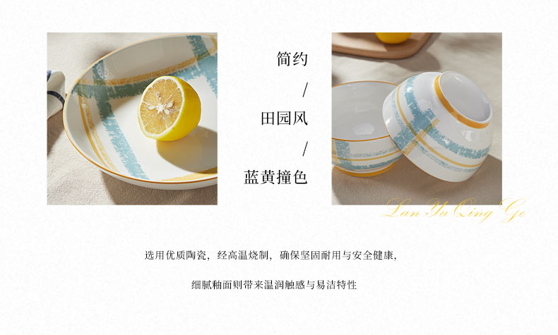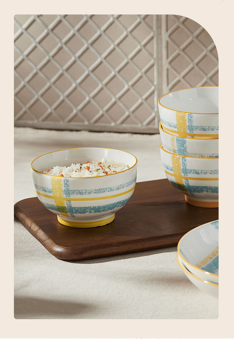 厚实瓷质,隔热防烫,外观色彩清新、光洁透亮;釉面光滑细腻,久用不褪色,釉下彩工艺;描边碗沿,田园复古风格,底部不上釉防滑设计