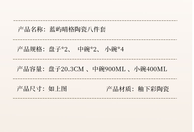 配置清单:4.5英寸小碗*4、6英寸中碗*2、8英寸盘子*2
