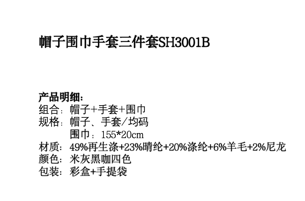 规格:帽子、手套/均码 围巾:155*20cm